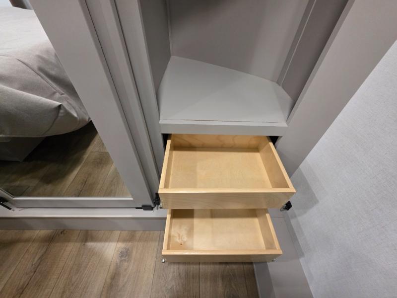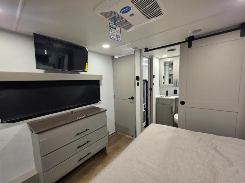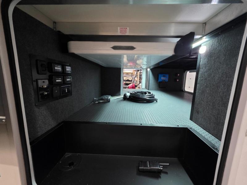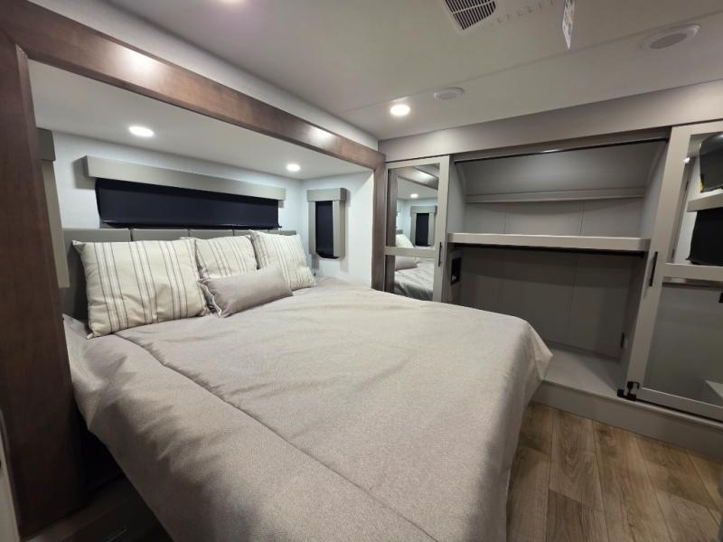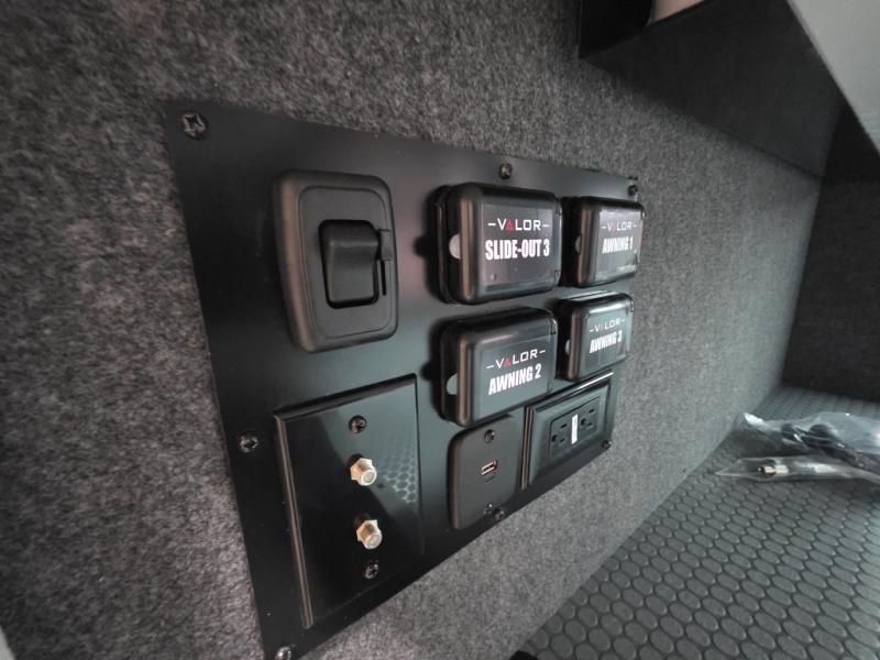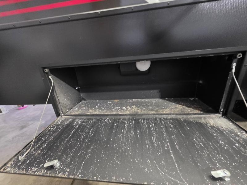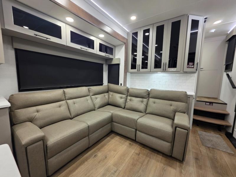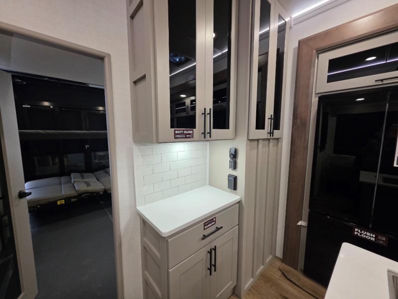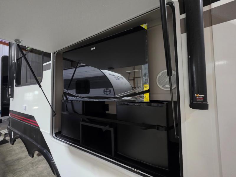 You can bring your toys with you wherever you go with any one of these Alliance RV Valor toy hauler fifth wheels! They are adventure-ready with a quality build from the walk on roof with seamless PVC roof covering to the commercial grade vinyl flooring and MorRyde CRE3000 suspension system. The Performance Running Gear package comes with a 101" wide-body benchmark chassis platform, 7,000 lb. Dexter axles, and a space enhancing drop frame storage compartment to pack in all your riding gear. You can even go off-gridding thanks to the Off the Grid Pack that has two 400-watt solar panels, generator prep, a 60-amp charge controller, and a 100-amp hour lithium iron phosphate battery. Some of the interior comforts you will enjoy are the hardwood cabinet doors and drawers, solid surface kitchen countertops, and commercial grade vinyl flooring with no carpet to make clean up a breeze. The Valor toy haulers are also the Masters of 12 Volt with USB charging station throughout, a 12V refrigerator, and more 12-volt features to make camping hassle-free!