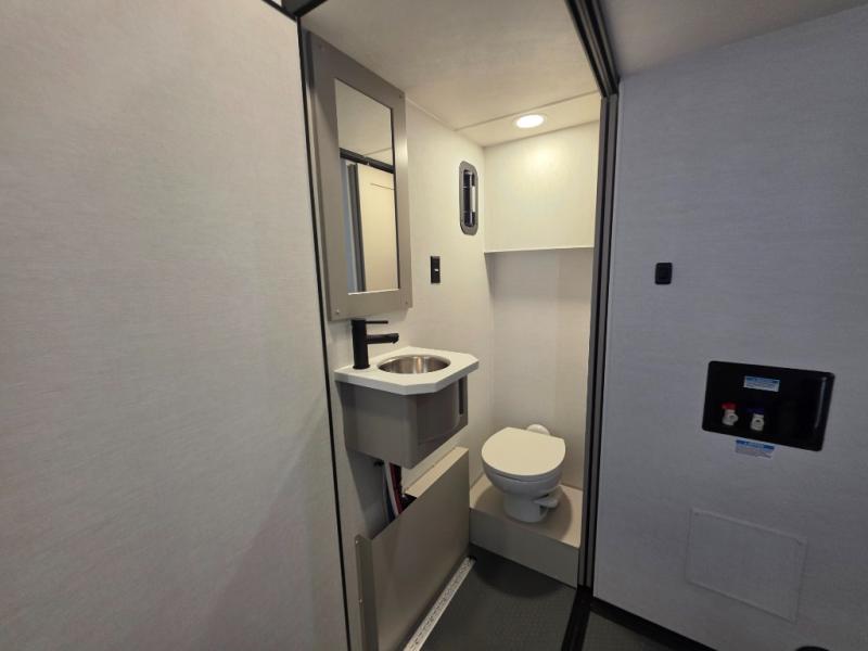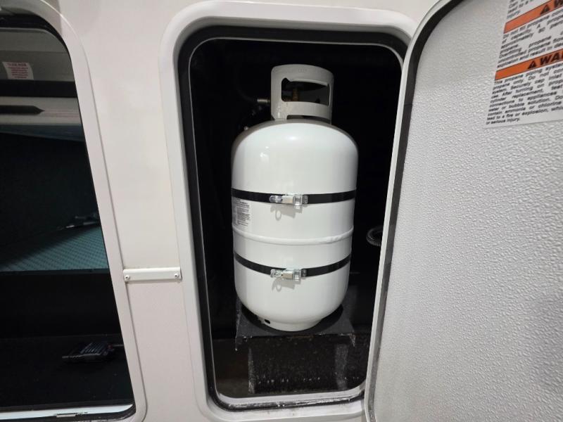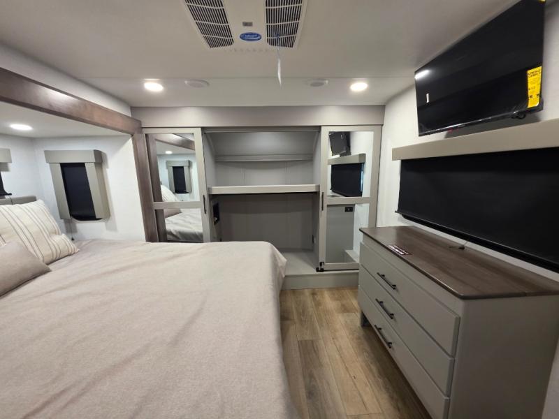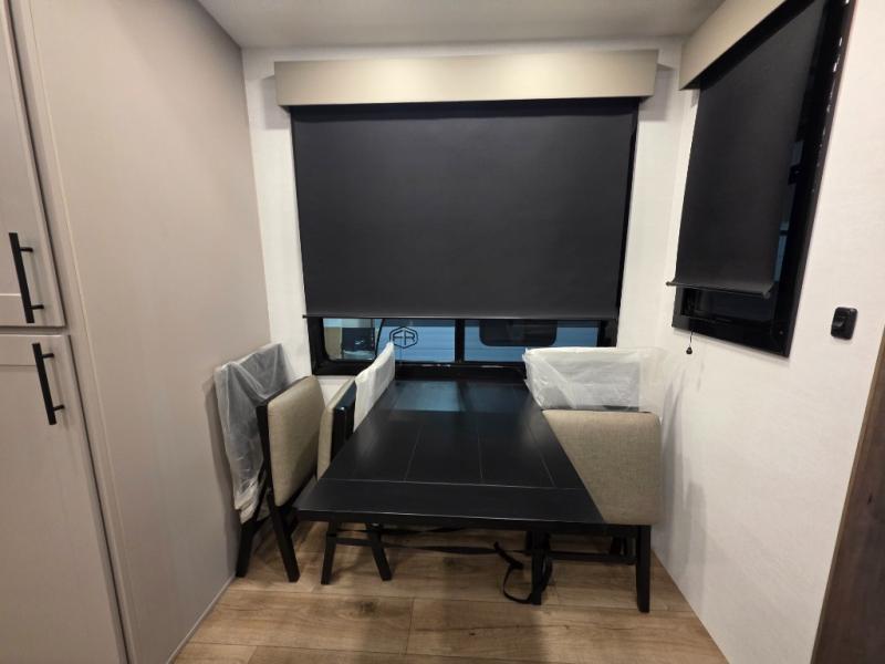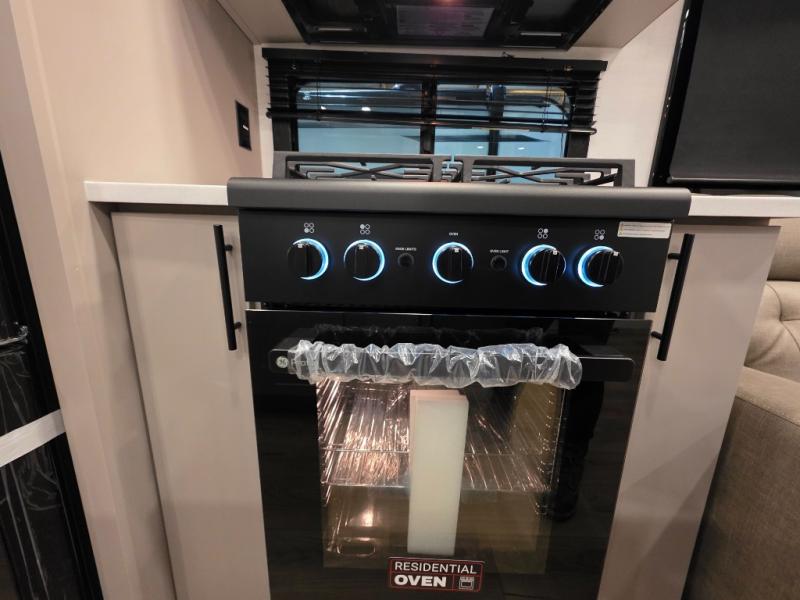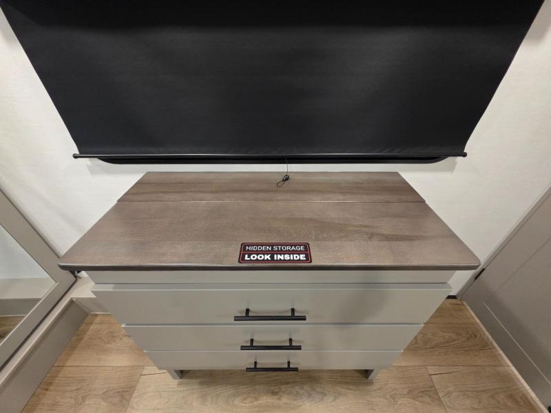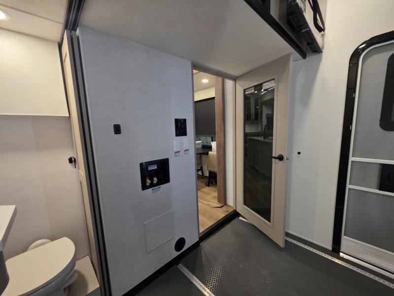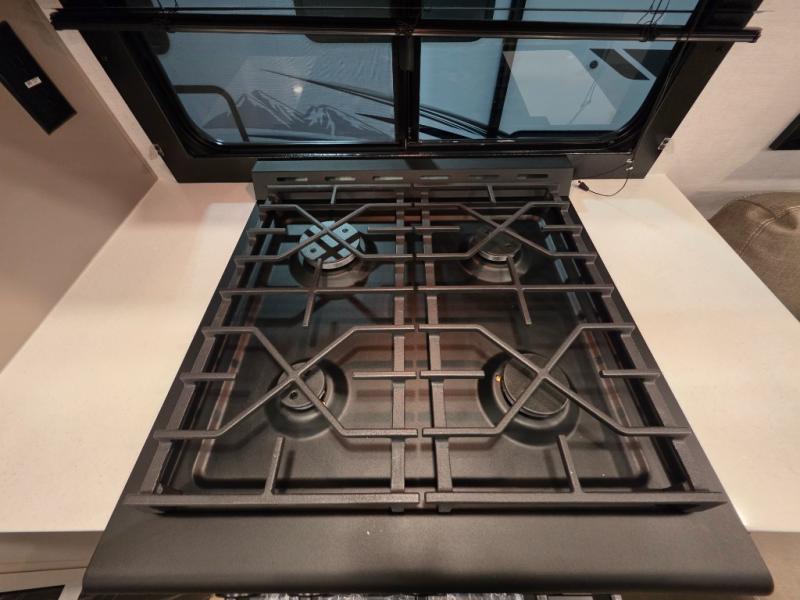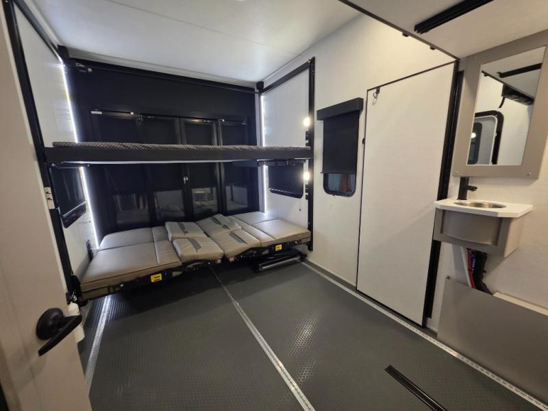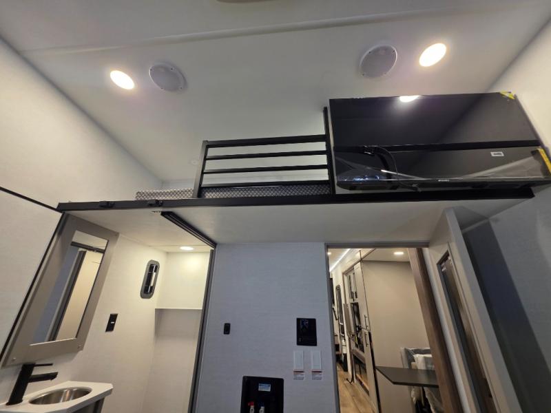 There is room for your off-road toys and the whole family in this toy hauler! The bath and a half makes life more convenient and the dual entry doors create a smooth flow of traffic in and out of the unit. Aside from 13' of garage space and an entrance/exit door, there are also opposing 60" sofas with a HappiJac queen bed above them, a loft that opens to the garage, and a half bathroom. The chef can prepare their best meals with the four-burner cooktop while your crew plays a game at the free-standing dinette with chairs. After a fun day on the trails, wash up in the full bathroom with the 48" x 30" shower, grab your pajamas from the front wardrobe or flip top dresser in the front private bedroom, and sleep soundly on the king bed slide out!