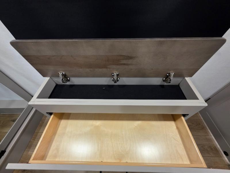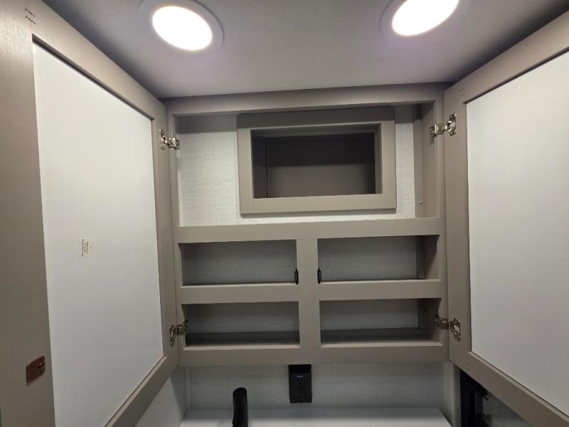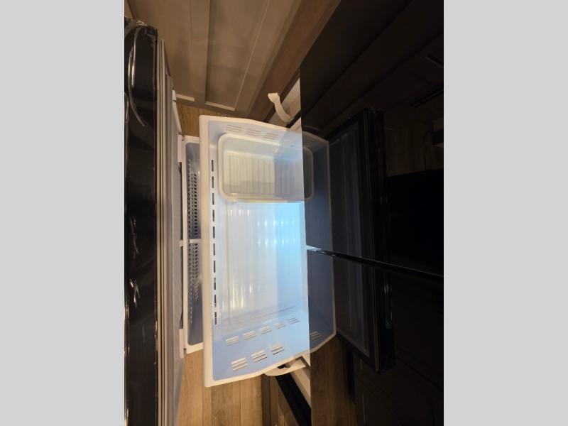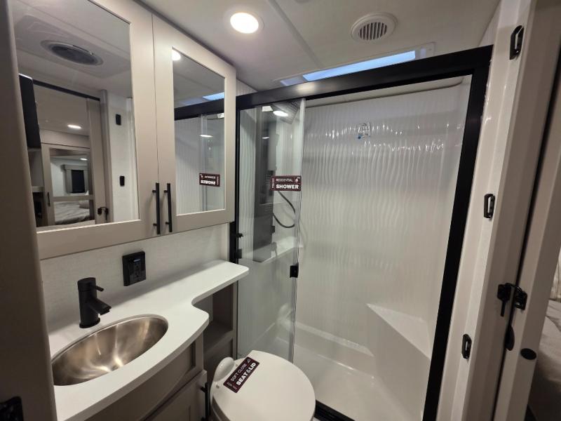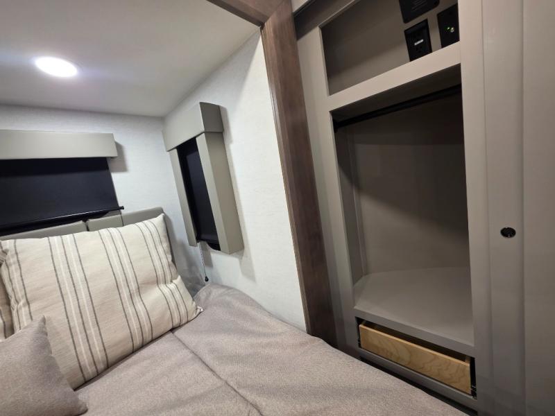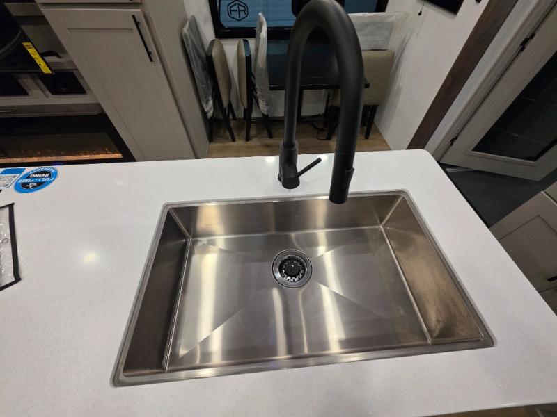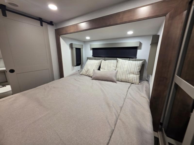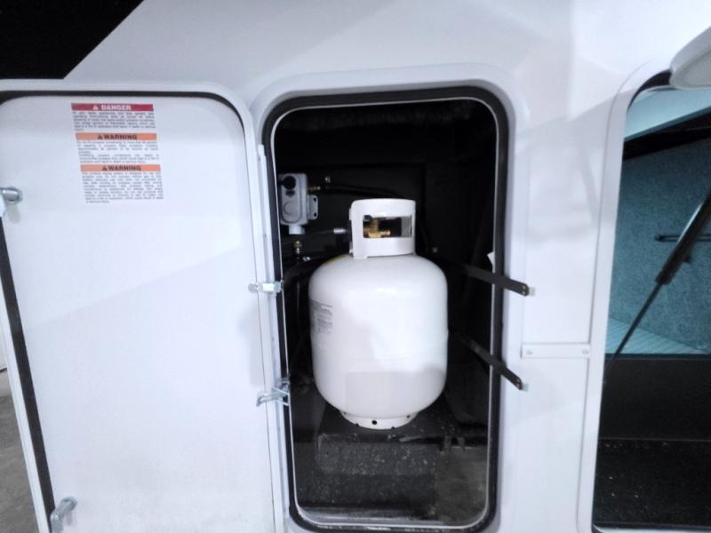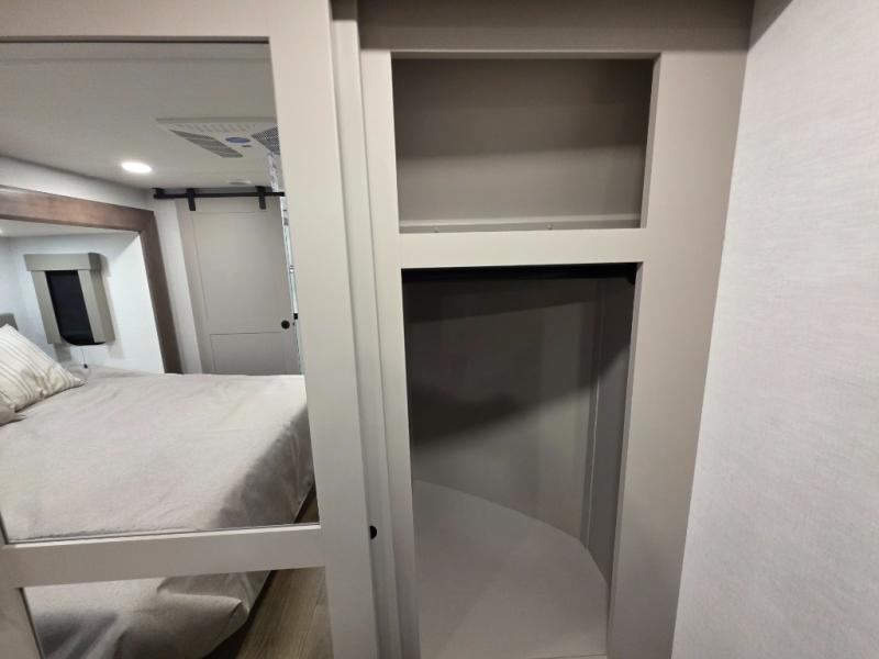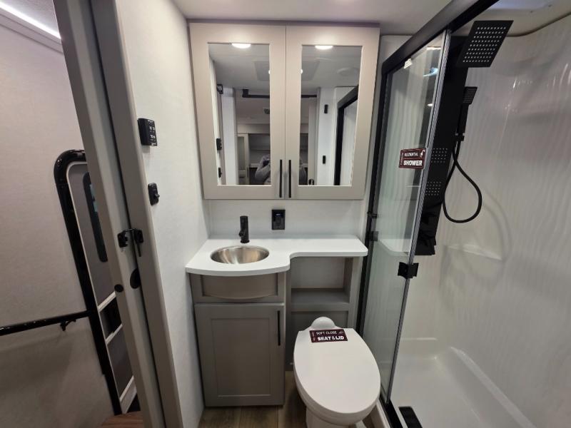 There is room for your off-road toys and the whole family in this toy hauler! The bath and a half makes life more convenient and the dual entry doors create a smooth flow of traffic in and out of the unit. Aside from 13' of garage space and an entrance/exit door, there are also opposing 60" sofas with a HappiJac queen bed above them, a loft that opens to the garage, and a half bathroom. The chef can prepare their best meals with the four-burner cooktop while your crew plays a game at the free-standing dinette with chairs. After a fun day on the trails, wash up in the full bathroom with the 48" x 30" shower, grab your pajamas from the front wardrobe or flip top dresser in the front private bedroom, and sleep soundly on the king bed slide out!