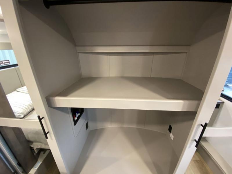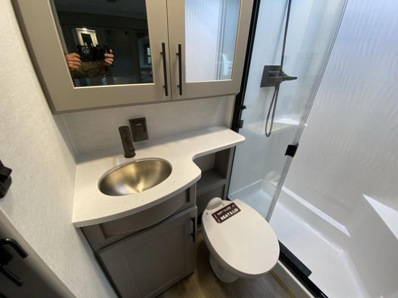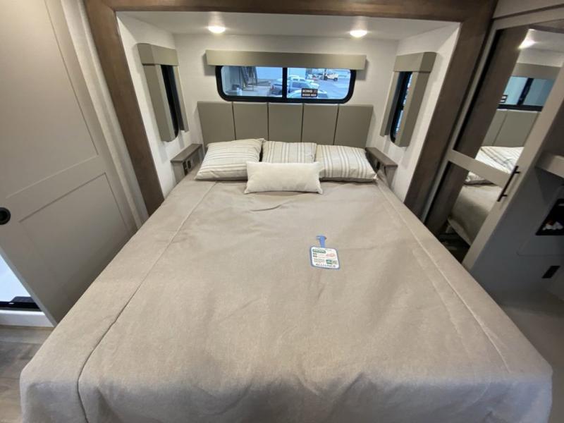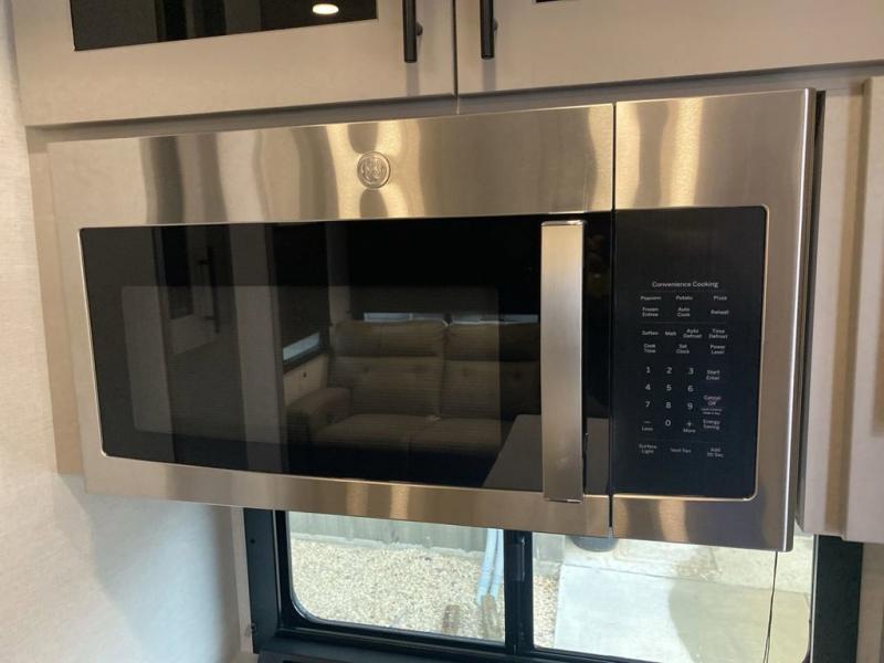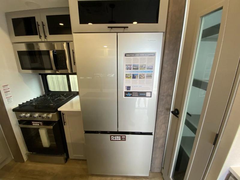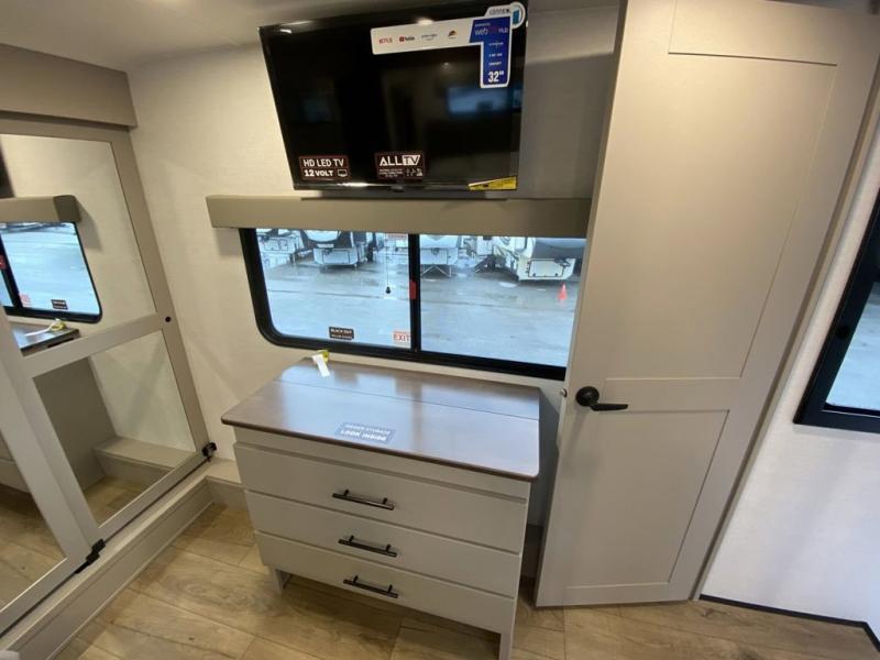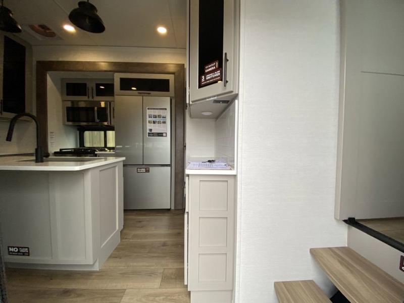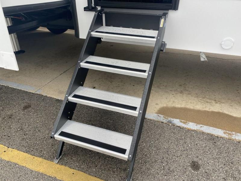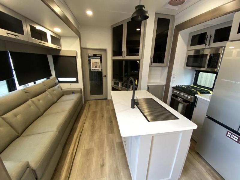 You can easily load up your toys into the 16' garage area of this toy hauler with the 8' weather resistant ramp door and keep them filled with the dual 30 gallon fuel tanks! Once you unload your toys from the garage area, you can set up the opposing HappiJac sofas with a queen mattress above them, the loft that opens to the garage, and the half bathroom. The kitchen has everything you need to prepare your best meals including two hutches, three pantries, and a kitchen island with two bar stools to enjoy your morning coffee and eggs. The dual entry bathroom has a 48" x 30" shower and leads directly into the front private bedroom. Inside the bedroom, a king bed slide allows for more floor space. There is also a flip top dresser, and a front wardrobe with washer and dryer prep.