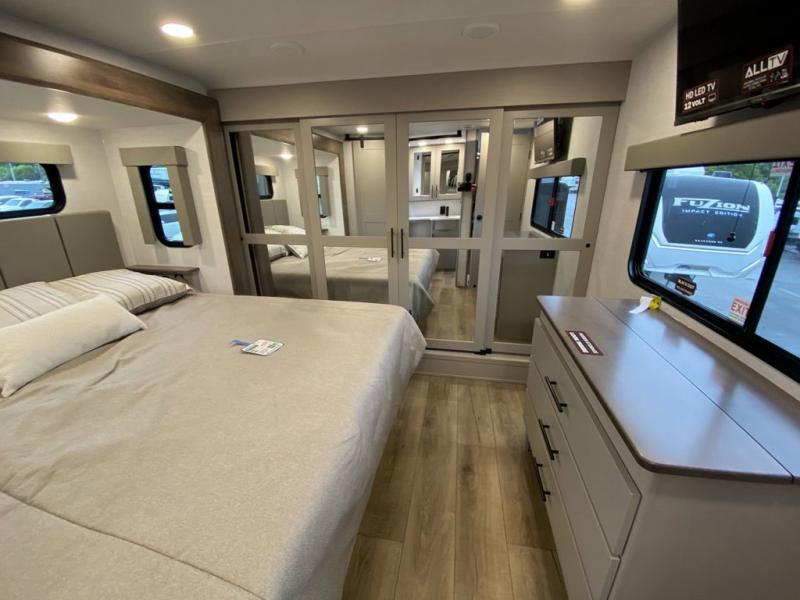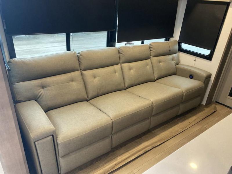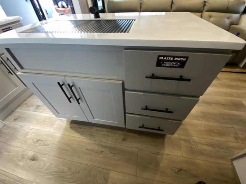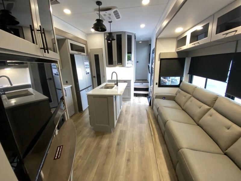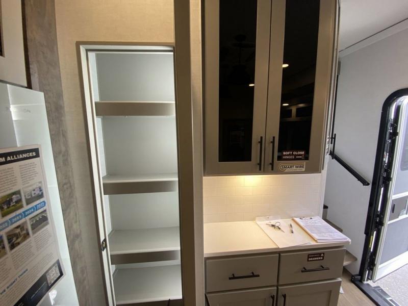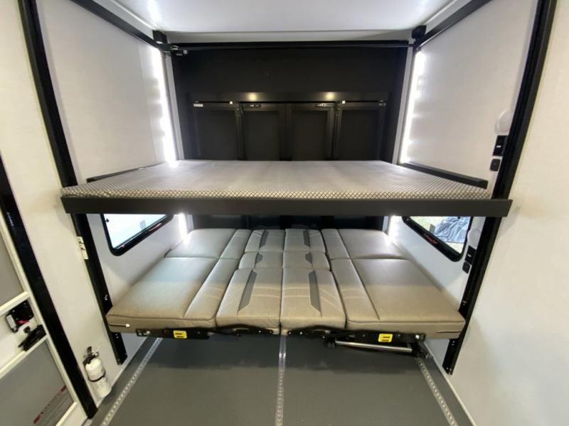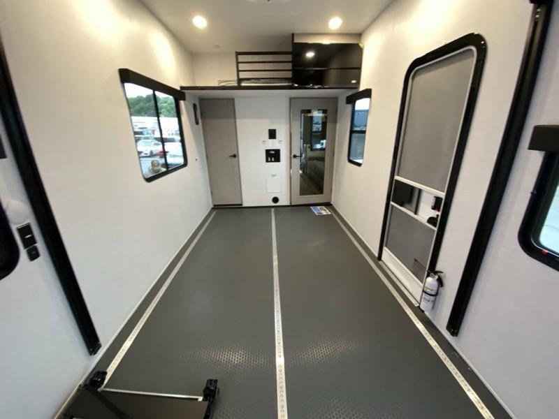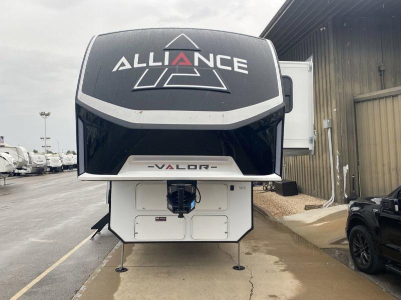 You can bring your toys with you wherever you go with any one of these Alliance RV Valor toy hauler fifth wheels! They are adventure-ready with a quality build from the walk on roof with seamless PVC roof covering to the commercial grade vinyl flooring and MorRyde CRE3000 suspension system. The Performance Running Gear package comes with a 101" wide-body benchmark chassis platform, 7,000 lb. Dexter axles, and a space enhancing drop frame storage compartment to pack in all your riding gear. You can even go off-gridding thanks to the Off the Grid Pack that has two 400 watt solar panels, generator prep, a 40 amp charge controller, and a 100 amp hour lithium iron phosphate battery. Some of the interior comforts you will enjoy are the hardwood cabinet doors and drawers, solid surface kitchen countertops, and commercial grade vinyl flooring with no carpet to make clean up a breeze. The Valor toy haulers are also the Masters of 12 Volt with USB charging station throughout, a stainless steel refrigerator, and more 12 volt features to make camping hassle-free!