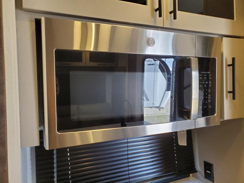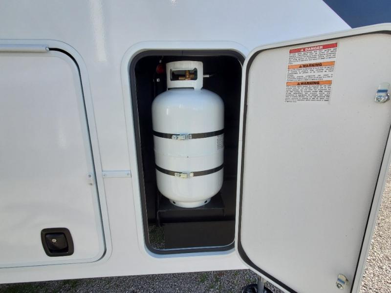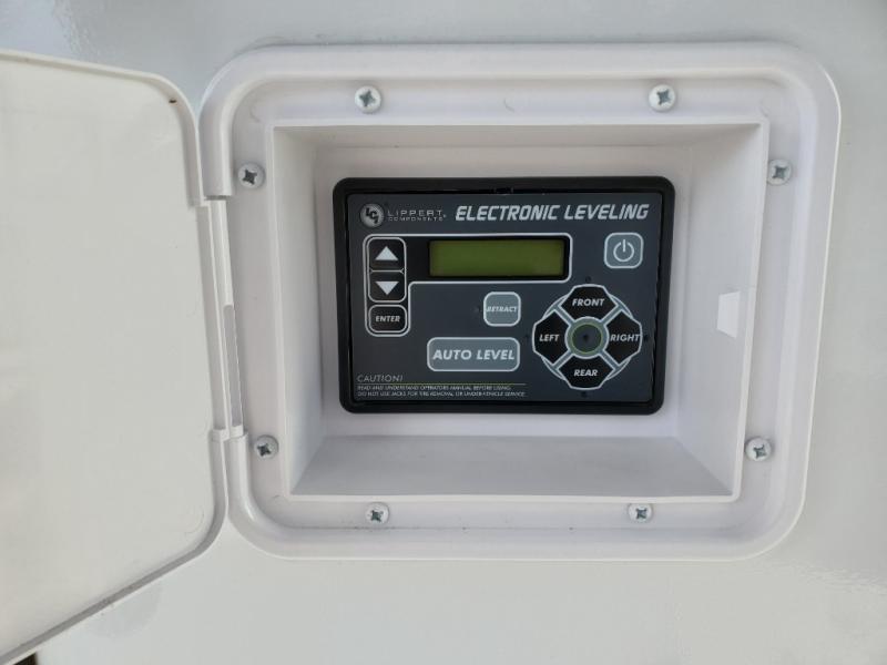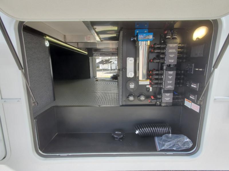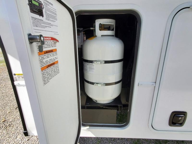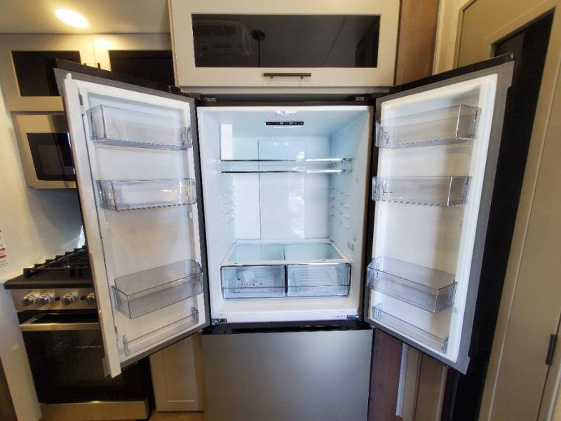 You can easily load up your toys into the 16' garage area of this toy hauler with the 8' weather resistant ramp door and keep them filled with the dual 30 gallon fuel tanks! Once you unload your toys from the garage area, you can set up the opposing HappiJac sofas with a queen mattress above them, the loft that opens to the garage, and the half bathroom. The kitchen has everything you need to prepare your best meals including two hutches, three pantries, and a kitchen island with two bar stools to enjoy your morning coffee and eggs. The dual entry bathroom has a 48" x 30" shower and leads directly into the front private bedroom. Inside the bedroom, a king bed slide allows for more floor space. There is also a flip top dresser, and a front wardrobe with washer and dryer prep.
