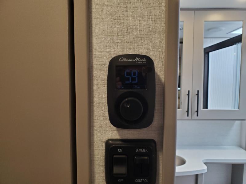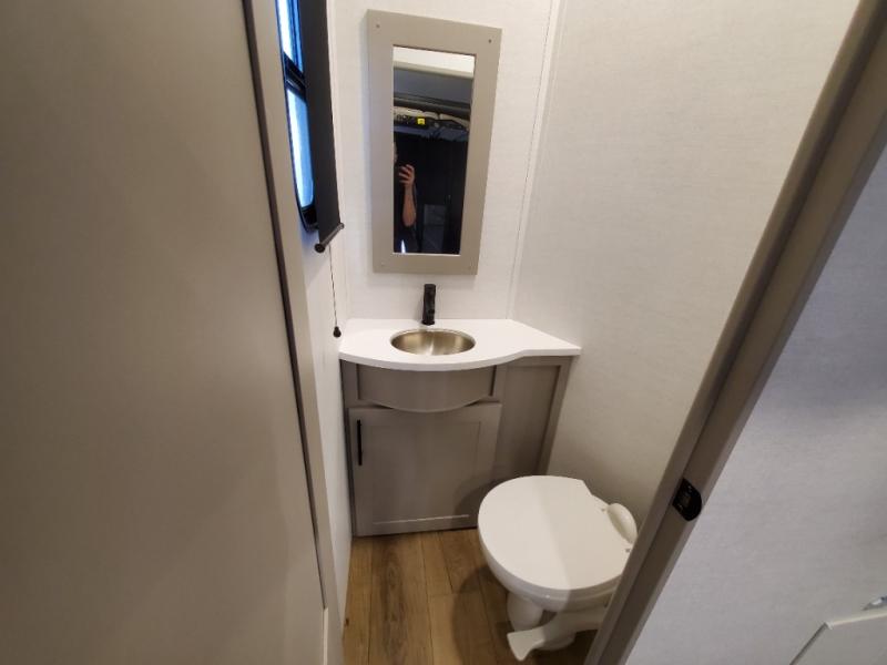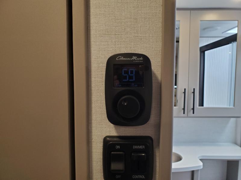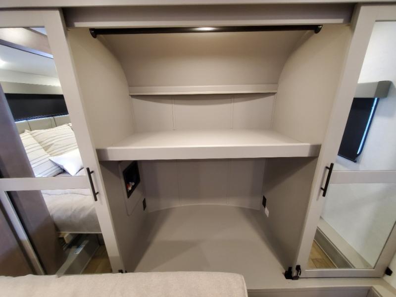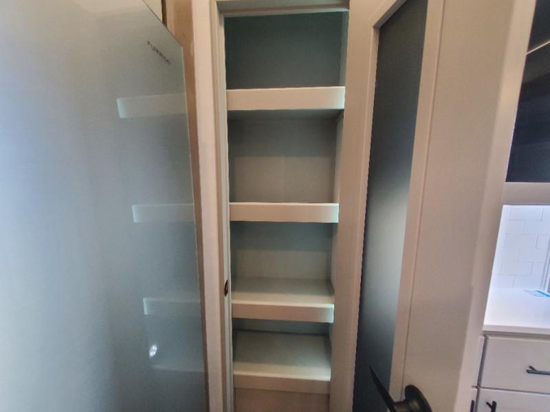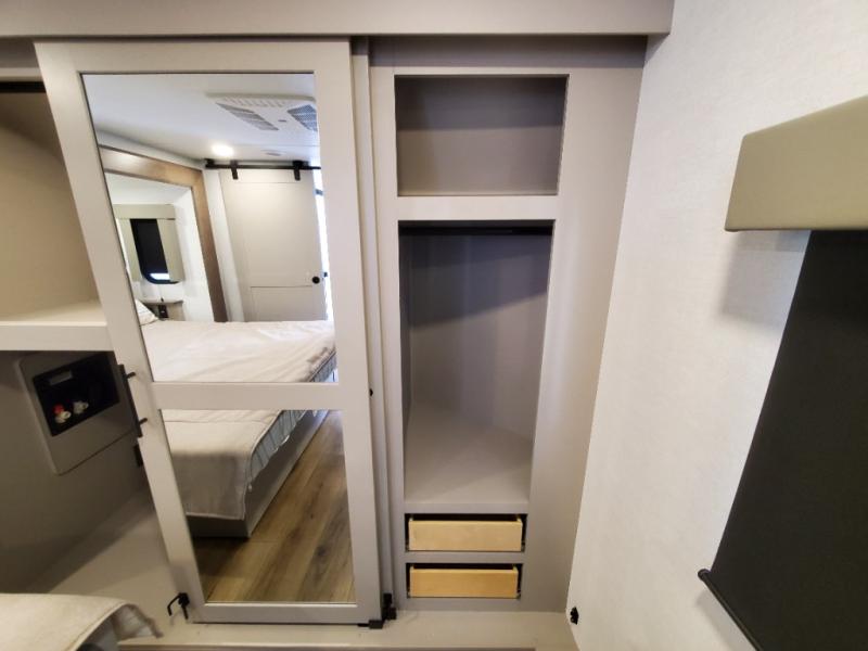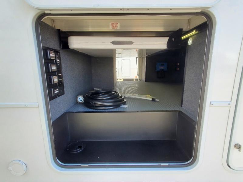 You can easily load up your toys into the 16' garage area of this toy hauler with the 8' weather resistant ramp door and keep them filled with the dual 30 gallon fuel tanks! Once you unload your toys from the garage area, you can set up the opposing HappiJac sofas with a queen mattress above them, the loft that opens to the garage, and the half bathroom. The kitchen has everything you need to prepare your best meals including two hutches, three pantries, and a kitchen island with two bar stools to enjoy your morning coffee and eggs. The dual entry bathroom has a 48" x 30" shower and leads directly into the front private bedroom. Inside the bedroom, a king bed slide allows for more floor space. There is also a flip top dresser, and a front wardrobe with washer and dryer prep.