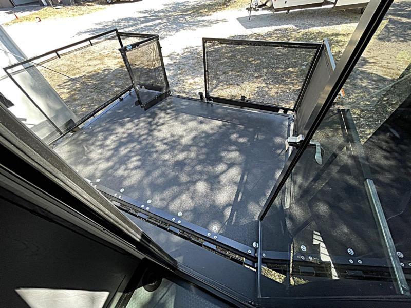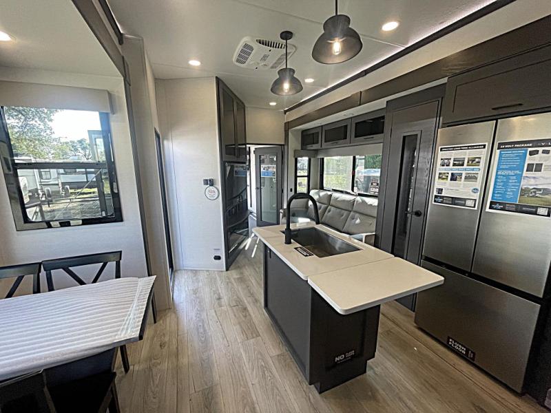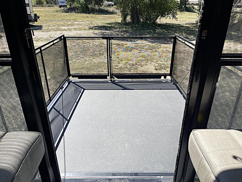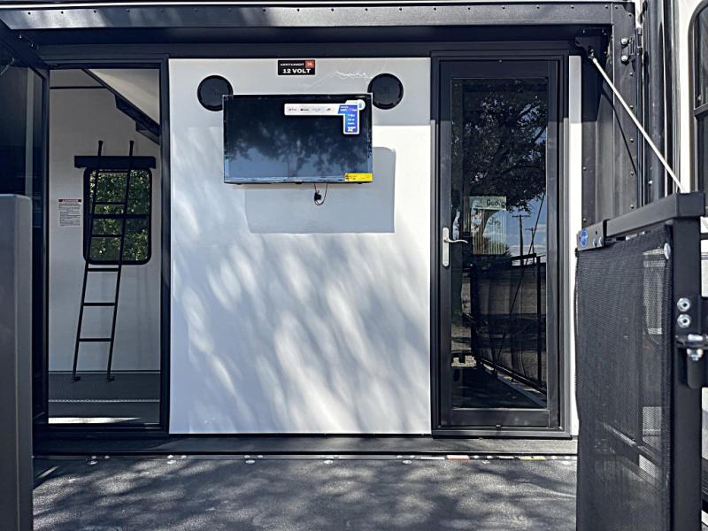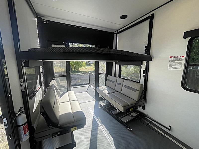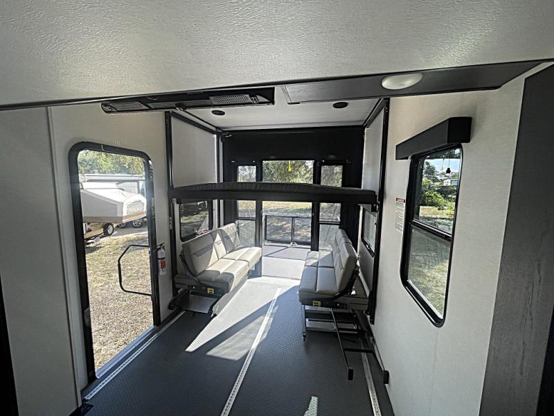 With a 14' garage and an 8' weather resistant ramp door, you can easily load up your toys into this toy hauler! The garage area also has opposing HappiJac sofas with a queen bed above them, a loft that opens to the garage, and a half bathroom. Wake up feeling refreshed after sleeping on the king bed slide inside the front private bedroom and showering in the 48" x 30" shower inside the dual entry bathroom. Now that you're ready for the day you can head to the kitchen and fry up some bacon on the four burner cooktop then enjoy it at the free standing dinette. There is also a kitchen island with flip-up extensions for more counter space. When you're ready to wind down your nights, either relax on the sofa across from the fireplace inside or set up a chair outside on the fold-down side patio!