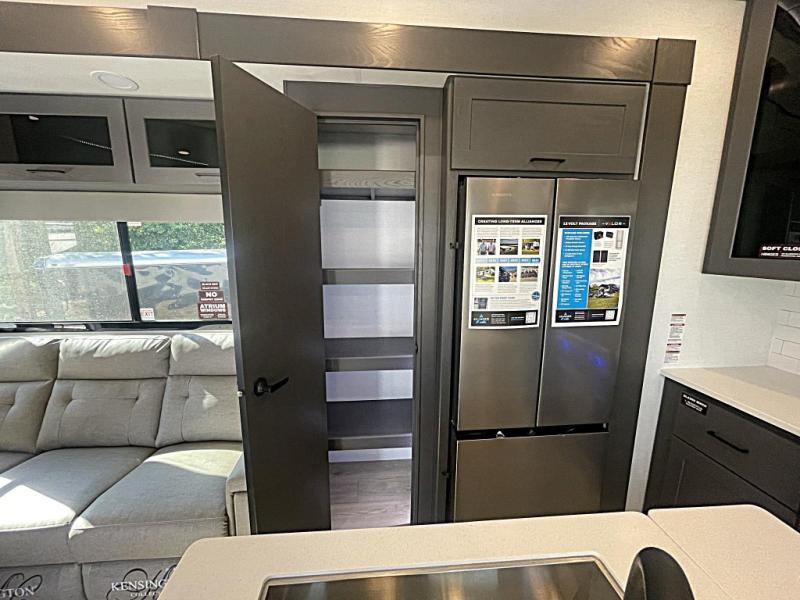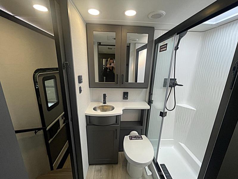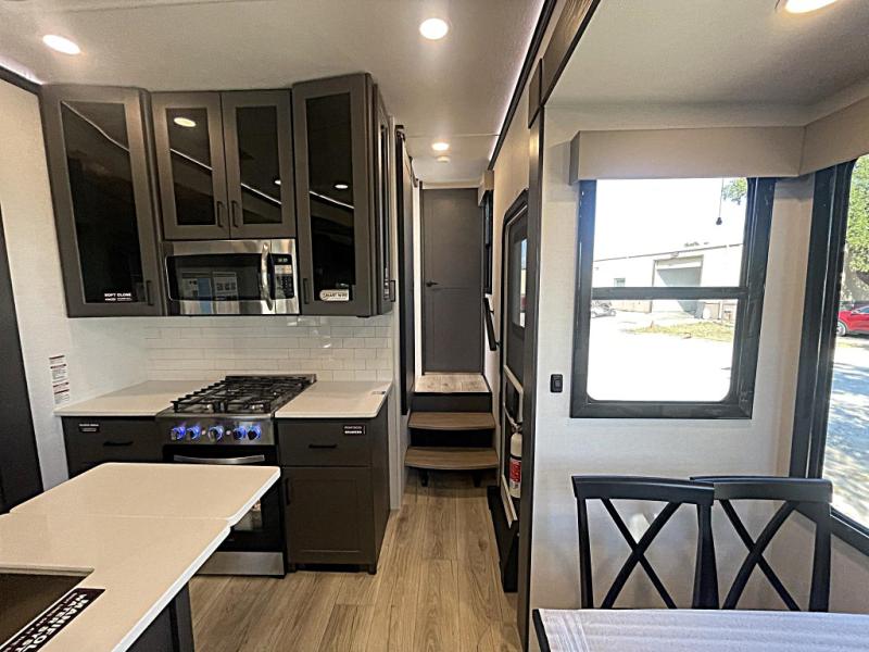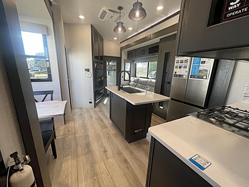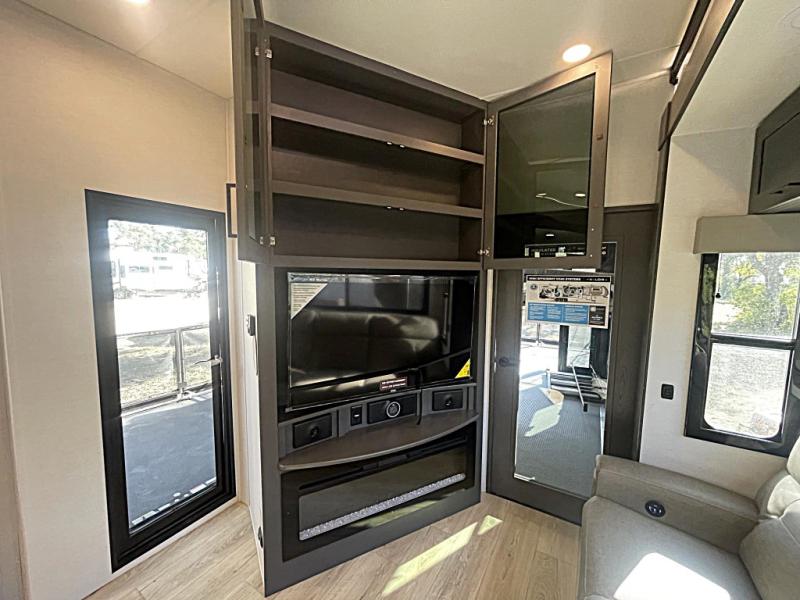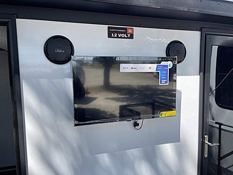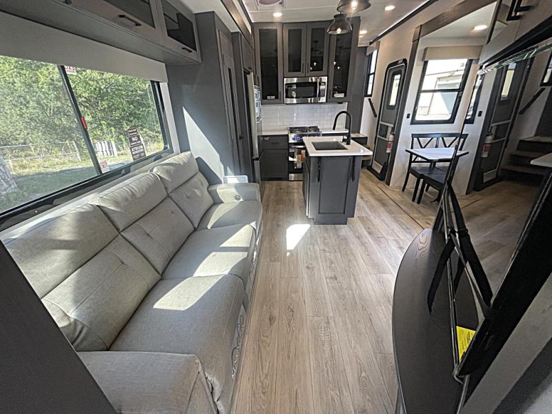 With a 14' garage and an 8' weather resistant ramp door, you can easily load up your toys into this toy hauler! The garage area also has opposing HappiJac sofas with a queen bed above them, a loft that opens to the garage, and a half bathroom. Wake up feeling refreshed after sleeping on the king bed slide inside the front private bedroom and showering in the 48" x 30" shower inside the dual entry bathroom. Now that you're ready for the day you can head to the kitchen and fry up some bacon on the four burner cooktop then enjoy it at the free standing dinette. There is also a kitchen island with flip-up extensions for more counter space. When you're ready to wind down your nights, either relax on the sofa across from the fireplace inside or set up a chair outside on the fold-down side patio!