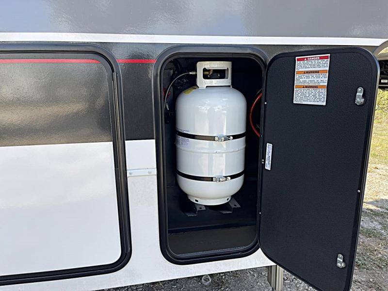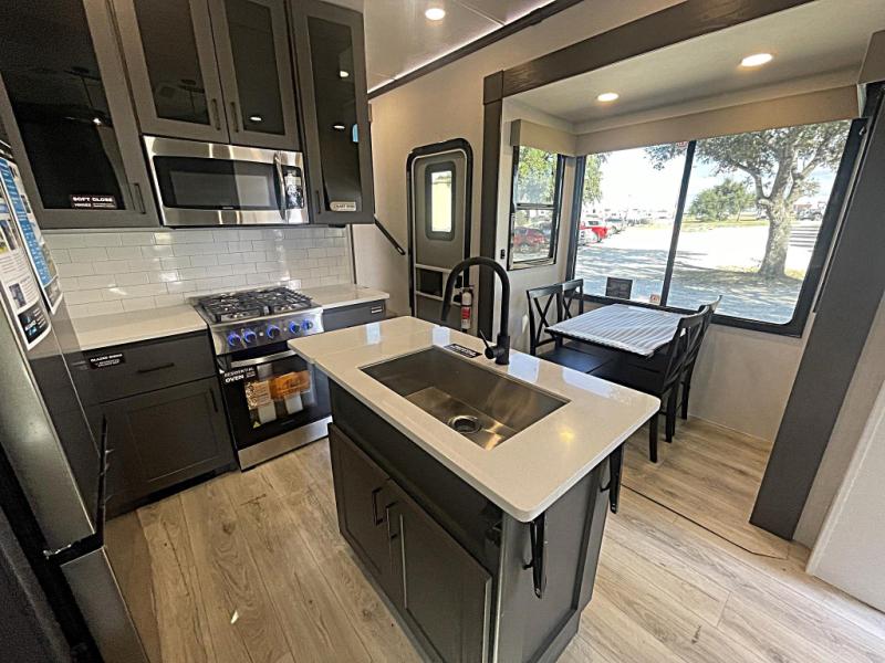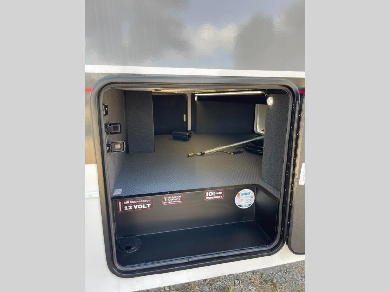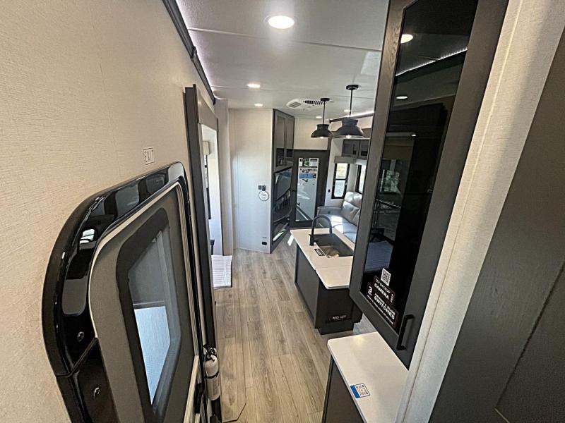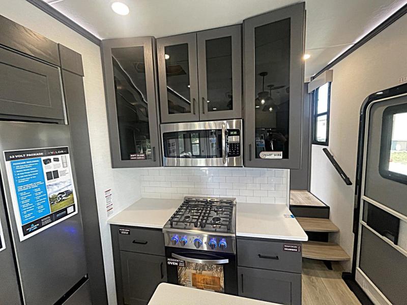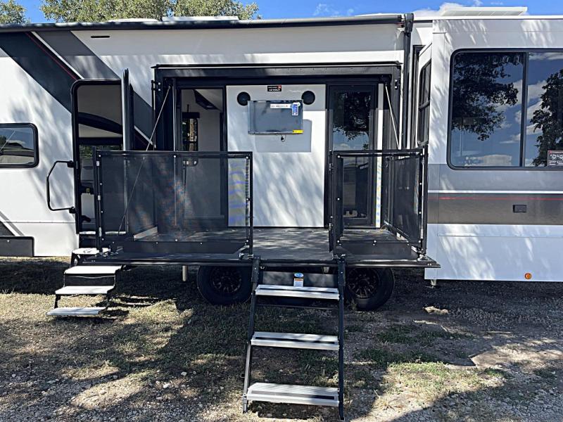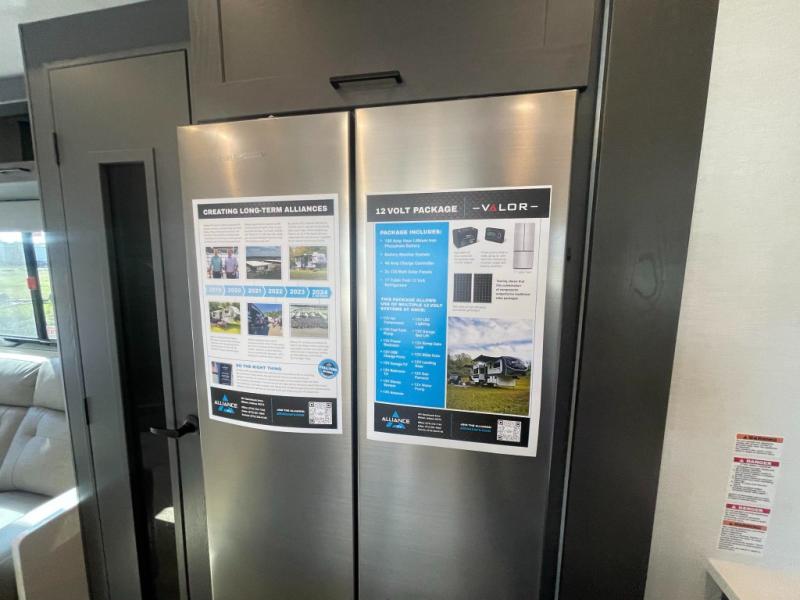 You can bring your toys with you wherever you go with any one of these Alliance RV Valor toy hauler fifth wheels! They are adventure-ready with a quality build from the walk on roof with seamless PVC roof covering to the commercial grade vinyl flooring and MorRyde CRE3000 suspension system. The Performance Running Gear package comes with a 101" wide-body benchmark chassis platform, 7,000 lb. Dexter axles, and a space enhancing drop frame storage compartment to pack in all your riding gear. You can even go off-gridding thanks to the Off the Grid Pack that has two 400 watt solar panels, generator prep, a 40 amp charge controller, and a 100 amp hour lithium iron phosphate battery. Some of the interior comforts you will enjoy are the hardwood cabinet doors and drawers, solid surface kitchen countertops, and commercial grade vinyl flooring with no carpet to make clean up a breeze. The Valor toy haulers are also the Masters of 12 Volt with USB charging station throughout, a stainless steel refrigerator, and more 12 volt features to make camping hassle-free!