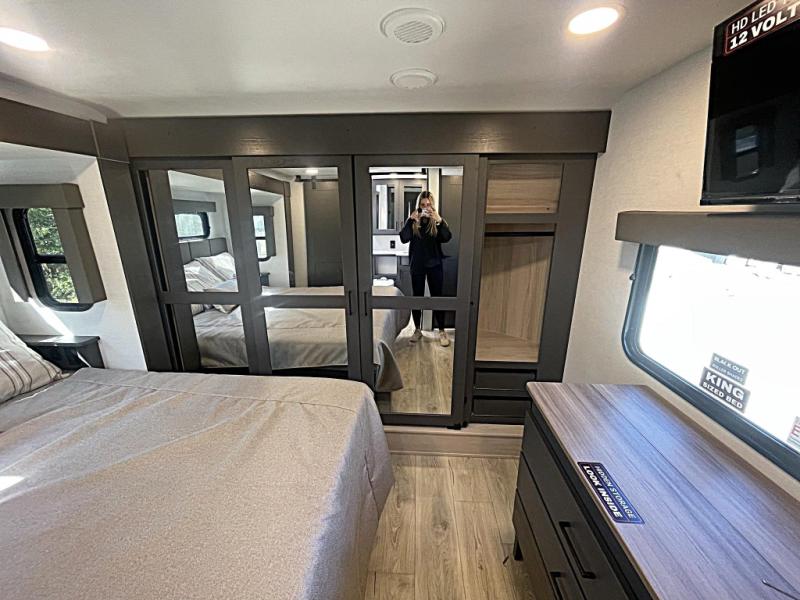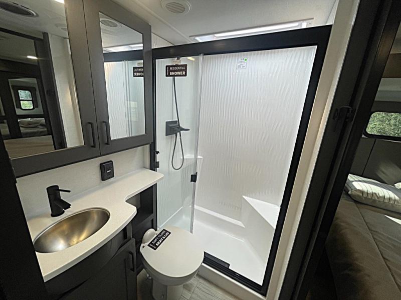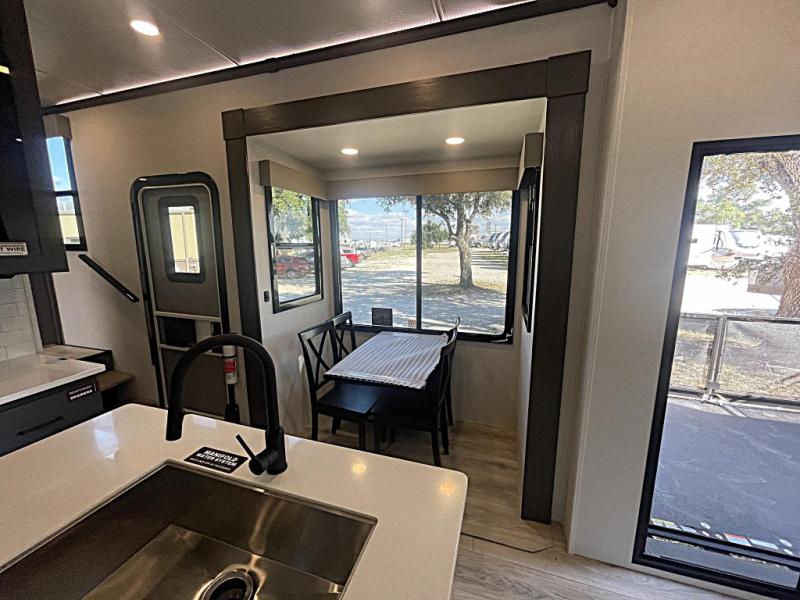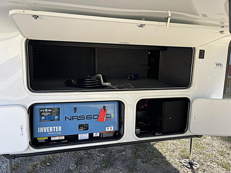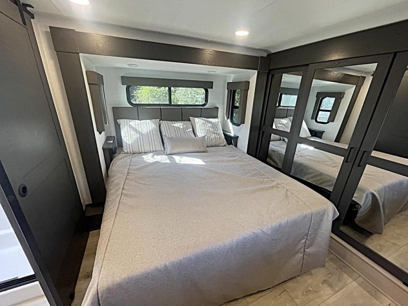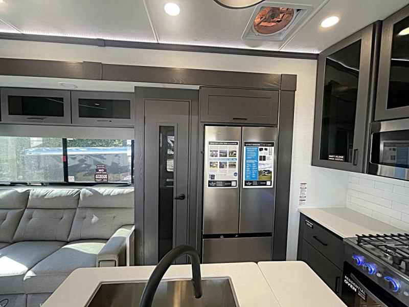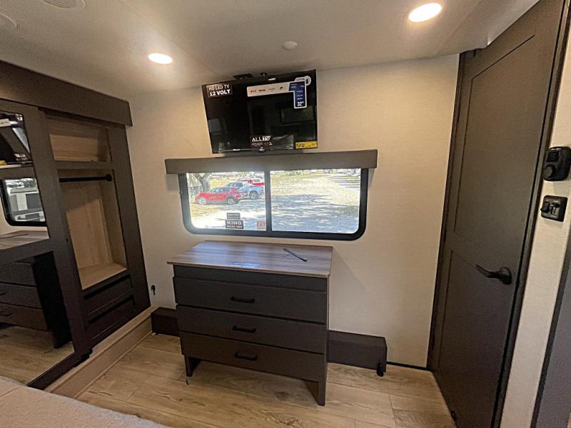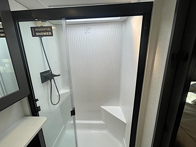 You can bring your toys with you wherever you go with any one of these Alliance RV Valor toy hauler fifth wheels! They are adventure-ready with a quality build from the walk on roof with seamless PVC roof covering to the commercial grade vinyl flooring and MorRyde CRE3000 suspension system. The Performance Running Gear package comes with a 101" wide-body benchmark chassis platform, 7,000 lb. Dexter axles, and a space enhancing drop frame storage compartment to pack in all your riding gear. You can even go off-gridding thanks to the Off the Grid Pack that has two 400 watt solar panels, generator prep, a 40 amp charge controller, and a 100 amp hour lithium iron phosphate battery. Some of the interior comforts you will enjoy are the hardwood cabinet doors and drawers, solid surface kitchen countertops, and commercial grade vinyl flooring with no carpet to make clean up a breeze. The Valor toy haulers are also the Masters of 12 Volt with USB charging station throughout, a stainless steel refrigerator, and more 12 volt features to make camping hassle-free!