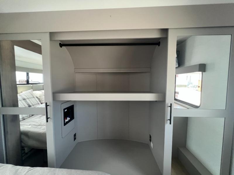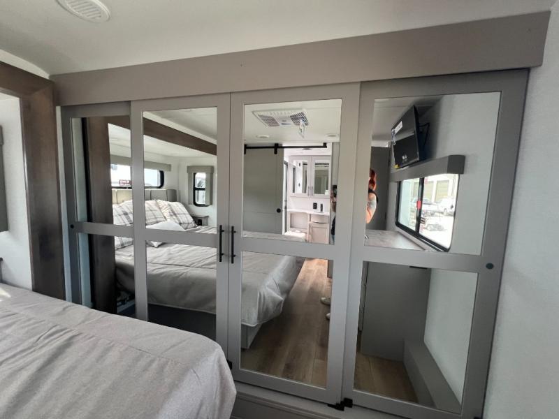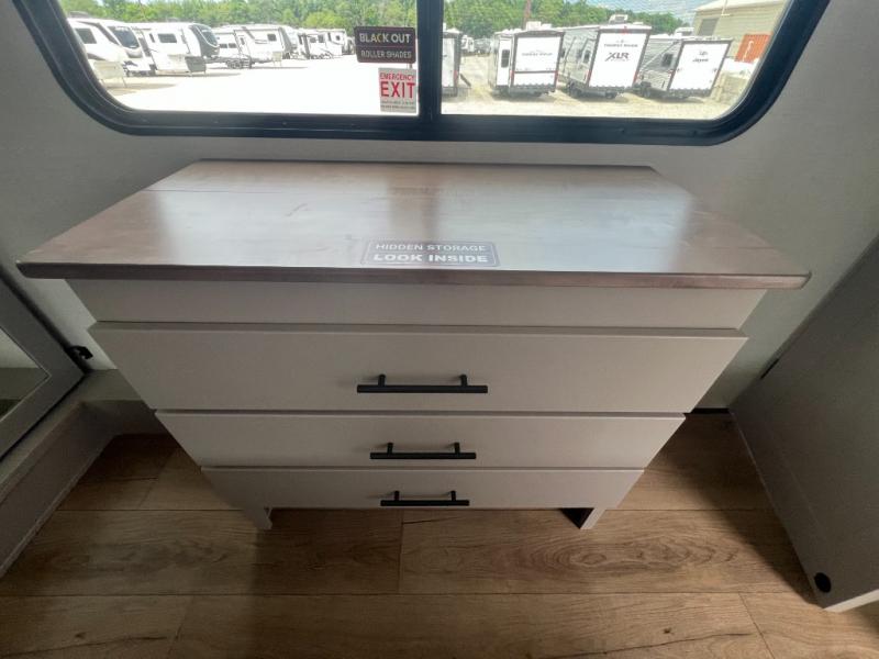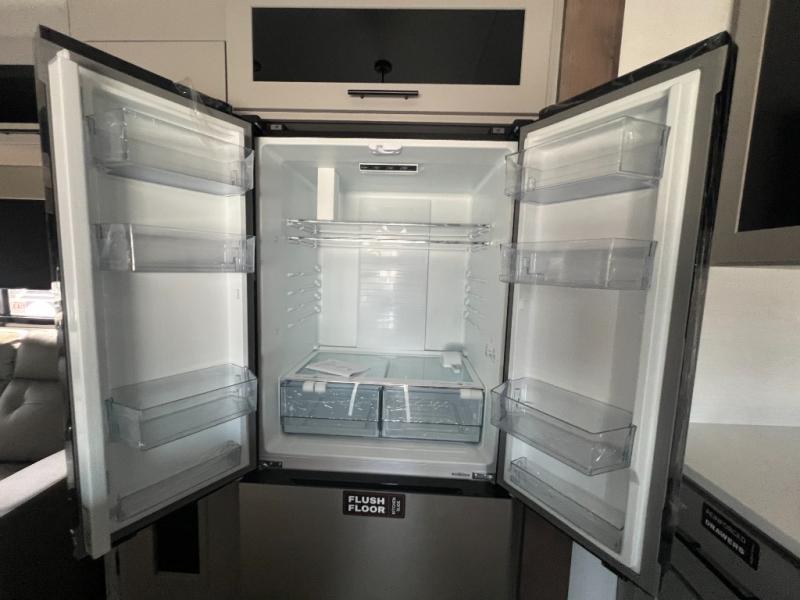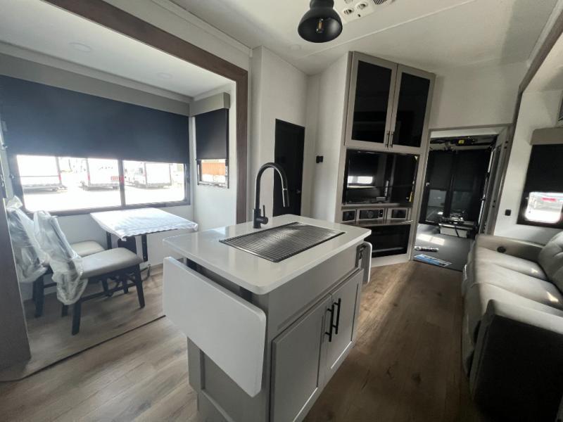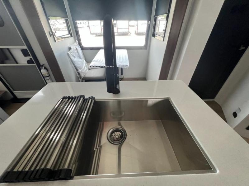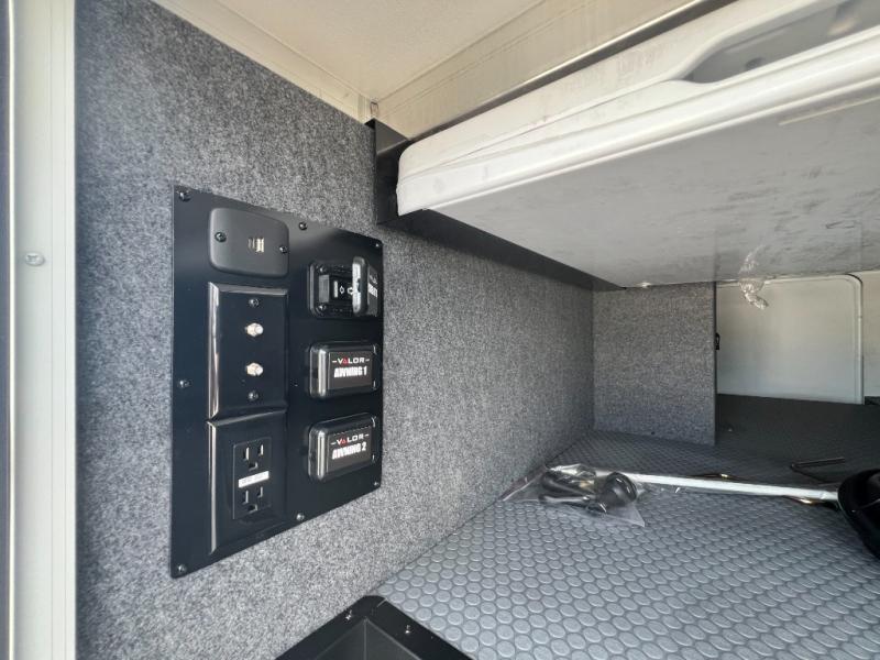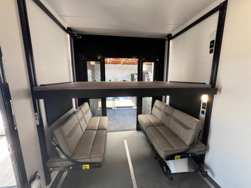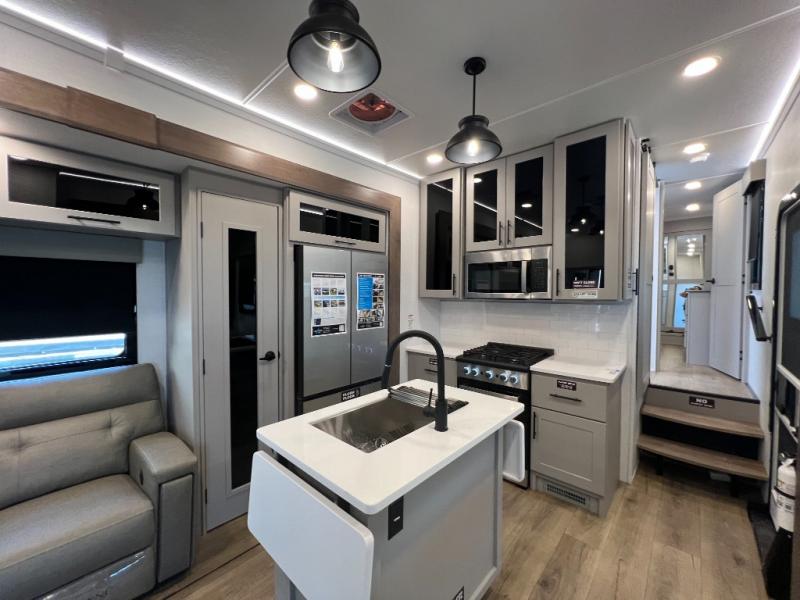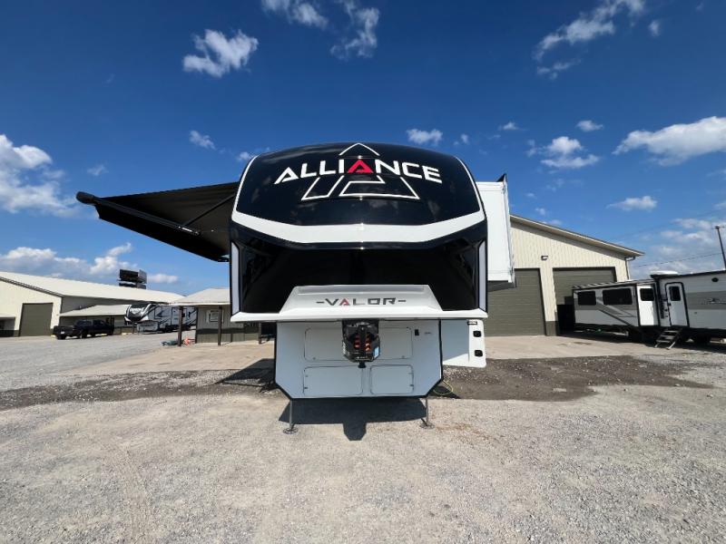 You can bring your toys with you wherever you go with any one of these Alliance RV Valor toy hauler fifth wheels! They are adventure-ready with a quality build from the walk on roof with seamless PVC roof covering to the commercial grade vinyl flooring and MorRyde CRE3000 suspension system. The Performance Running Gear package comes with a 101" wide-body benchmark chassis platform, 7,000 lb. Dexter axles, and a space enhancing drop frame storage compartment to pack in all your riding gear. You can even go off-gridding thanks to the Off the Grid Pack that has two 400 watt solar panels, generator prep, a 40 amp charge controller, and a 100 amp hour lithium iron phosphate battery. Some of the interior comforts you will enjoy are the hardwood cabinet doors and drawers, solid surface kitchen countertops, and commercial grade vinyl flooring with no carpet to make clean up a breeze. The Valor toy haulers are also the Masters of 12 Volt with USB charging station throughout, a stainless steel refrigerator, and more 12 volt features to make camping hassle-free!