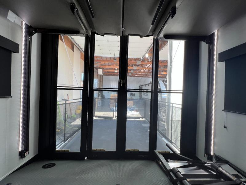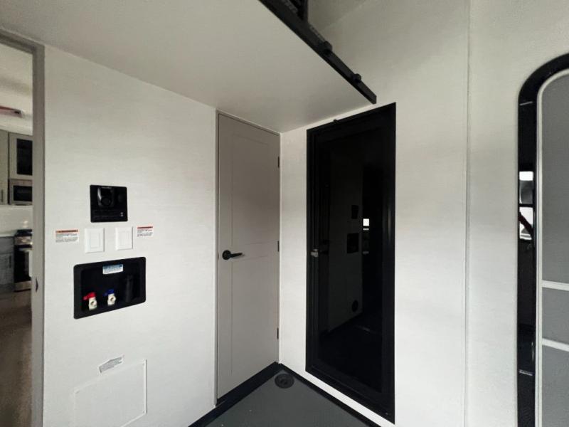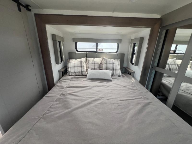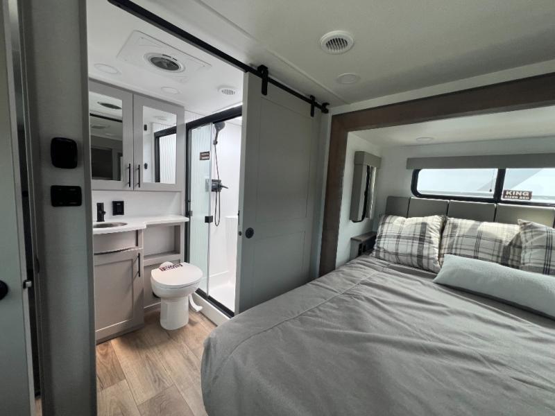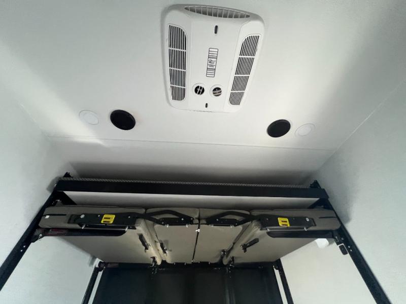 With a 14' garage and an 8' weather resistant ramp door, you can easily load up your toys into this toy hauler! The garage area also has opposing HappiJac sofas with a queen bed above them, a loft that opens to the garage, and a half bathroom. Wake up feeling refreshed after sleeping on the king bed slide inside the front private bedroom and showering in the 48" x 30" shower inside the dual entry bathroom. Now that you're ready for the day you can head to the kitchen and fry up some bacon on the four burner cooktop then enjoy it at the free standing dinette. There is also a kitchen island with flip-up extensions for more counter space. When you're ready to wind down your nights, either relax on the sofa across from the fireplace inside or set up a chair outside on the fold-down side patio!