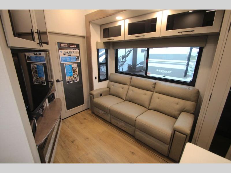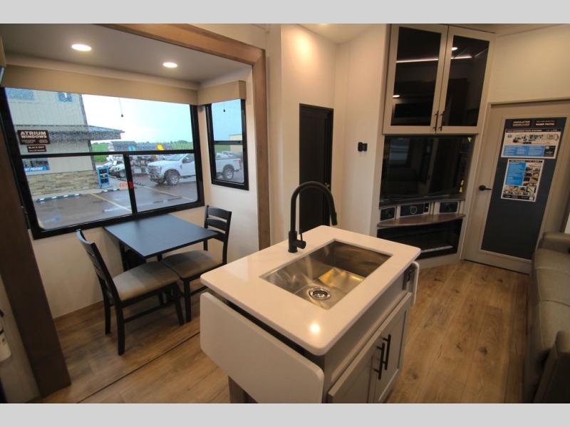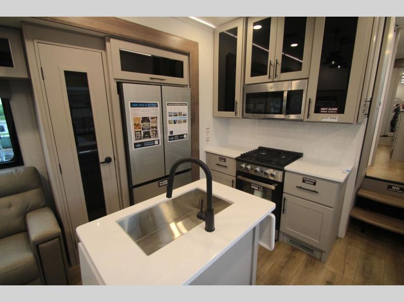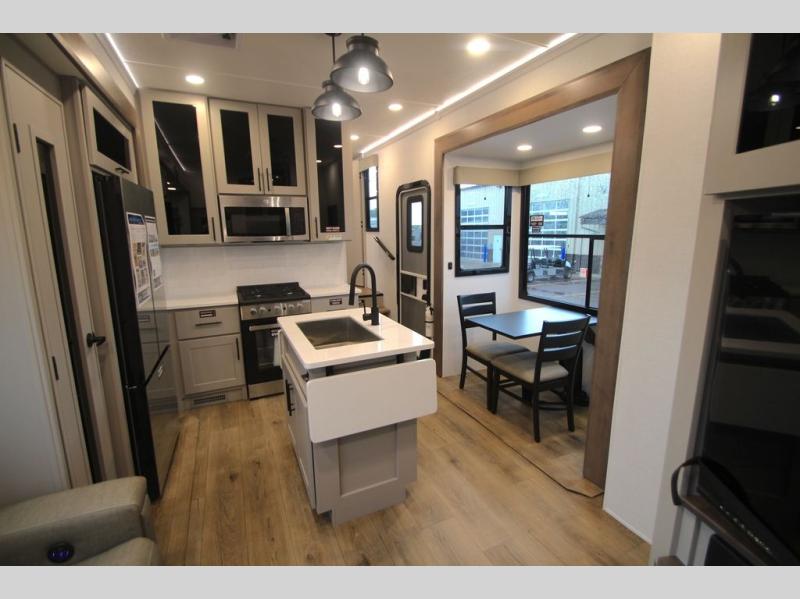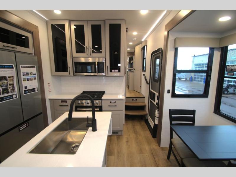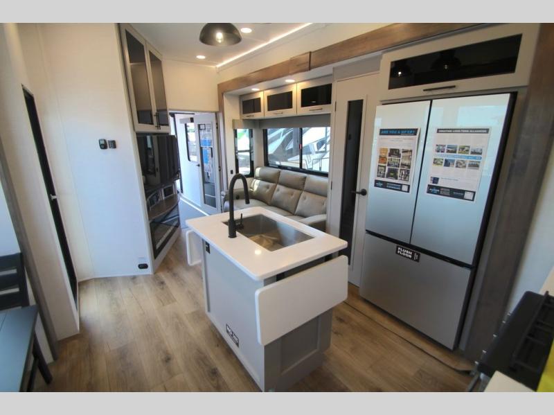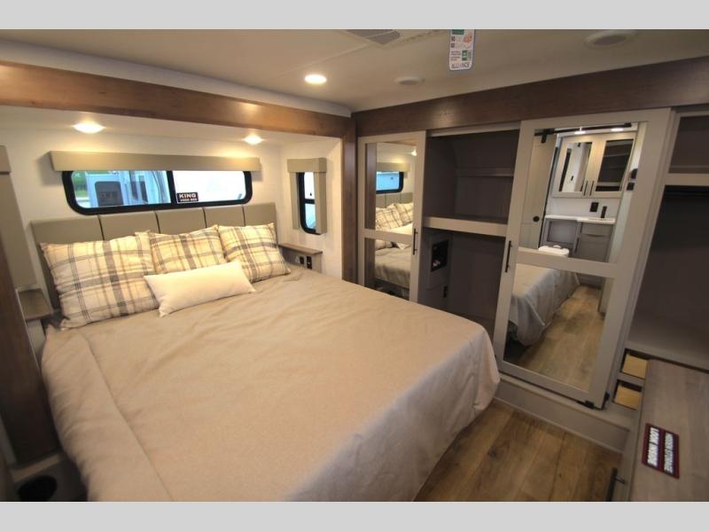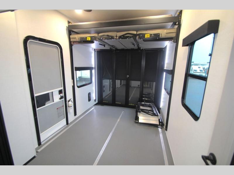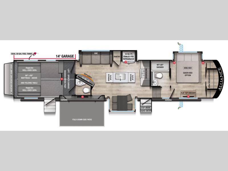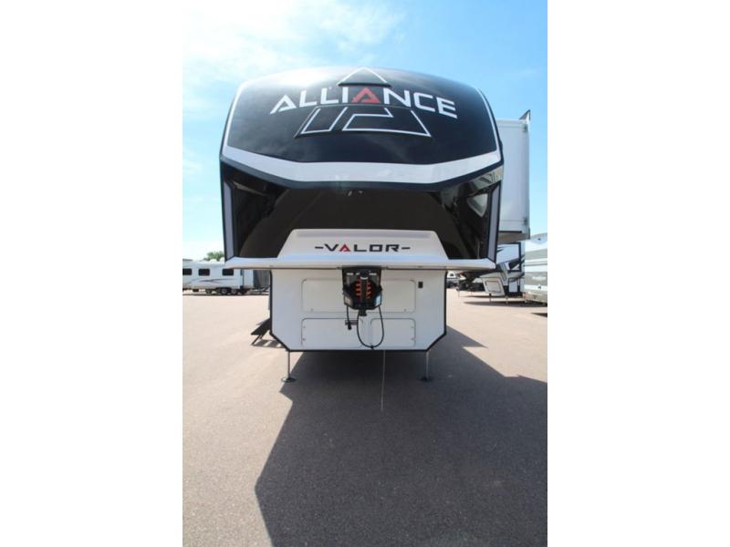You can bring your toys with you wherever you go with any one of these Alliance RV Valor toy hauler fifth wheels! They are adventure-ready with a quality build from the walk on roof with seamless PVC roof covering to the commercial grade vinyl flooring and MorRyde CRE3000 suspension system. The Performance Running Gear package comes with a 101" wide-body benchmark chassis platform, 7,000 lb. Dexter axles, and a space enhancing drop frame storage compartment to pack in all your riding gear. You can even go off-gridding thanks to the Off the Grid Pack that has two 400-watt solar panels, generator prep, a 60-amp charge controller, and a 100-amp hour lithium iron phosphate battery. Some of the interior comforts you will enjoy are the hardwood cabinet doors and drawers, solid surface kitchen countertops, and commercial grade vinyl flooring with no carpet to make clean up a breeze. The Valor toy haulers are also the Masters of 12 Volt with USB charging station throughout, a 12V refrigerator, and more 12-volt features to make camping hassle-free!
