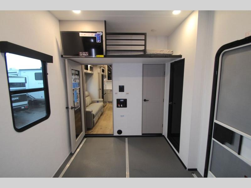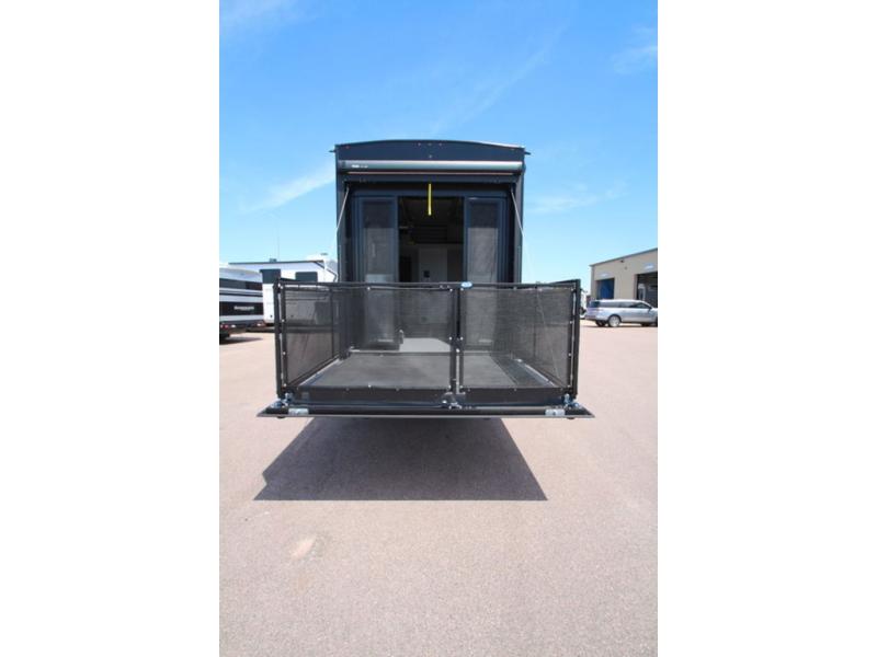 With a 14' garage and an 8' weather resistant ramp door, you can easily load up your toys into this toy hauler! The garage area also has opposing HappiJac sofas with a queen bed above them, a loft that opens to the garage, and a half bathroom. Wake up feeling refreshed after sleeping on the king bed slide inside the front private bedroom and showering in the 48" x 30" shower inside the dual entry bathroom. Now that you're ready for the day you can head to the kitchen and fry up some bacon on the four-burner cooktop then enjoy it at the free-standing dinette. There is also a kitchen island with flip-up extensions for more counter space. When you're ready to wind down your nights, either relax on the sofa across from the fireplace inside or set up a chair outside on the fold-down side patio!
