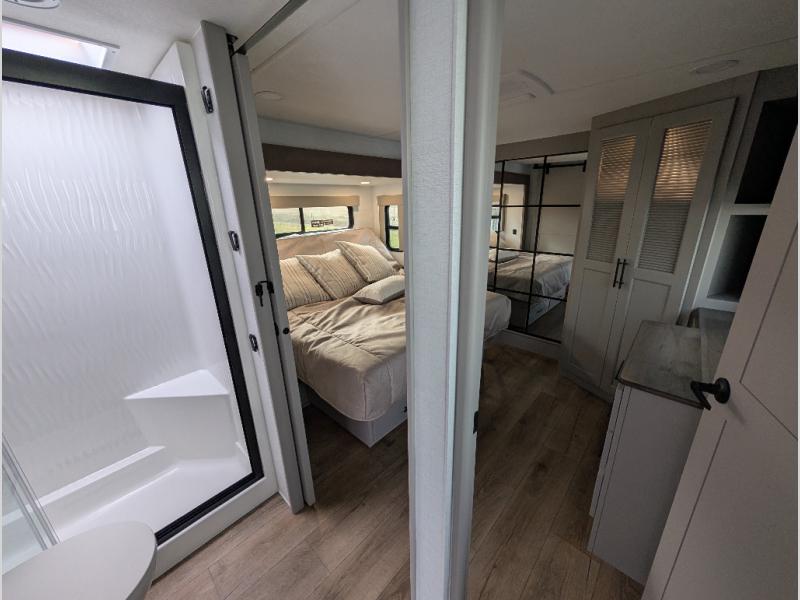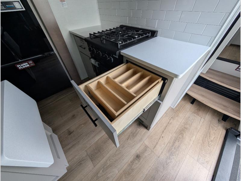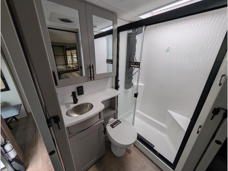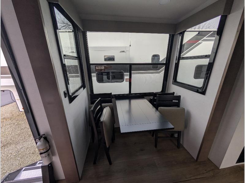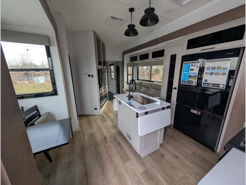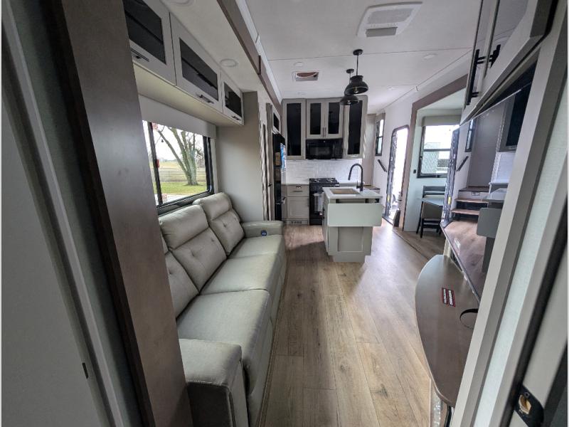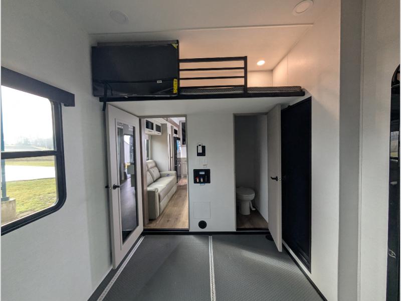 With a 14' garage and an 8' weather resistant ramp door, you can easily load up your toys into this toy hauler! The garage area also has opposing HappiJac sofas with a queen bed above them, a loft that opens to the garage, and a half bathroom. Wake up feeling refreshed after sleeping on the king bed slide inside the front private bedroom and showering in the 48" x 30" shower inside the dual entry bathroom. Now that you're ready for the day you can head to the kitchen and fry up some bacon on the four-burner cooktop then enjoy it at the free-standing dinette. There is also a kitchen island with flip-up extensions for more counter space. When you're ready to wind down your nights, either relax on the sofa across from the fireplace inside or set up a chair outside on the fold-down side patio!