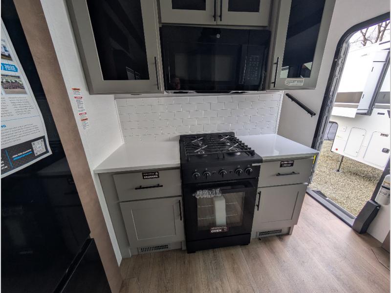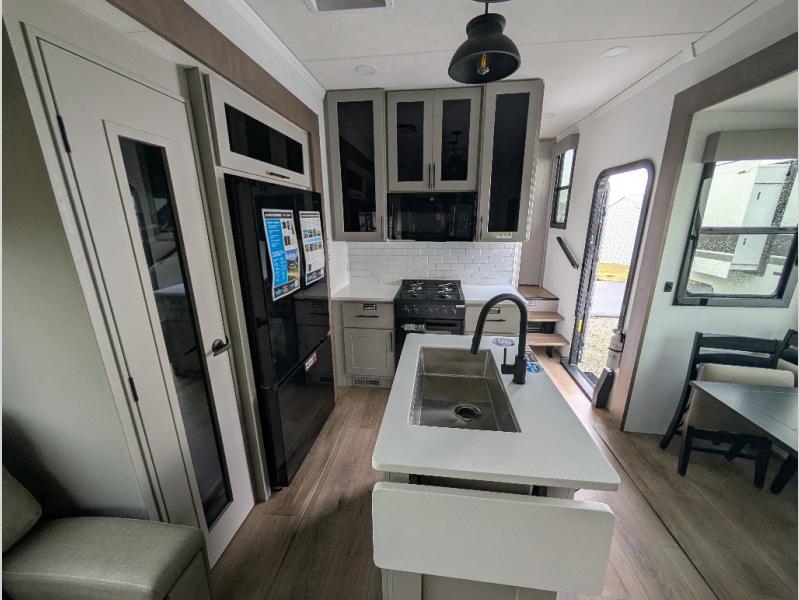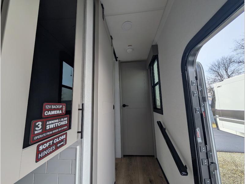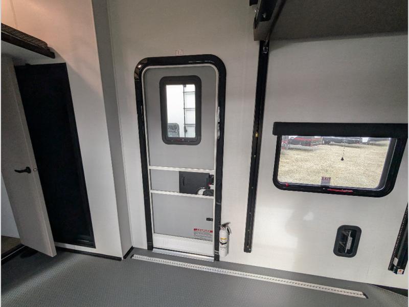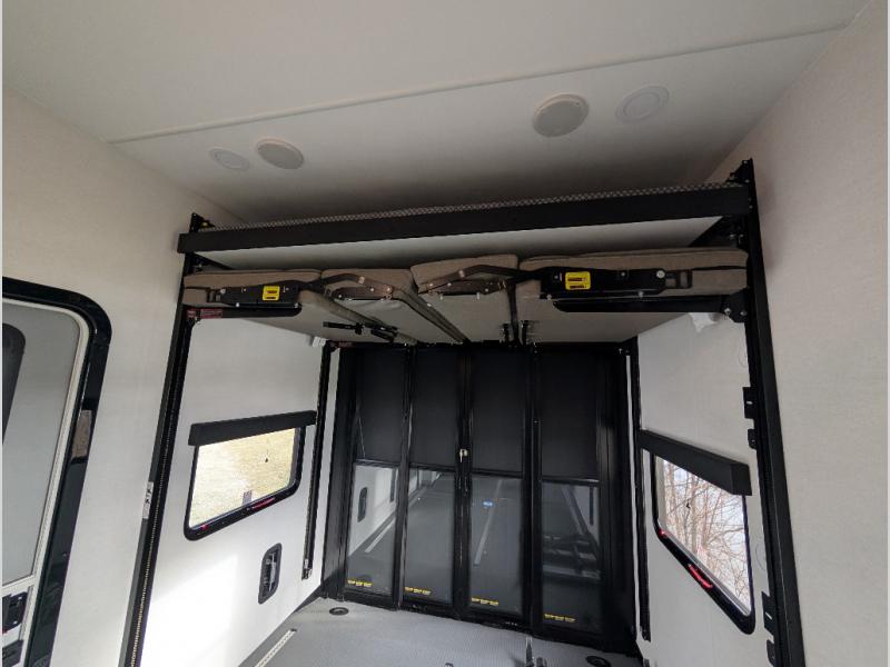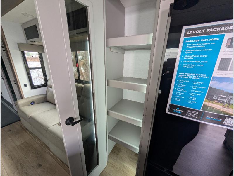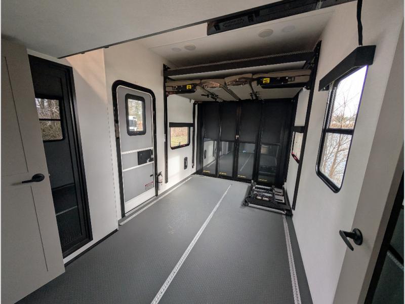 You can bring your toys with you wherever you go with any one of these Alliance RV Valor toy hauler fifth wheels! They are adventure-ready with a quality build from the walk on roof with seamless PVC roof covering to the commercial grade vinyl flooring and MorRyde CRE3000 suspension system. The Performance Running Gear package comes with a 101" wide-body benchmark chassis platform, 7,000 lb. Dexter axles, and a space enhancing drop frame storage compartment to pack in all your riding gear. You can even go off-gridding thanks to the Off the Grid Pack that has two 400-watt solar panels, generator prep, a 60-amp charge controller, and a 100-amp hour lithium iron phosphate battery. Some of the interior comforts you will enjoy are the hardwood cabinet doors and drawers, solid surface kitchen countertops, and commercial grade vinyl flooring with no carpet to make clean up a breeze. The Valor toy haulers are also the Masters of 12 Volt with USB charging station throughout, a 12V refrigerator, and more 12-volt features to make camping hassle-free!