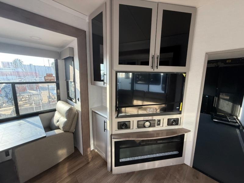 The whole gang will love camping in this toy hauler with a 14' garage for your toys and gear. Once you have arrived at your destination, you can set up the HappiJac roll-over sofas with a queen bed above them, and also a loft which opens to the garage area as well. A half bath is also available off the garage which is an added convenience for those sleeping in this converted area, and for those coming in off the trail so that they do not have to track all through the main unit to use the bathroom. The chef can prepare great meals for their hungry crew with the fully equipped kitchen including a four-burner cooktop, a 12V refrigerator, large sink, and plenty of countertop prep space. The rest of the gang can be relaxing on the large L-shaped sofa slide watching the 50" HDTV and enjoying the fireplace or playing a game of cards at the dining table with four chairs. The front private bedroom features a king bed slide for more interior space, a flip top dresser for all of your belongings, and a front wardrobe with washer and dryer prep, plus it has an entrance into the dual entry bathroom!