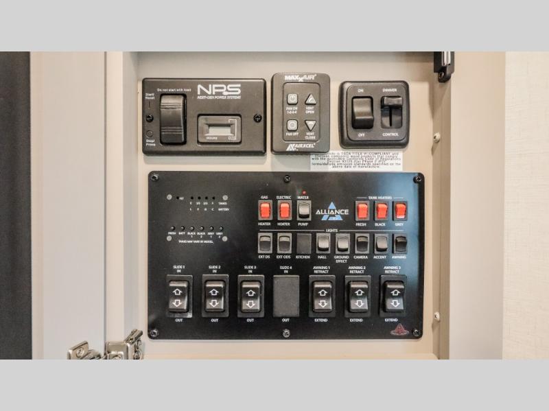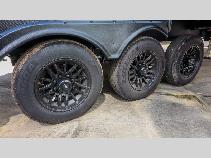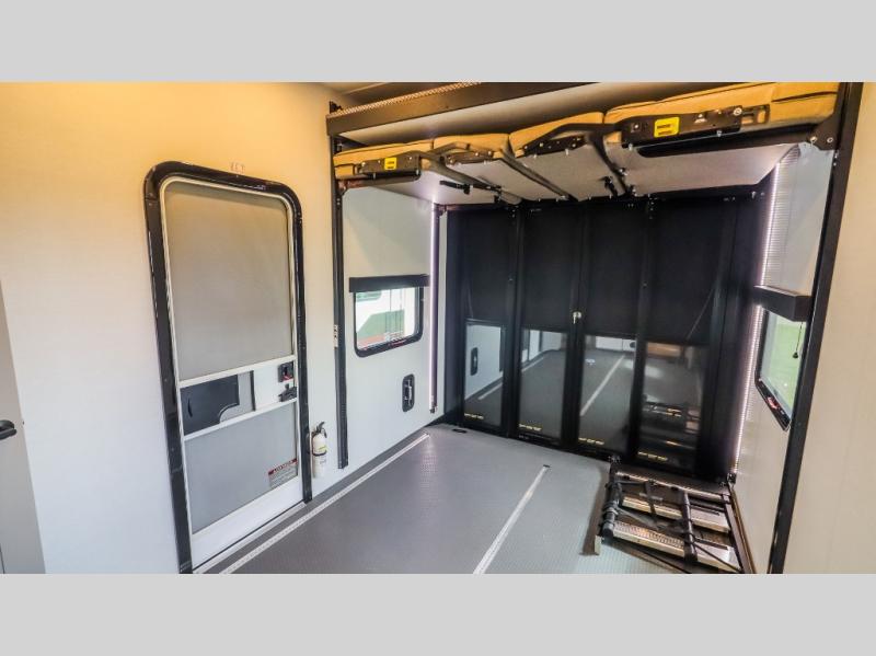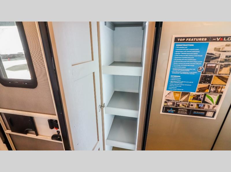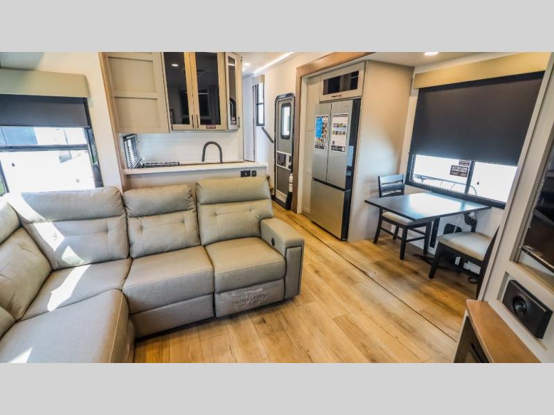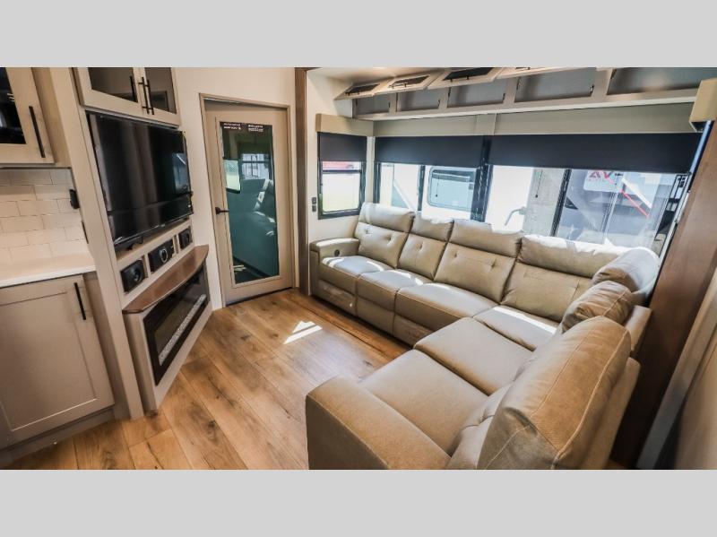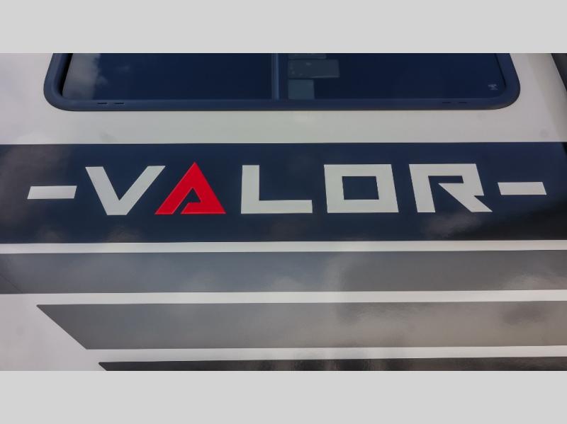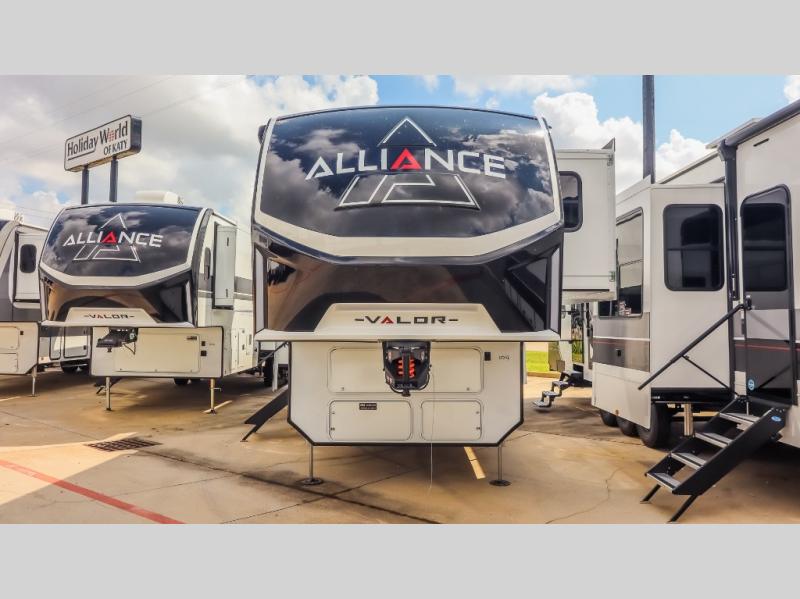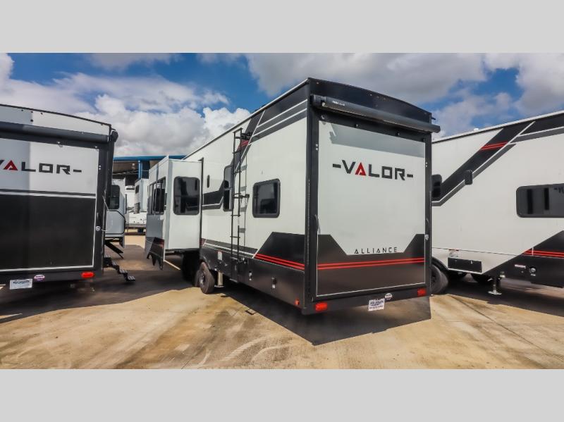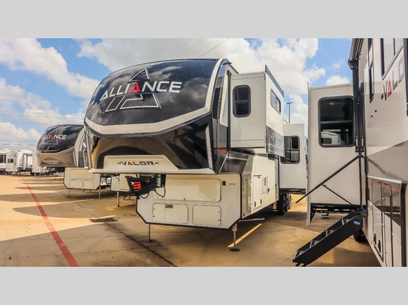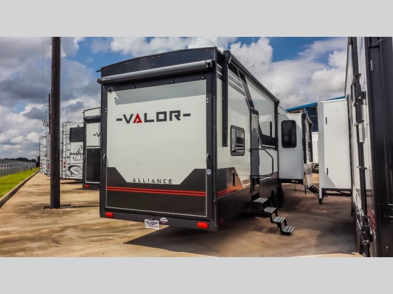 You can bring your toys with you wherever you go with any one of these Alliance RV Valor toy hauler fifth wheels! They are adventure-ready with a quality build from the walk on roof with seamless PVC roof covering to the commercial grade vinyl flooring and MorRyde CRE3000 suspension system. The Performance Running Gear package comes with a 101" wide-body benchmark chassis platform, 7,000 lb. Dexter axles, and a space enhancing drop frame storage compartment to pack in all your riding gear. You can even go off-gridding thanks to the Off the Grid Pack that has two 400-watt solar panels, generator prep, a 60-amp charge controller, and a 100-amp hour lithium iron phosphate battery. Some of the interior comforts you will enjoy are the hardwood cabinet doors and drawers, solid surface kitchen countertops, and commercial grade vinyl flooring with no carpet to make clean up a breeze. The Valor toy haulers are also the Master of 12 Volt with USB charging station throughout, a 12V refrigerator, and more 12-volt features to make camping hassle-free!