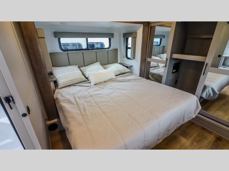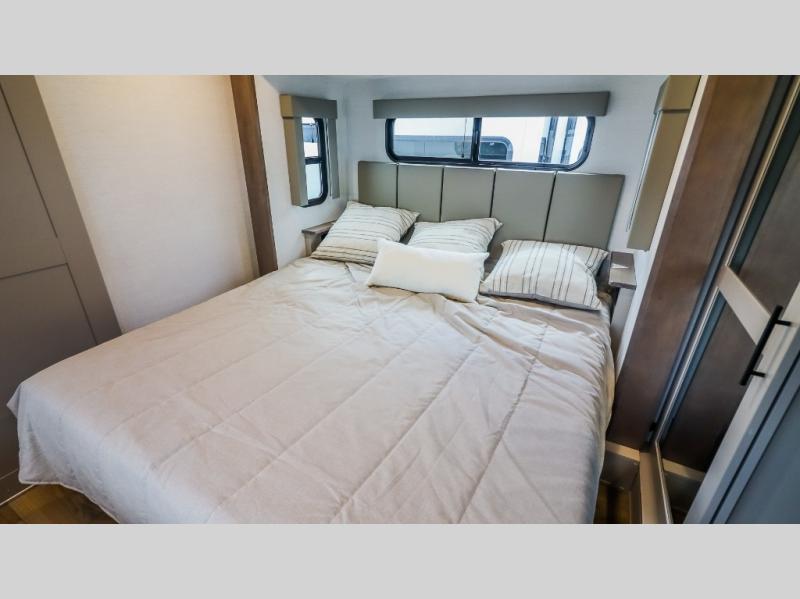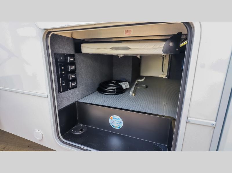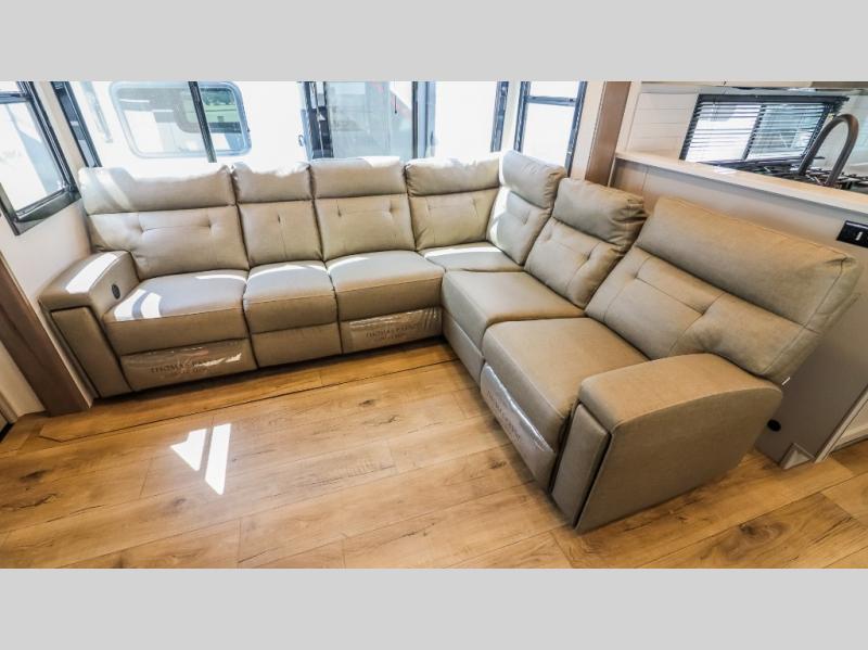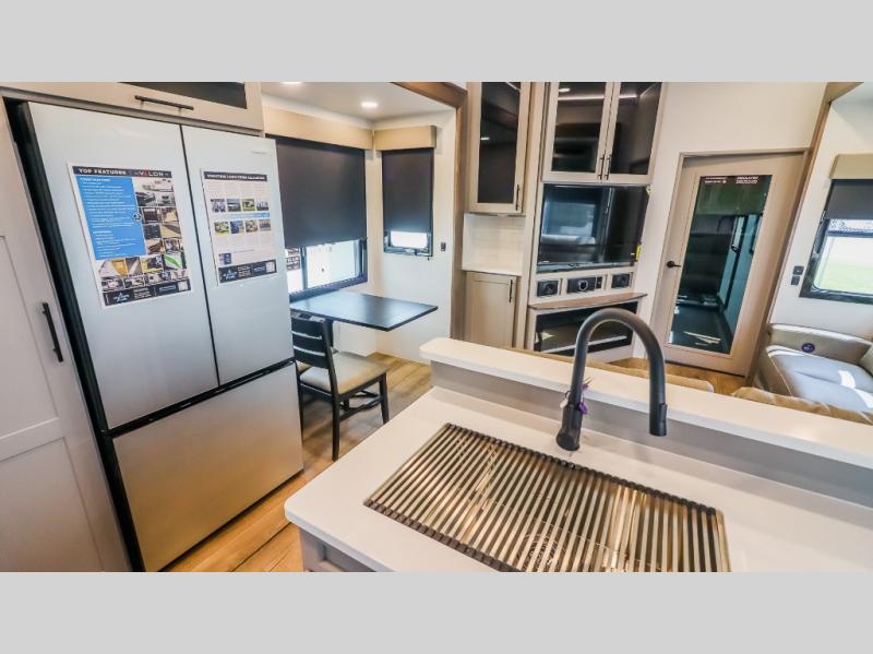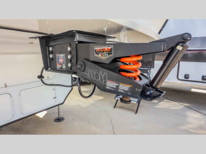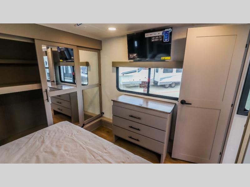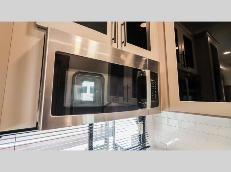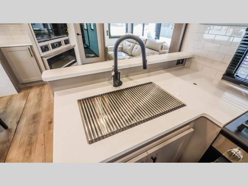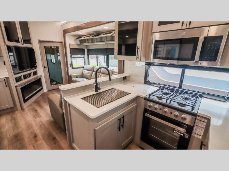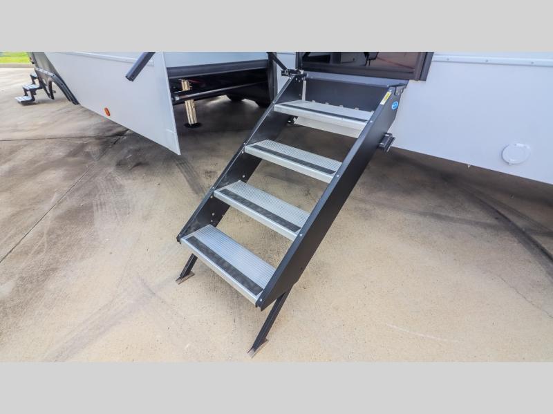 You can bring your toys with you wherever you go with any one of these Alliance RV Valor toy hauler fifth wheels! They are adventure-ready with a quality build from the walk on roof with seamless PVC roof covering to the commercial grade vinyl flooring and MorRyde CRE3000 suspension system. The Performance Running Gear package comes with a 101" wide-body benchmark chassis platform, 7,000 lb. Dexter axles, and a space enhancing drop frame storage compartment to pack in all your riding gear. You can even go off-gridding thanks to the Off the Grid Pack that has two 400-watt solar panels, generator prep, a 60-amp charge controller, and a 100-amp hour lithium iron phosphate battery. Some of the interior comforts you will enjoy are the hardwood cabinet doors and drawers, solid surface kitchen countertops, and commercial grade vinyl flooring with no carpet to make clean up a breeze. The Valor toy haulers are also the Master of 12 Volt with USB charging station throughout, a 12V refrigerator, and more 12-volt features to make camping hassle-free!