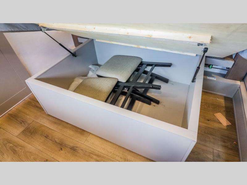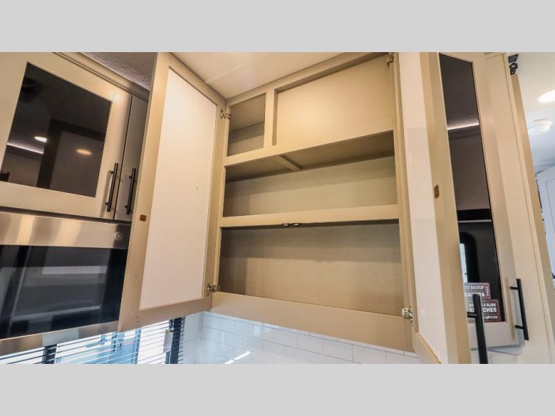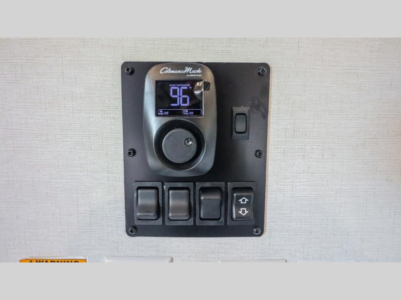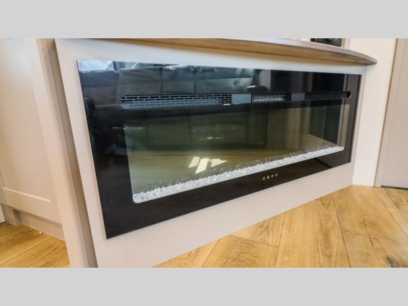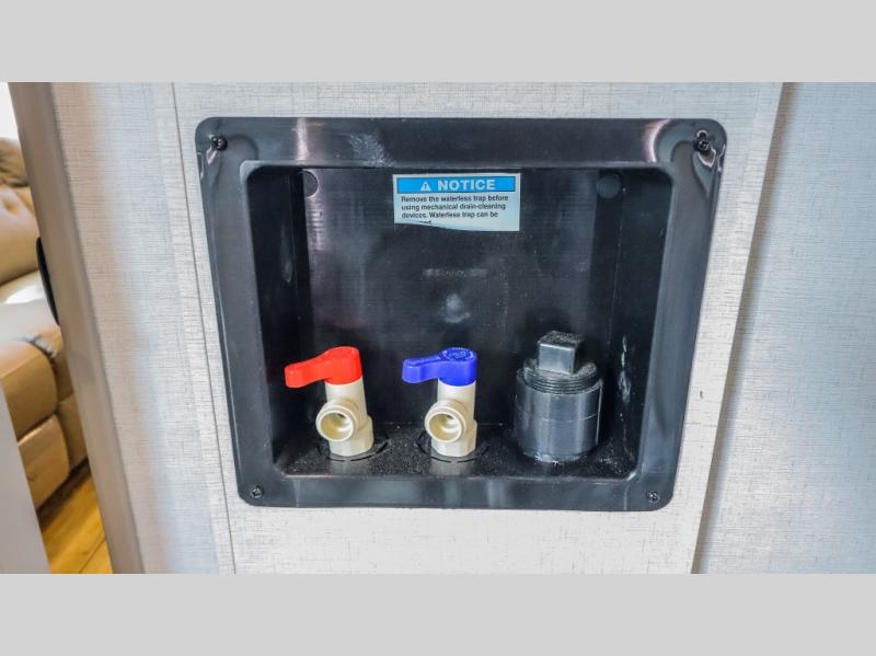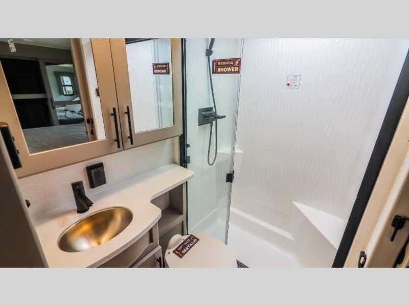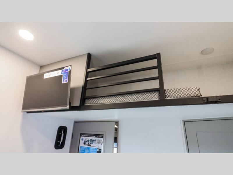 The whole gang will love camping in this toy hauler with a 14' garage for your toys and gear. Once you have arrived at your destination, you can set up the HappiJac roll-over sofas with a queen bed above them, and also a loft which opens to the garage area as well. A half bath is also available off the garage which is an added convenience for those sleeping in this converted area, and for those coming in off the trail so that they do not have to track all through the main unit to use the bathroom. The chef can prepare great meals for their hungry crew with the fully equipped kitchen including a four-burner cooktop, a 12V refrigerator, large sink, and plenty of countertop prep space. The rest of the gang can be relaxing on the large L-shaped sofa slide watching the 50" HDTV and enjoying the fireplace or playing a game of cards at the dining table with four chairs. The front private bedroom features a king bed slide for more interior space, a flip top dresser for all of your belongings, and a front wardrobe with washer and dryer prep, plus it has an entrance into the dual entry bathroom!