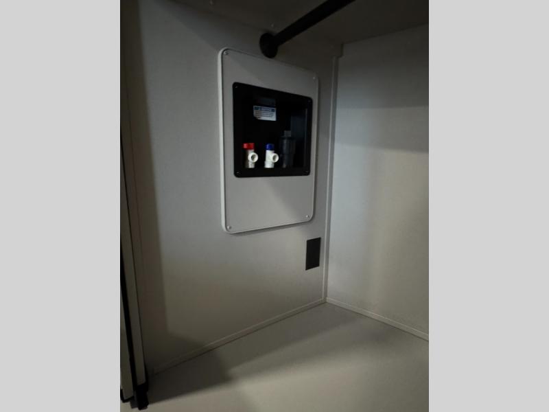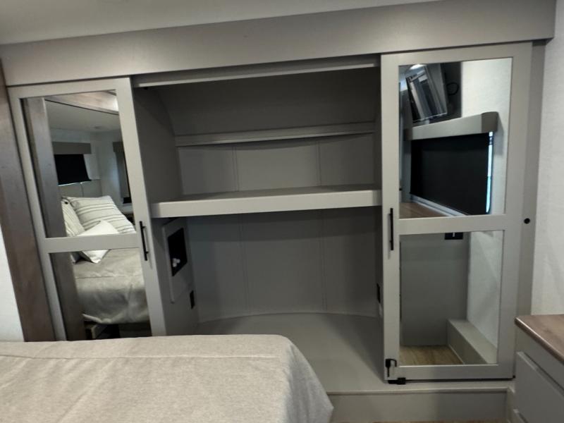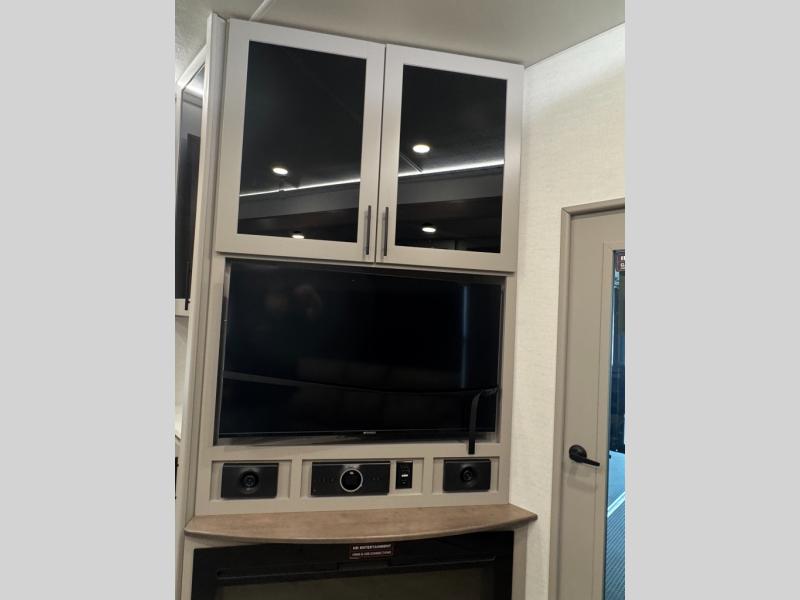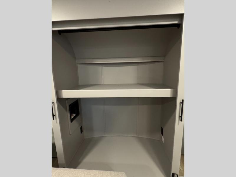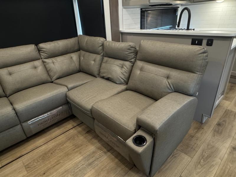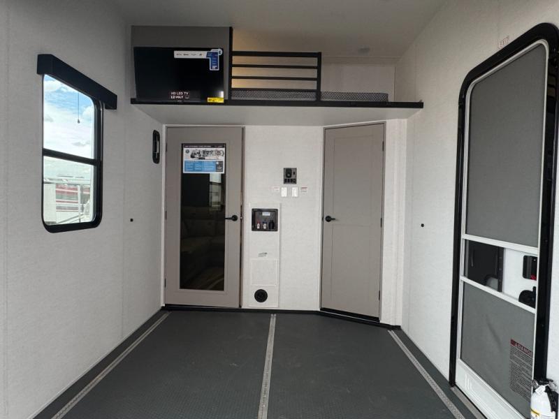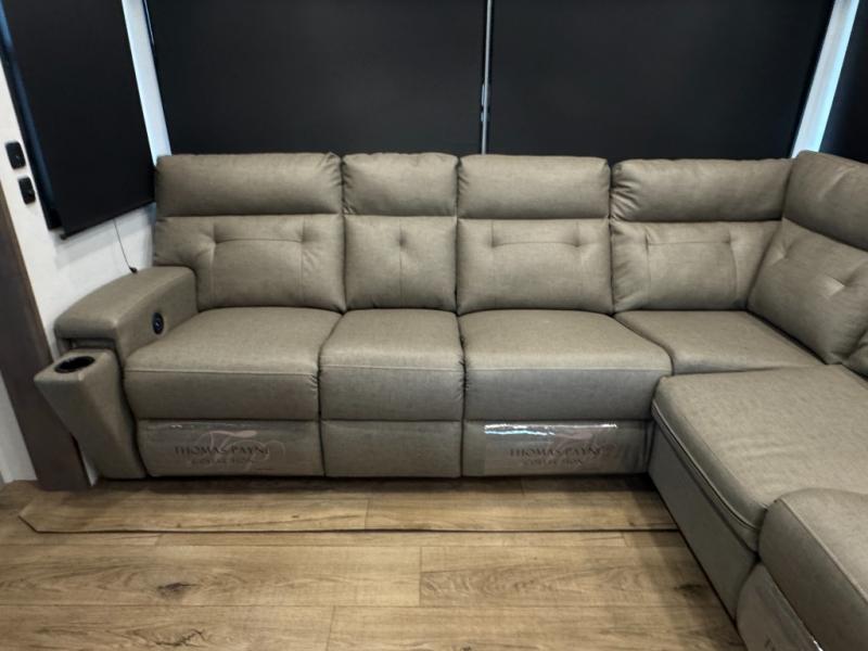 The whole gang will love camping in this toy hauler with a 14' garage for your toys and gear. Once you have arrived at your destination, you can set up the HappiJac roll-over sofas with a queen bed above them, and also a loft which opens to the garage area as well. A half bath is also available off the garage which is an added convenience for those sleeping in this converted area, and for those coming in off the trail so that they do not have to track all through the main unit to use the bathroom. The chef can prepare great meals for their hungry crew with the fully equipped kitchen including a four burner cooktop, a stainless steel 12V refrigerator, large sink, and plenty of countertop prep space. The rest of the gang can be relaxing on the large L-shaped sofa slide watching the 50" HDTV and enjoying the fireplace, or playing a game of cards at the dining table with four chairs. The front private bedroom features a king bed slide for more interior space, a flip top dresser for all of your belongings, and a front wardrobe with washer and dryer prep, plus it has an entrance into the dual entry bathroom!