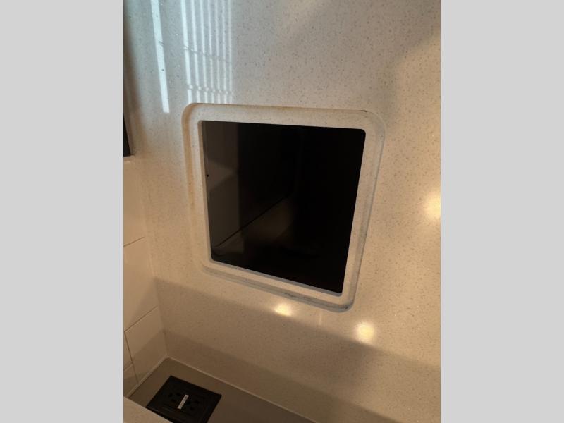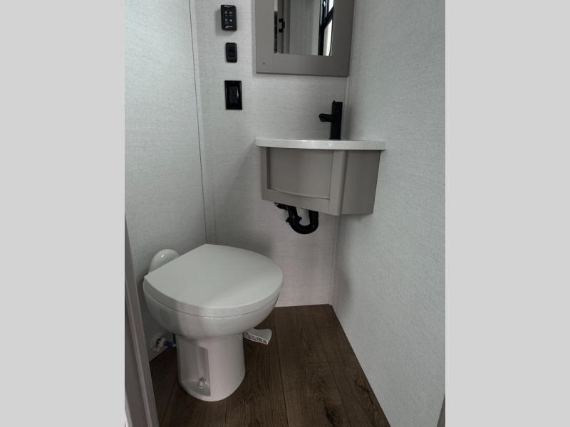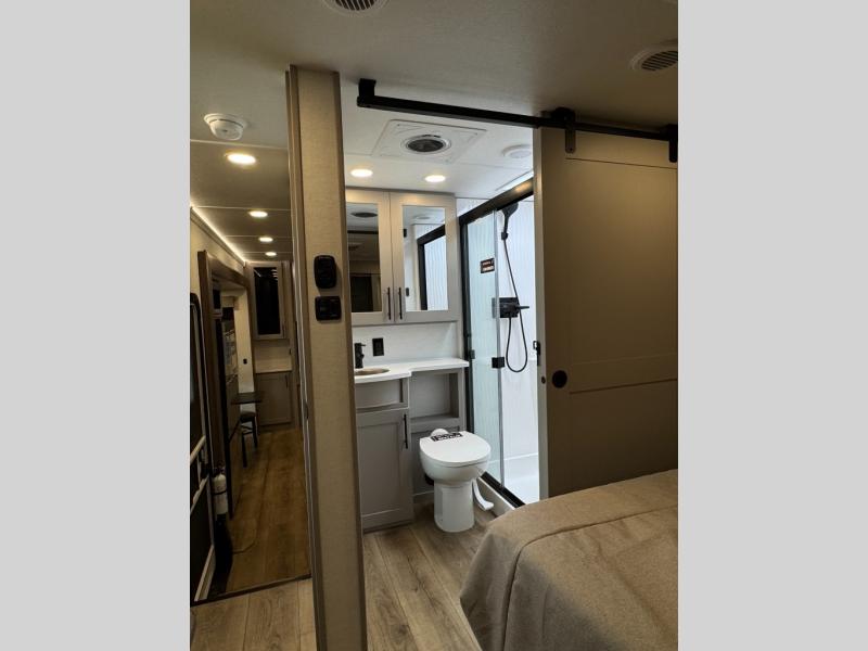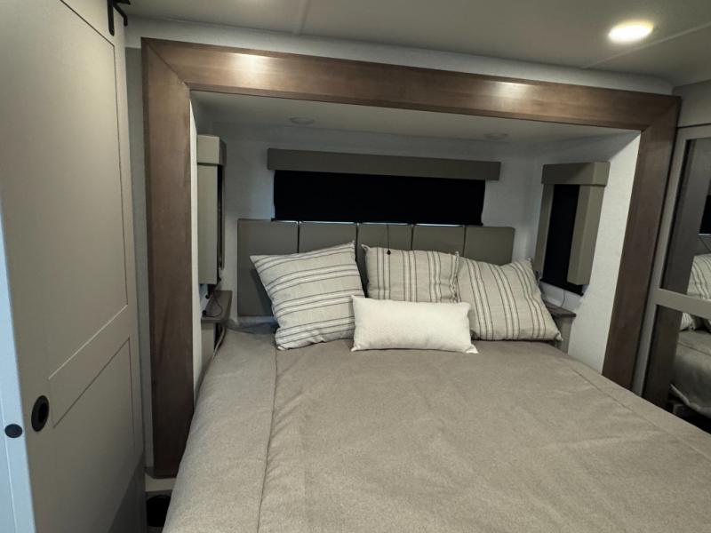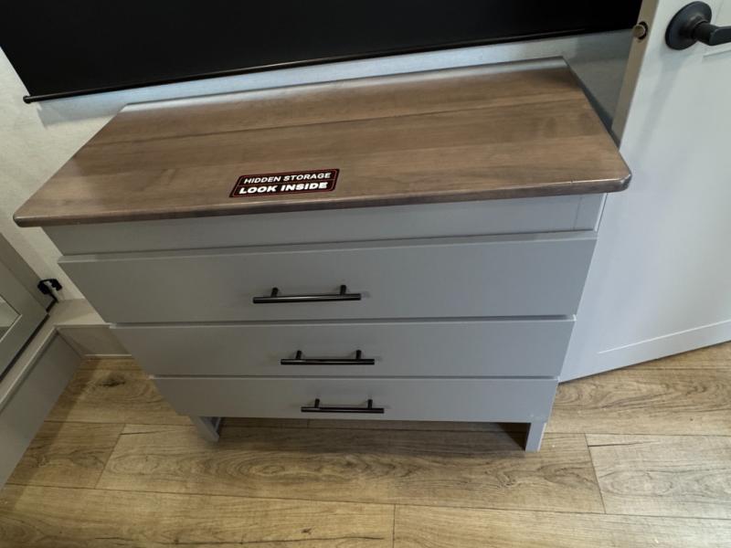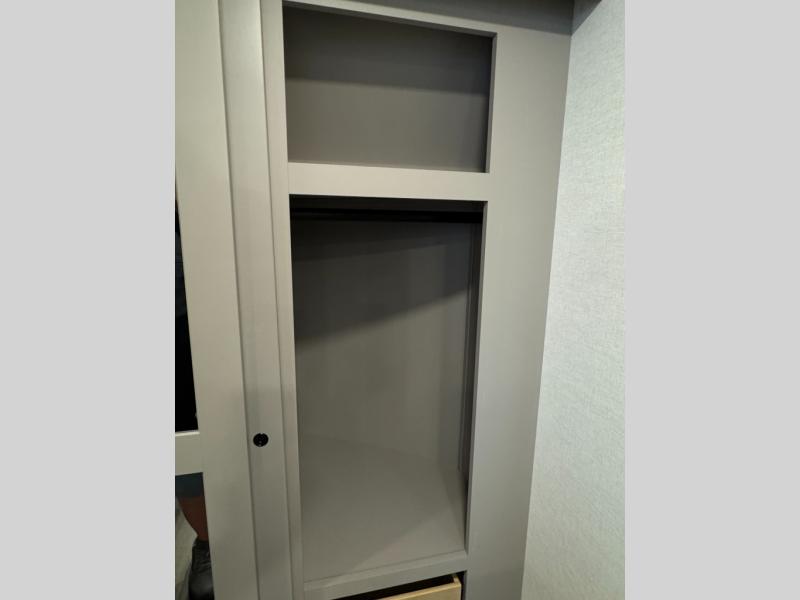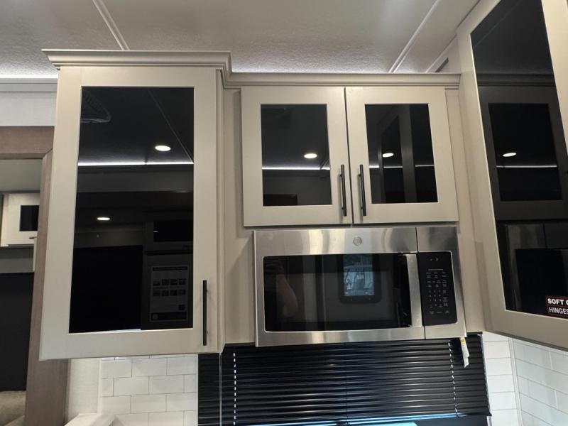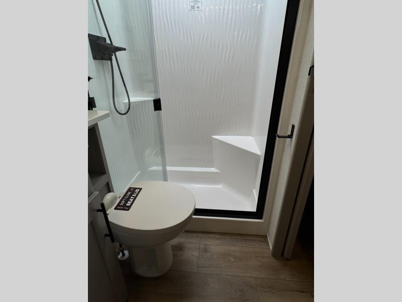 The whole gang will love camping in this toy hauler with a 14' garage for your toys and gear. Once you have arrived at your destination, you can set up the HappiJac roll-over sofas with a queen bed above them, and also a loft which opens to the garage area as well. A half bath is also available off the garage which is an added convenience for those sleeping in this converted area, and for those coming in off the trail so that they do not have to track all through the main unit to use the bathroom. The chef can prepare great meals for their hungry crew with the fully equipped kitchen including a four burner cooktop, a stainless steel 12V refrigerator, large sink, and plenty of countertop prep space. The rest of the gang can be relaxing on the large L-shaped sofa slide watching the 50" HDTV and enjoying the fireplace, or playing a game of cards at the dining table with four chairs. The front private bedroom features a king bed slide for more interior space, a flip top dresser for all of your belongings, and a front wardrobe with washer and dryer prep, plus it has an entrance into the dual entry bathroom!