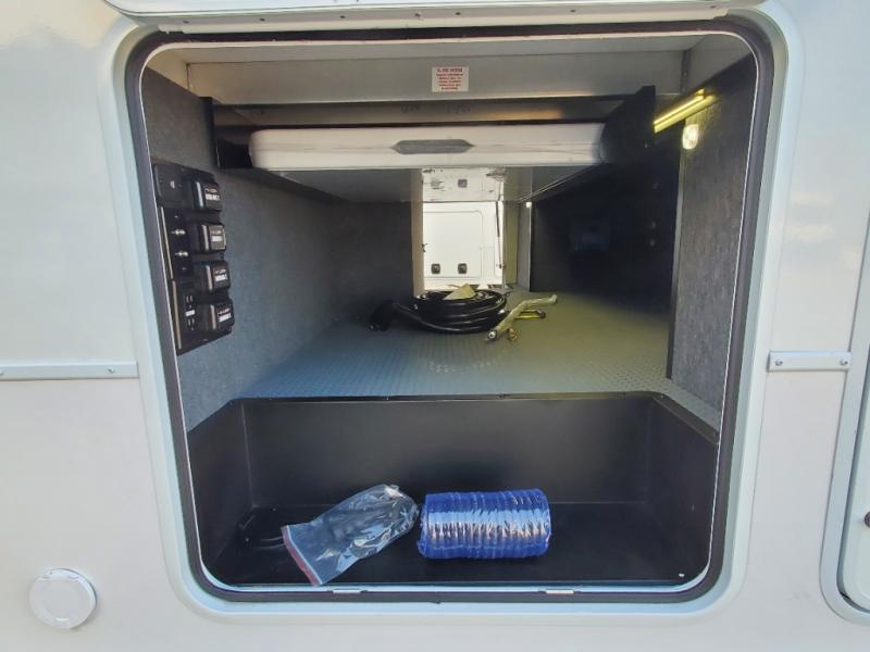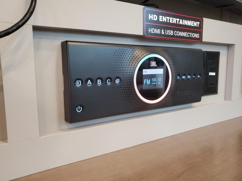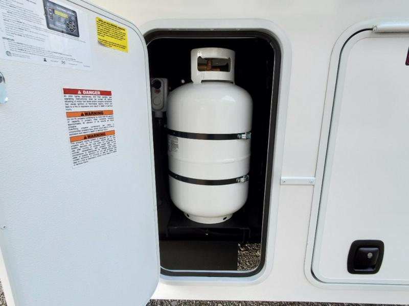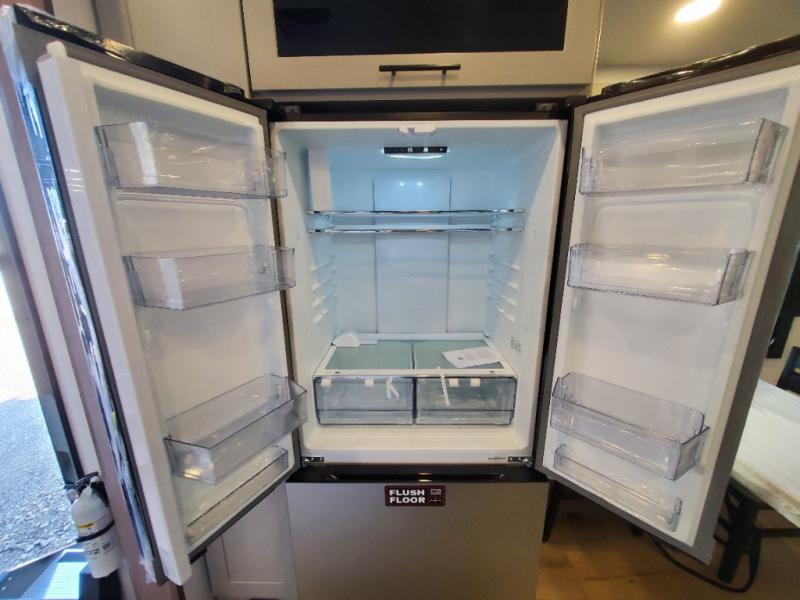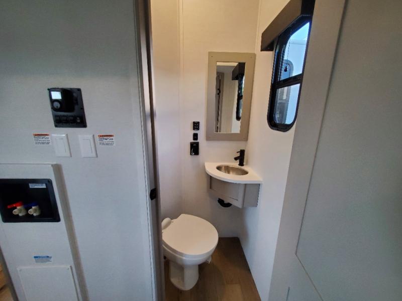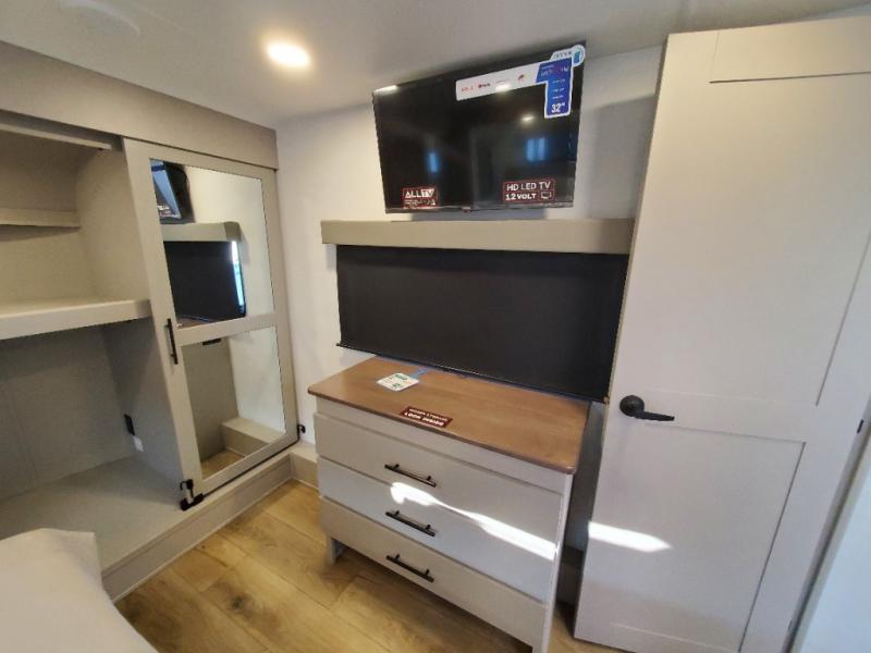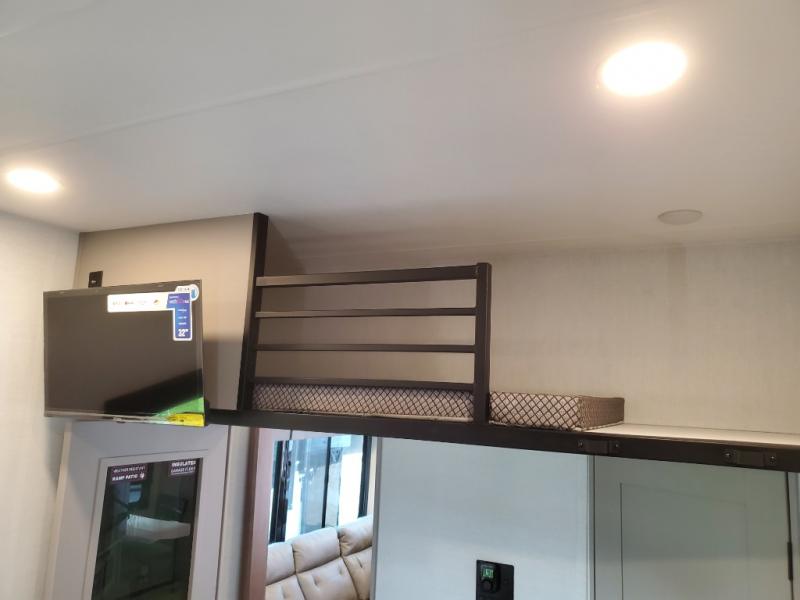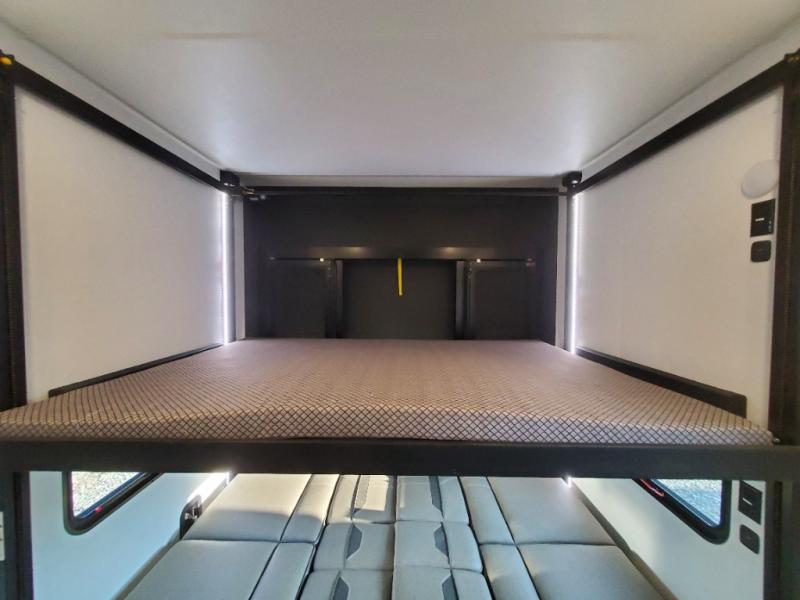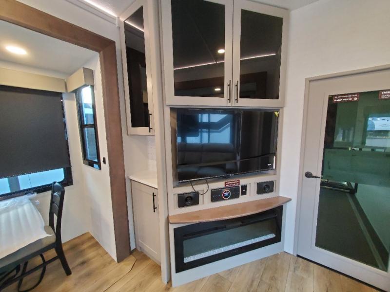 The whole gang will love camping in this toy hauler with a 14' garage for your toys and gear. Once you have arrived at your destination, you can set up the HappiJac roll-over sofas with a queen bed above them, and also a loft which opens to the garage area as well. A half bath is also available off the garage which is an added convenience for those sleeping in this converted area, and for those coming in off the trail so that they do not have to track all through the main unit to use the bathroom. The chef can prepare great meals for their hungry crew with the fully equipped kitchen including a four burner cooktop, a stainless steel 12V refrigerator, large sink, and plenty of countertop prep space. The rest of the gang can be relaxing on the large L-shaped sofa slide watching the 50" HDTV and enjoying the fireplace, or playing a game of cards at the dining table with four chairs. The front private bedroom features a king bed slide for more interior space, a flip top dresser for all of your belongings, and a front wardrobe with washer and dryer prep, plus it has an entrance into the dual entry bathroom!