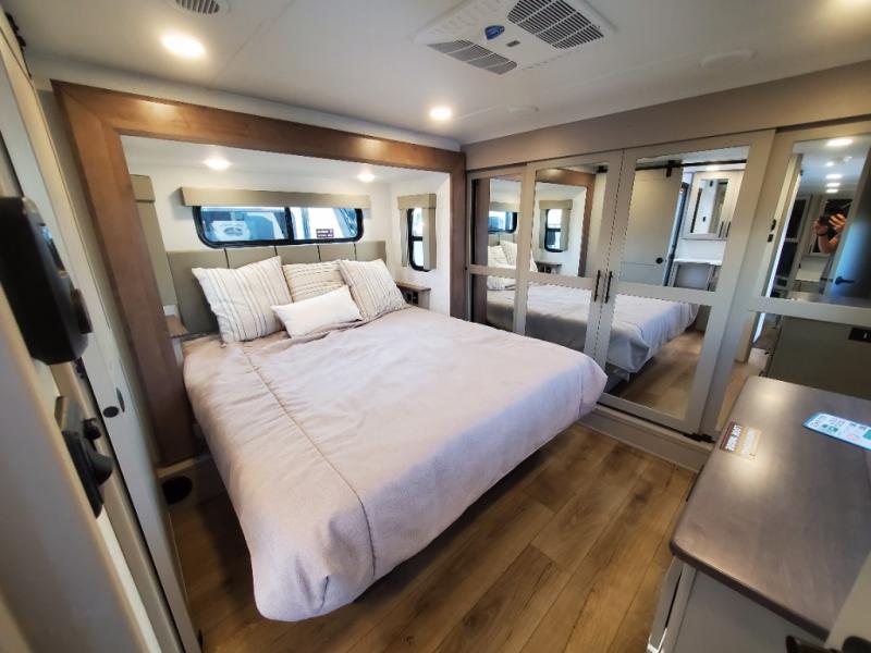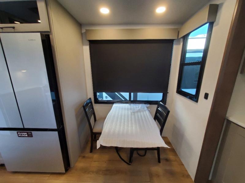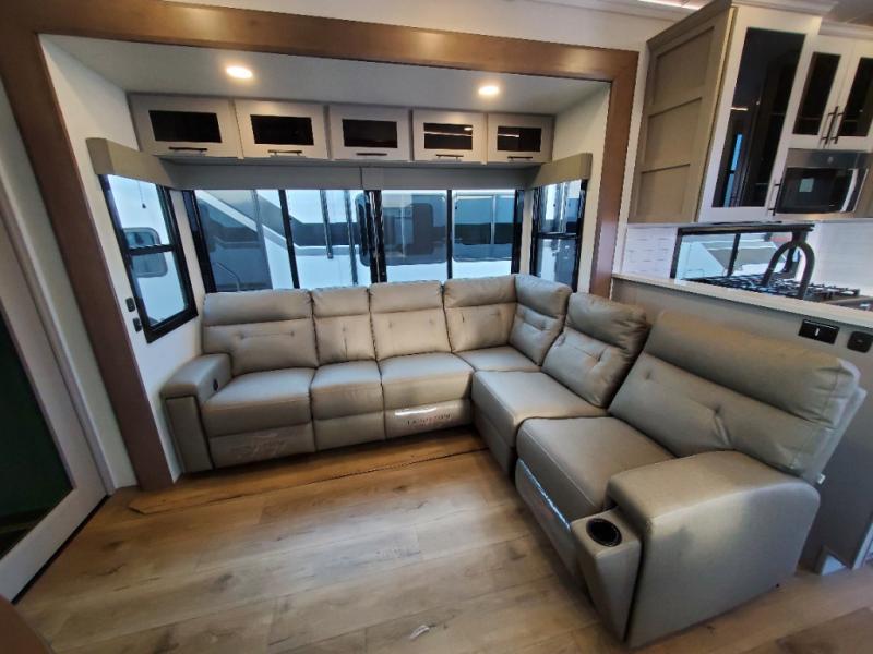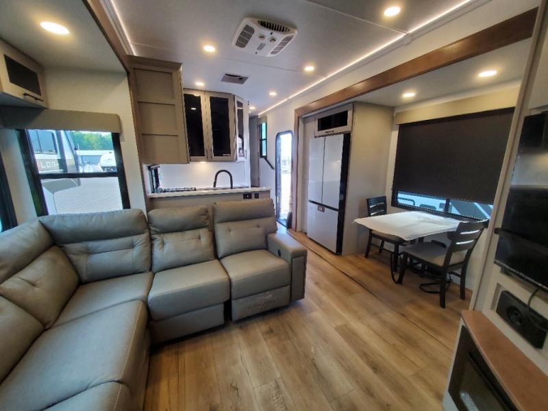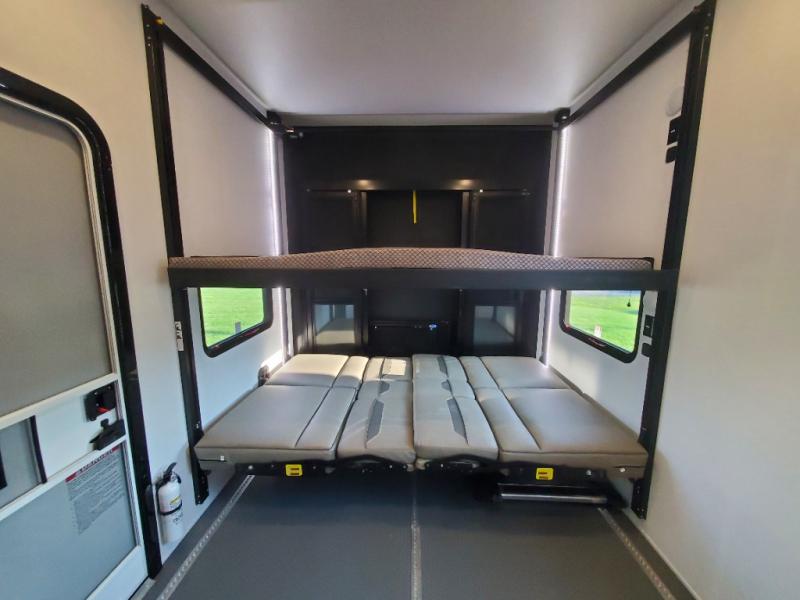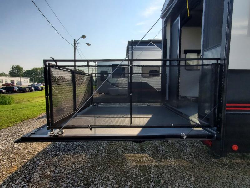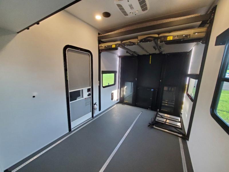 You can bring your toys with you wherever you go with any one of these Alliance RV Valor toy hauler fifth wheels! They are adventure-ready with a quality build from the walk on roof with seamless PVC roof covering to the commercial grade vinyl flooring and MorRyde CRE3000 suspension system. The Performance Running Gear package comes with a 101" wide-body benchmark chassis platform, 7,000 lb. Dexter axles, and a space enhancing drop frame storage compartment to pack in all your riding gear. You can even go off-gridding thanks to the Off the Grid Pack that has two 400 watt solar panels, generator prep, a 40 amp charge controller, and a 100 amp hour lithium iron phosphate battery. Some of the interior comforts you will enjoy are the hardwood cabinet doors and drawers, solid surface kitchen countertops, and commercial grade vinyl flooring with no carpet to make clean up a breeze. The Valor toy haulers are also the Master of 12 Volt with USB charging station throughout, a stainless steel refrigerator, and more 12 volt features to make camping hassle-free!