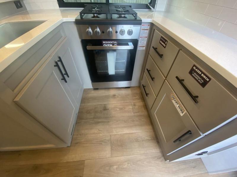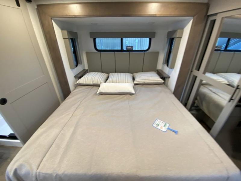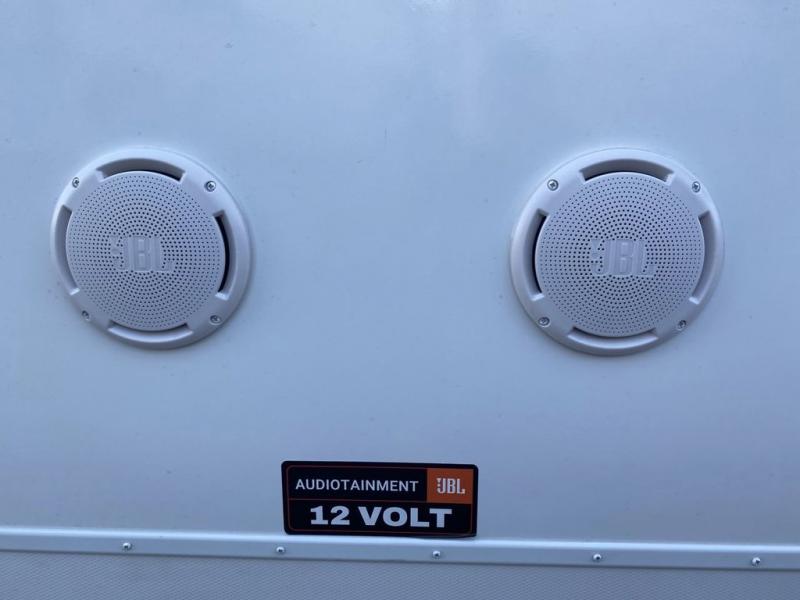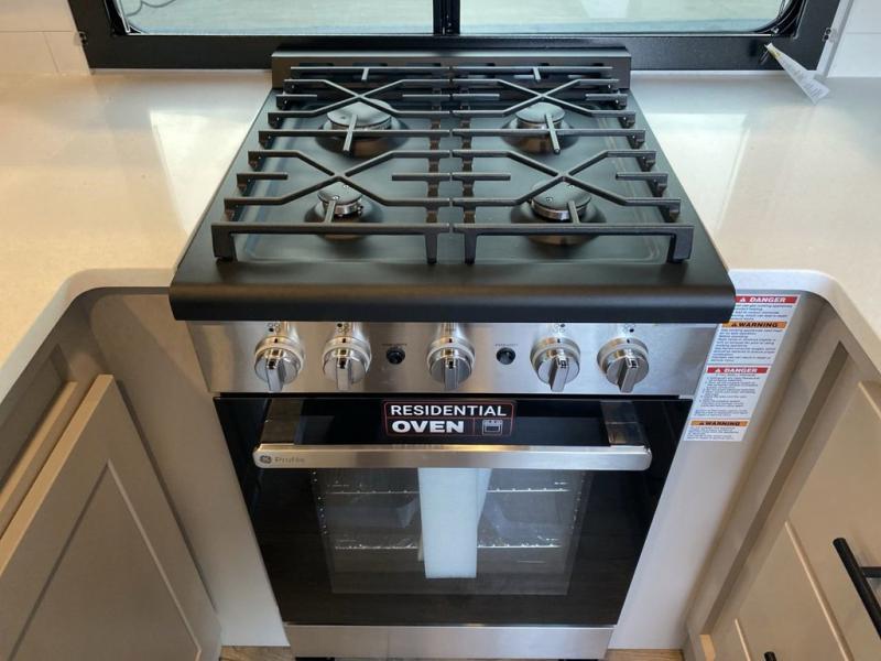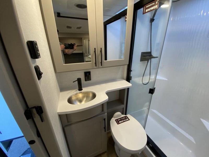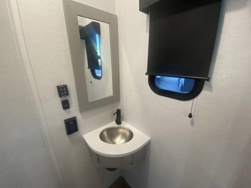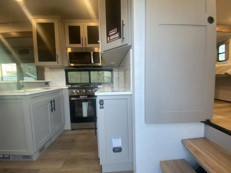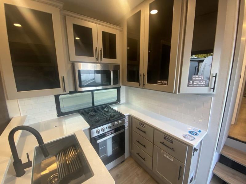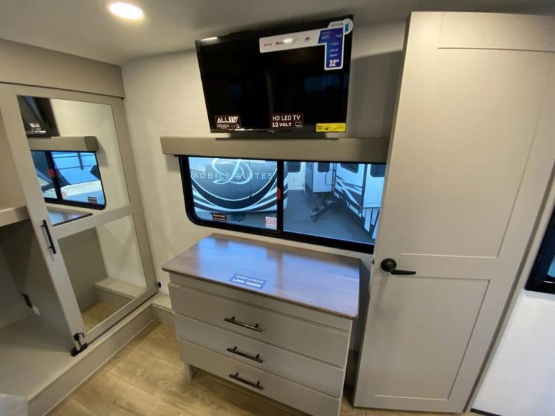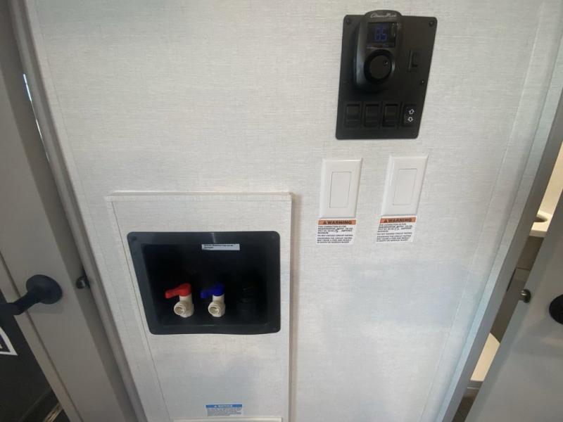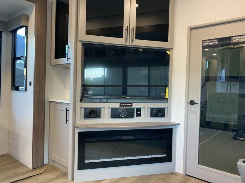The whole gang will love camping in this toy hauler with a 14' garage for your toys and gear. Once you have arrived at your destination, you can set up the HappiJac roll-over sofas with a queen bed above them, and also a loft which opens to the garage area as well. A half bath is also available off the garage which is an added convenience for those sleeping in this converted area, and for those coming in off the trail so that they do not have to track all through the main unit to use the bathroom. The chef can prepare great meals for their hungry crew with the fully equipped kitchen including a four burner cooktop, a stainless steel 12V refrigerator, large sink, and plenty of countertop prep space. The rest of the gang can be relaxing on the large L-shaped sofa slide watching the 50" HDTV and enjoying the fireplace, or playing a game of cards at the dining table with four chairs. The front private bedroom features a king bed slide for more interior space, a flip top dresser for all of your belongings, and a front wardrobe with washer and dryer prep, plus it has an entrance into the dual entry bathroom!