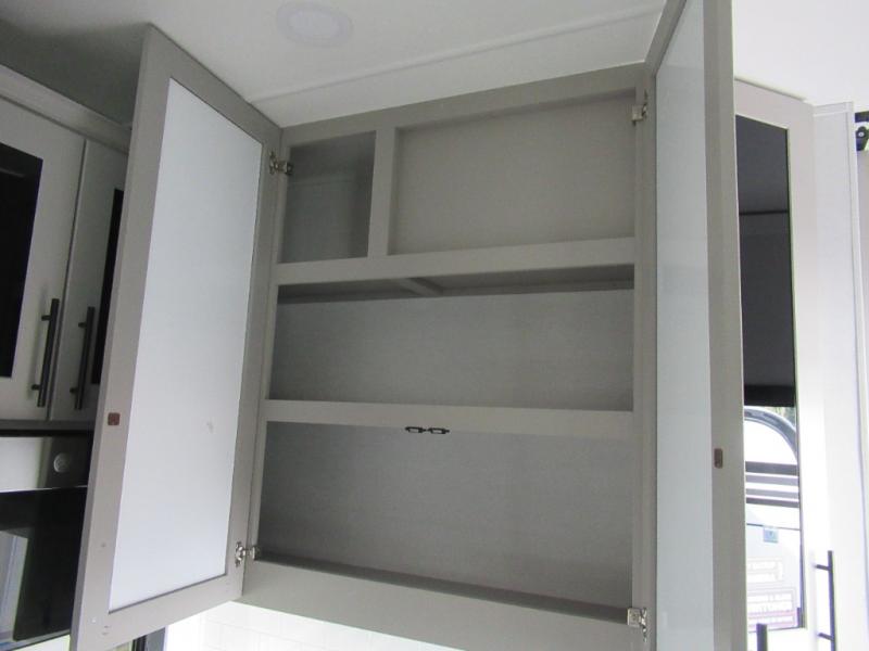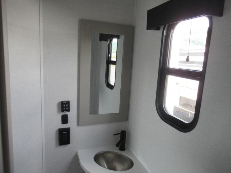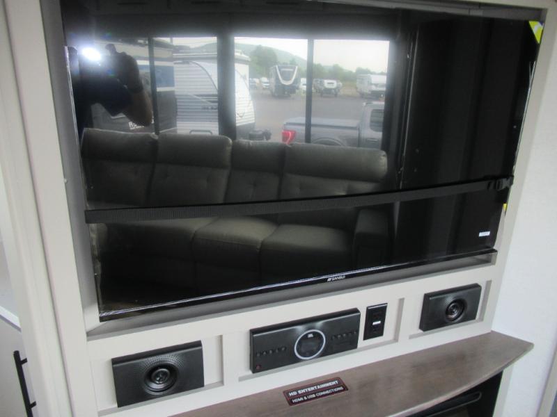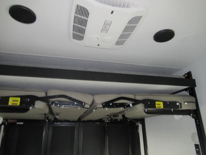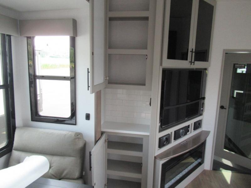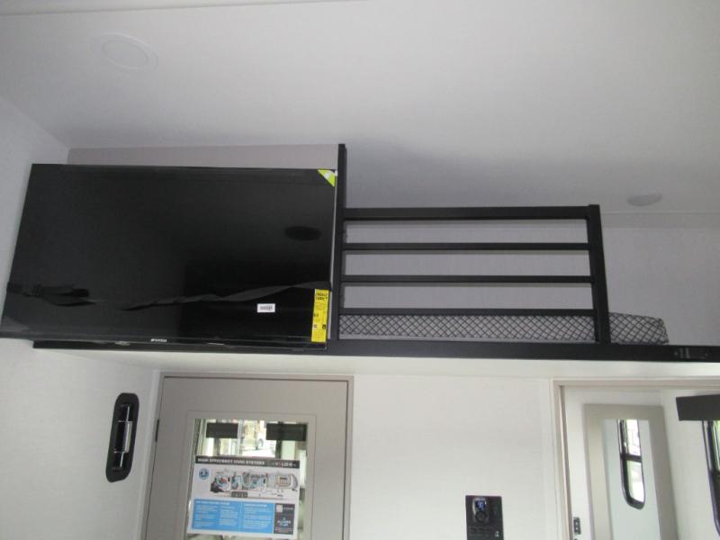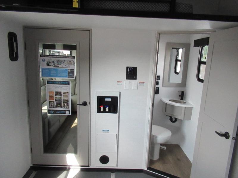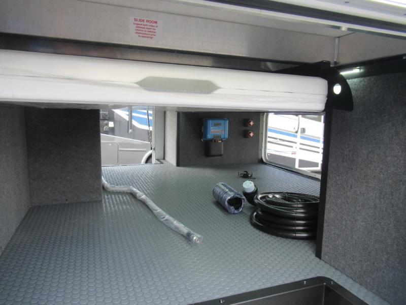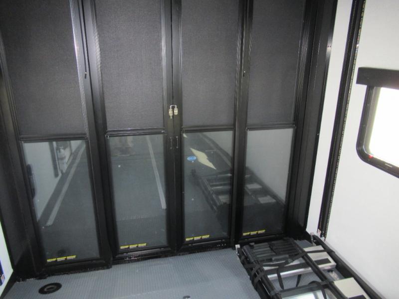 The whole gang will love camping in this toy hauler with a 14' garage for your toys and gear. Once you have arrived at your destination, you can set up the HappiJac roll-over sofas with a queen bed above them, and also a loft which opens to the garage area as well. A half bath is also available off the garage which is an added convenience for those sleeping in this converted area, and for those coming in off the trail so that they do not have to track all through the main unit to use the bathroom. The chef can prepare great meals for their hungry crew with the fully equipped kitchen including a four burner cooktop, a stainless steel 12V refrigerator, large sink, and plenty of countertop prep space. The rest of the gang can be relaxing on the large L-shaped sofa slide watching the 50" HDTV and enjoying the fireplace, or playing a game of cards at the dining table with four chairs. The front private bedroom features a king bed slide for more interior space, a flip top dresser for all of your belongings, and a front wardrobe with washer and dryer prep, plus it has an entrance into the dual entry bathroom!