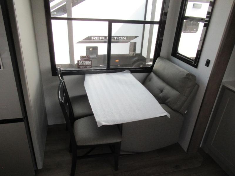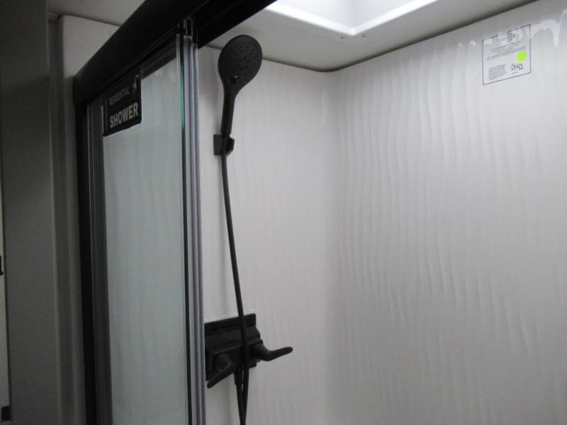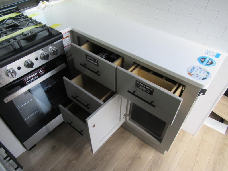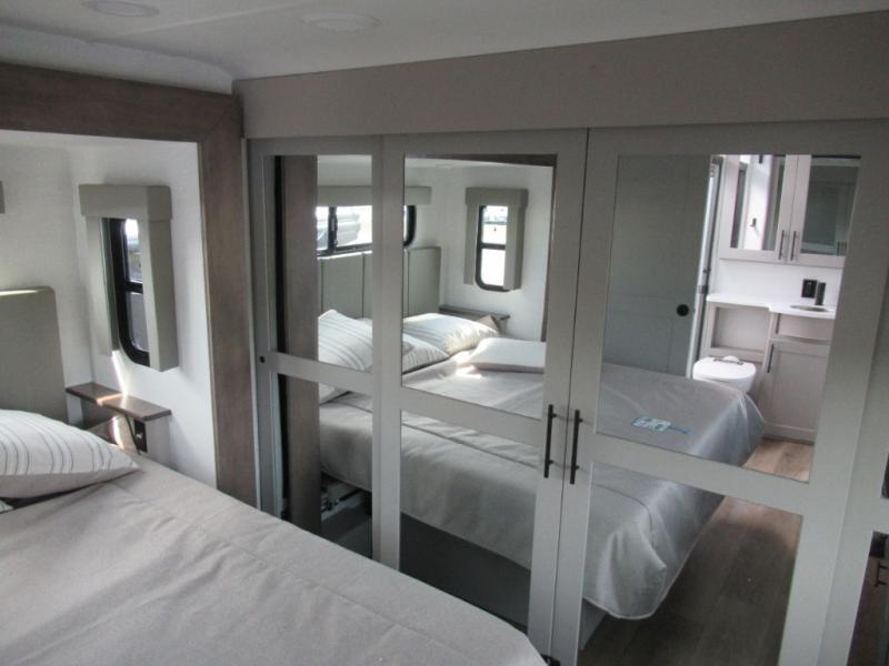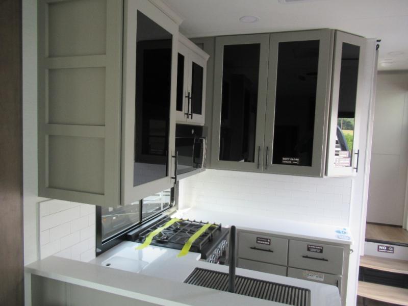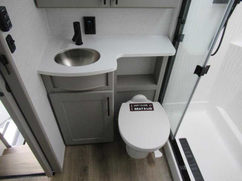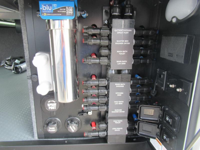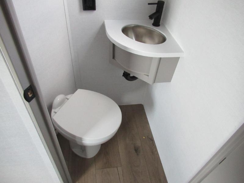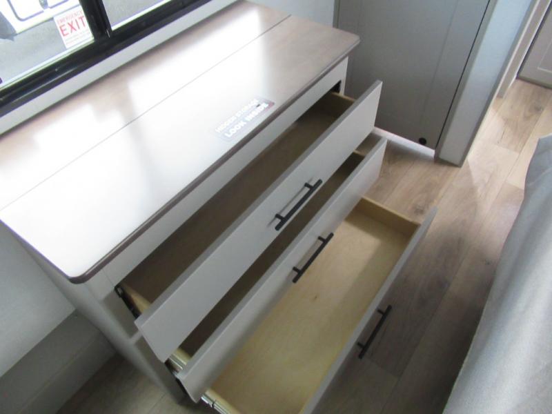 The whole gang will love camping in this toy hauler with a 14' garage for your toys and gear. Once you have arrived at your destination, you can set up the HappiJac roll-over sofas with a queen bed above them, and also a loft which opens to the garage area as well. A half bath is also available off the garage which is an added convenience for those sleeping in this converted area, and for those coming in off the trail so that they do not have to track all through the main unit to use the bathroom. The chef can prepare great meals for their hungry crew with the fully equipped kitchen including a four burner cooktop, a stainless steel 12V refrigerator, large sink, and plenty of countertop prep space. The rest of the gang can be relaxing on the large L-shaped sofa slide watching the 50" HDTV and enjoying the fireplace, or playing a game of cards at the dining table with four chairs. The front private bedroom features a king bed slide for more interior space, a flip top dresser for all of your belongings, and a front wardrobe with washer and dryer prep, plus it has an entrance into the dual entry bathroom!