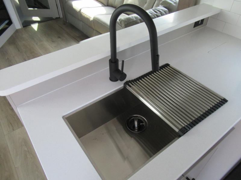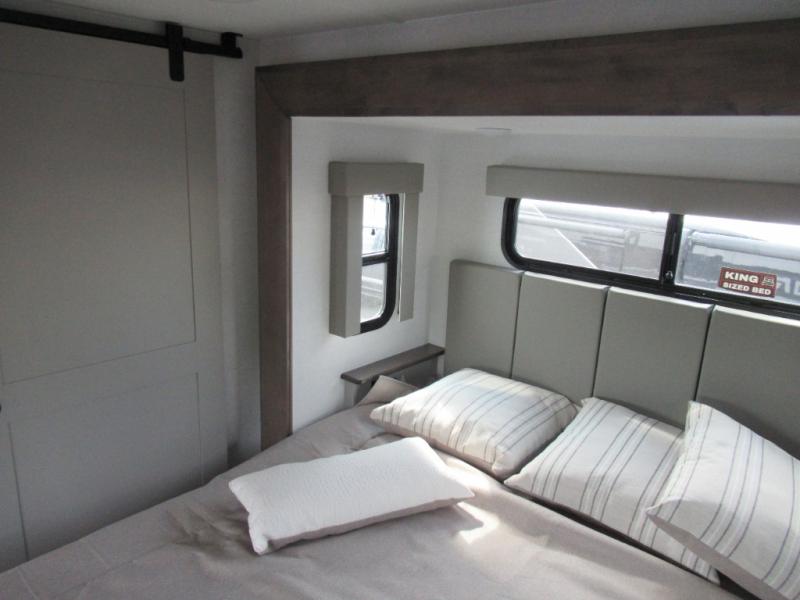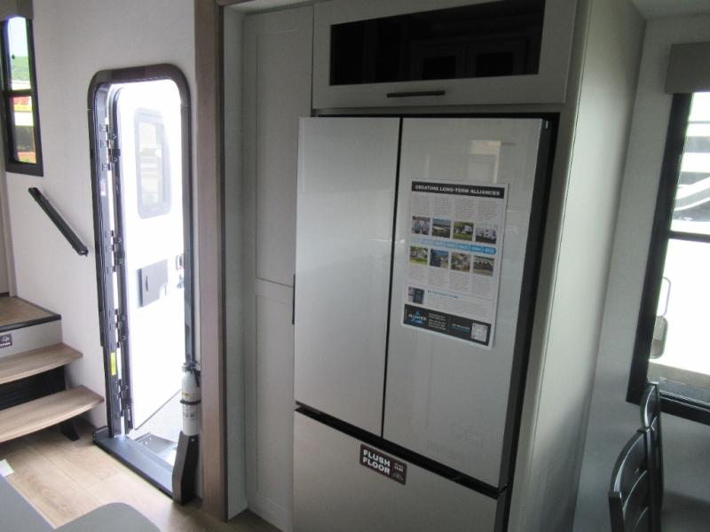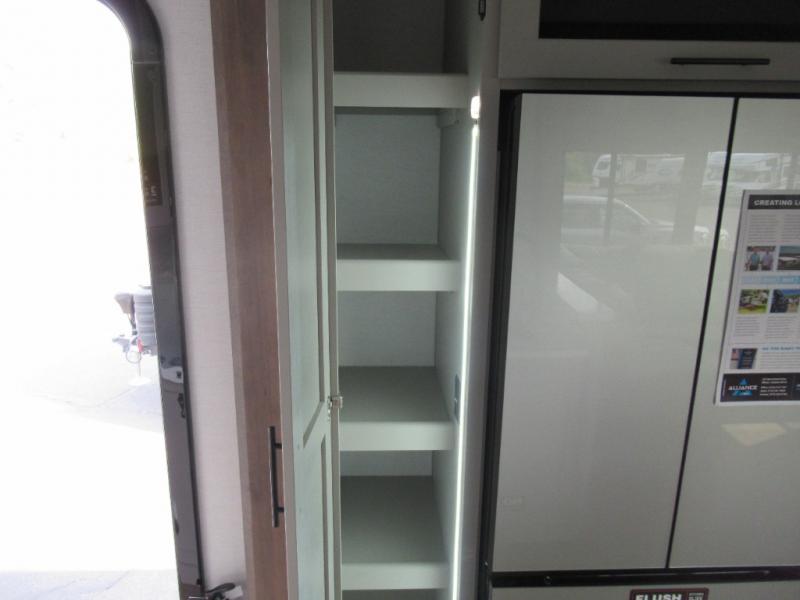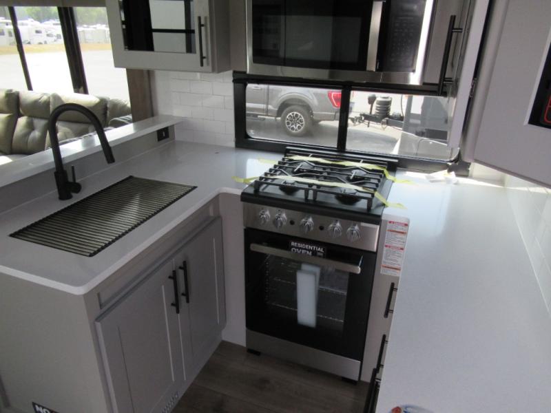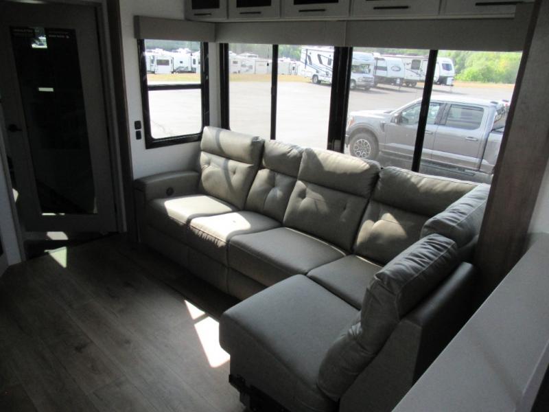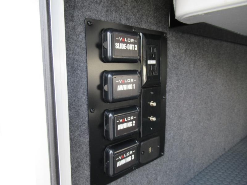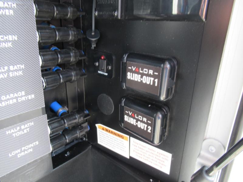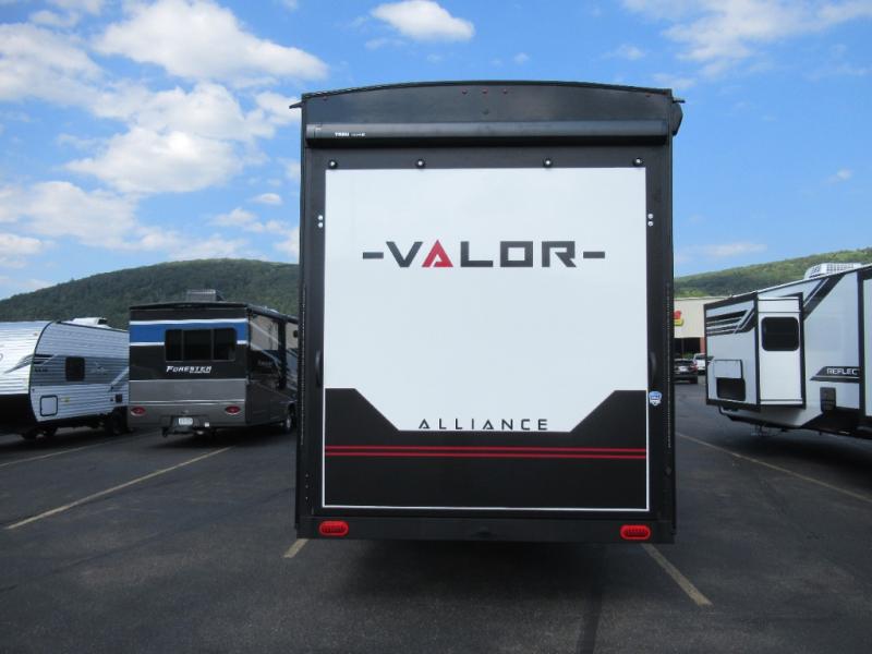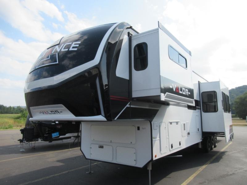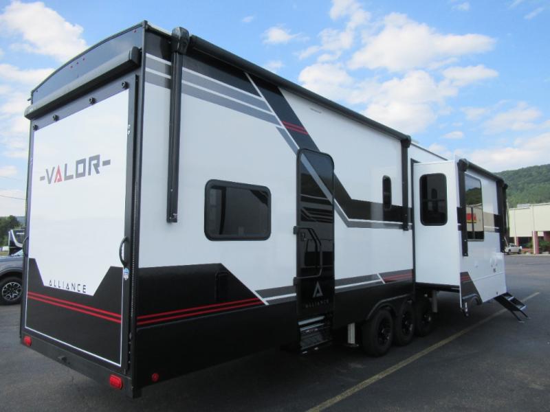 You can bring your toys with you wherever you go with any one of these Alliance RV Valor toy hauler fifth wheels! They are adventure-ready with a quality build from the walk on roof with seamless PVC roof covering to the commercial grade vinyl flooring and MorRyde CRE3000 suspension system. The Performance Running Gear package comes with a 101" wide-body benchmark chassis platform, 7,000 lb. Dexter axles, and a space enhancing drop frame storage compartment to pack in all your riding gear. You can even go off-gridding thanks to the Off the Grid Pack that has two 400 watt solar panels, generator prep, a 40 amp charge controller, and a 100 amp hour lithium iron phosphate battery. Some of the interior comforts you will enjoy are the hardwood cabinet doors and drawers, solid surface kitchen countertops, and commercial grade vinyl flooring with no carpet to make clean up a breeze. The Valor toy haulers are also the Master of 12 Volt with USB charging station throughout, a stainless steel refrigerator, and more 12 volt features to make camping hassle-free!