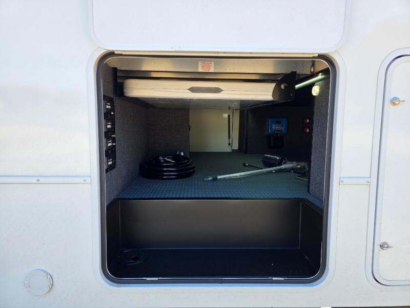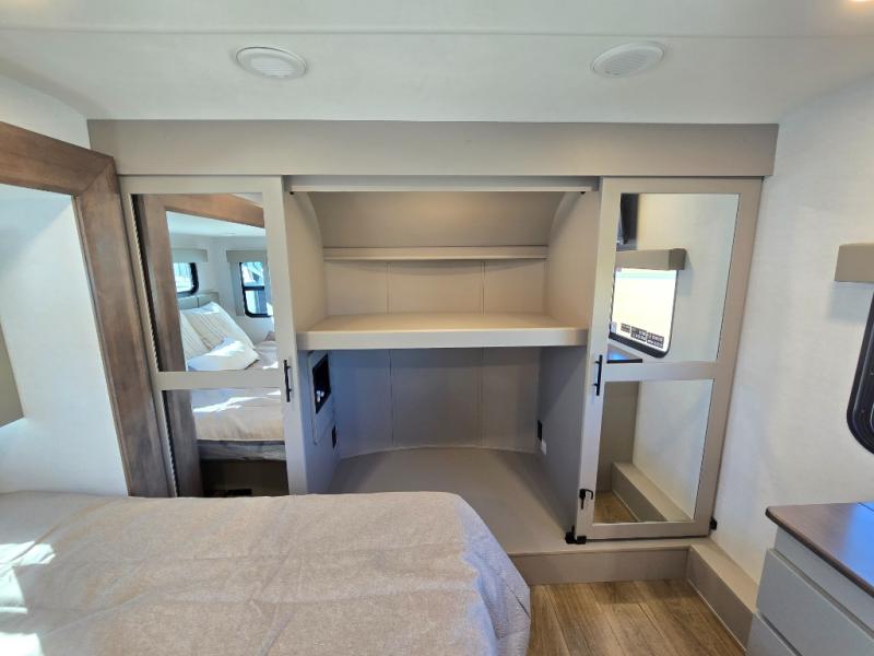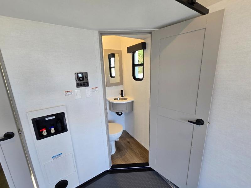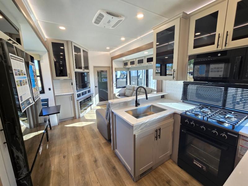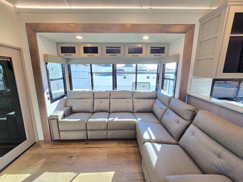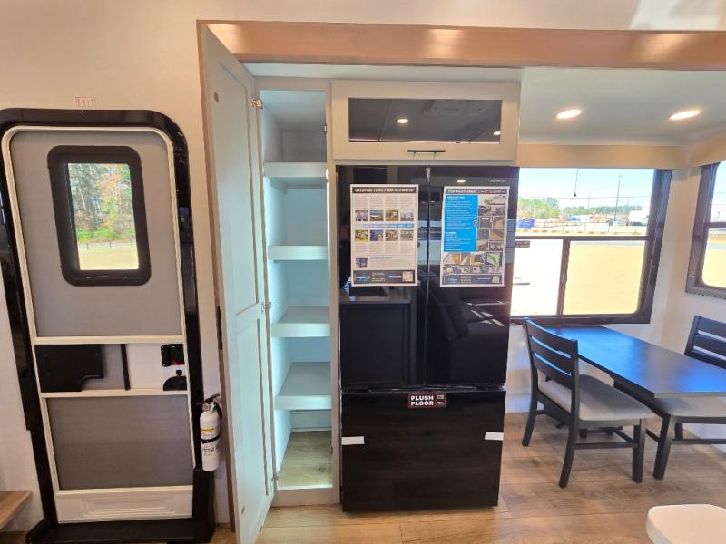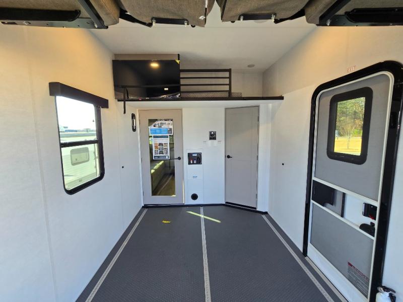The whole gang will love camping in this toy hauler with a 14' garage for your toys and gear. Once you have arrived at your destination, you can set up the HappiJac roll-over sofas with a queen bed above them, and also a loft which opens to the garage area as well. A half bath is also available off the garage which is an added convenience for those sleeping in this converted area, and for those coming in off the trail so that they do not have to track all through the main unit to use the bathroom. The chef can prepare great meals for their hungry crew with the fully equipped kitchen including a four burner cooktop, a stainless steel 12V refrigerator, large sink, and plenty of countertop prep space. The rest of the gang can be relaxing on the large L-shaped sofa slide watching the 50" HDTV and enjoying the fireplace, or playing a game of cards at the dining table with four chairs. The front private bedroom features a king bed slide for more interior space, a flip top dresser for all of your belongings, and a front wardrobe with washer and dryer prep, plus it has an entrance into the dual entry bathroom!