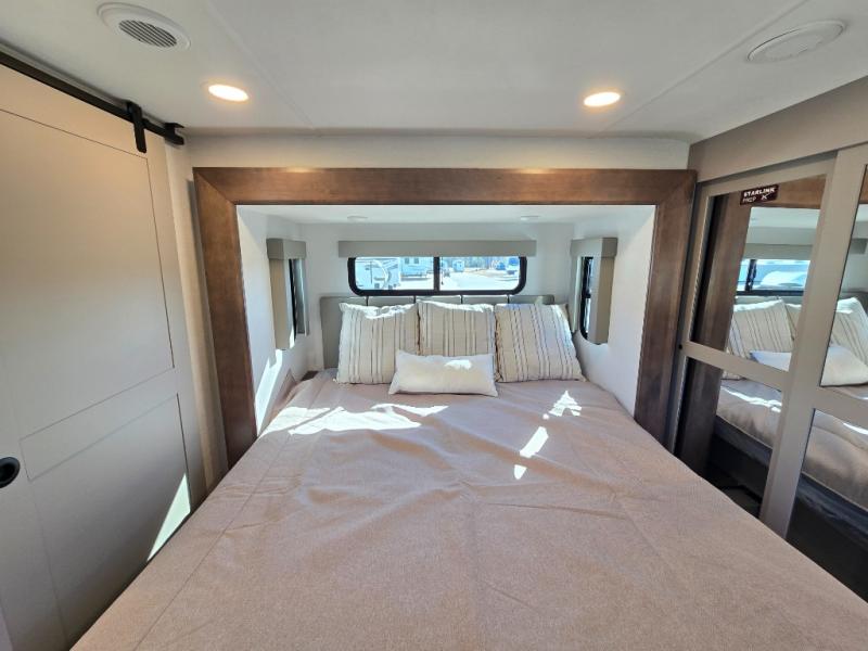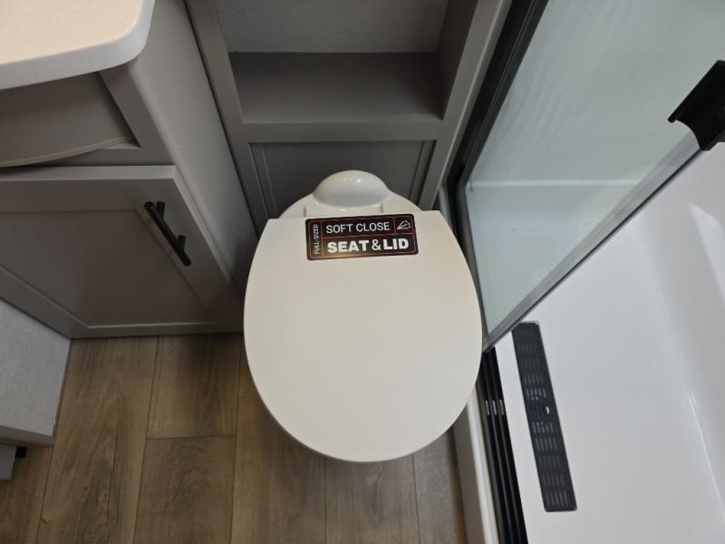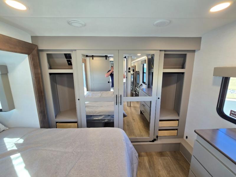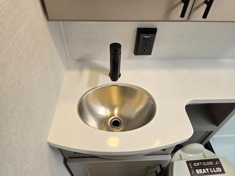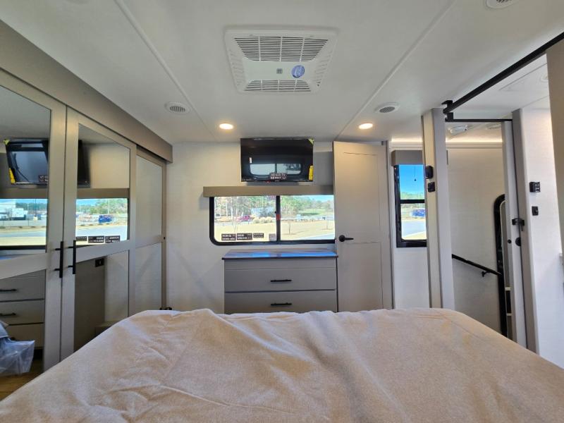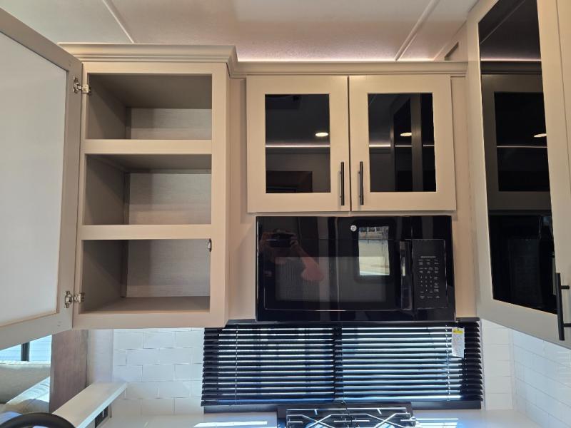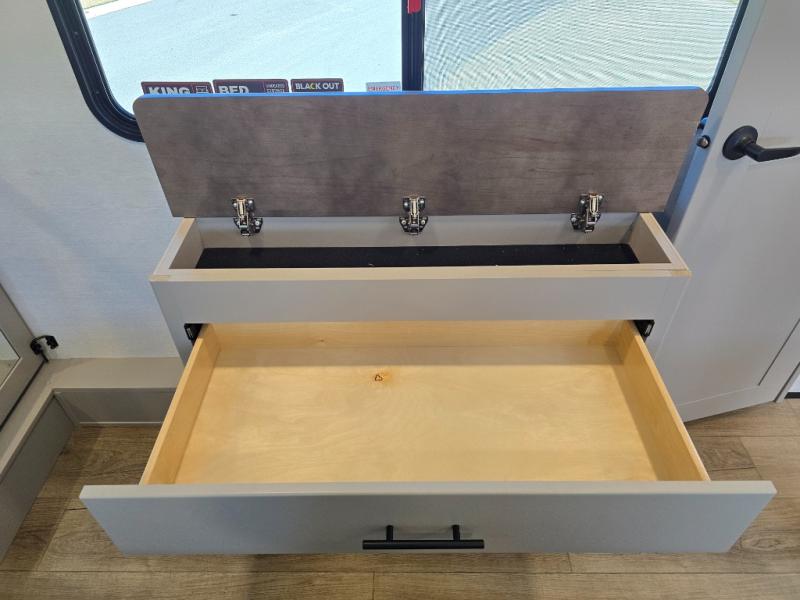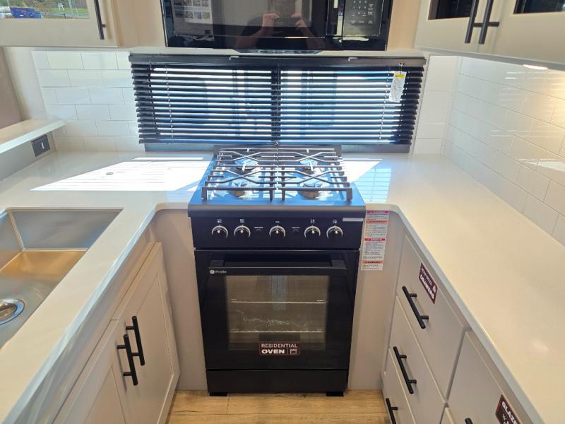 The whole gang will love camping in this toy hauler with a 14' garage for your toys and gear. Once you have arrived at your destination, you can set up the HappiJac roll-over sofas with a queen bed above them, and also a loft which opens to the garage area as well. A half bath is also available off the garage which is an added convenience for those sleeping in this converted area, and for those coming in off the trail so that they do not have to track all through the main unit to use the bathroom. The chef can prepare great meals for their hungry crew with the fully equipped kitchen including a four burner cooktop, a stainless steel 12V refrigerator, large sink, and plenty of countertop prep space. The rest of the gang can be relaxing on the large L-shaped sofa slide watching the 50" HDTV and enjoying the fireplace, or playing a game of cards at the dining table with four chairs. The front private bedroom features a king bed slide for more interior space, a flip top dresser for all of your belongings, and a front wardrobe with washer and dryer prep, plus it has an entrance into the dual entry bathroom!