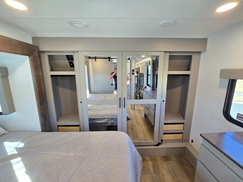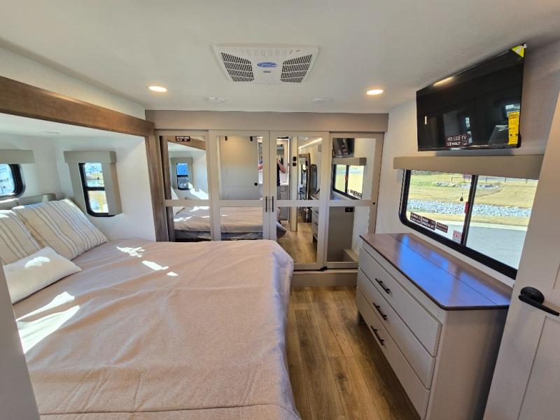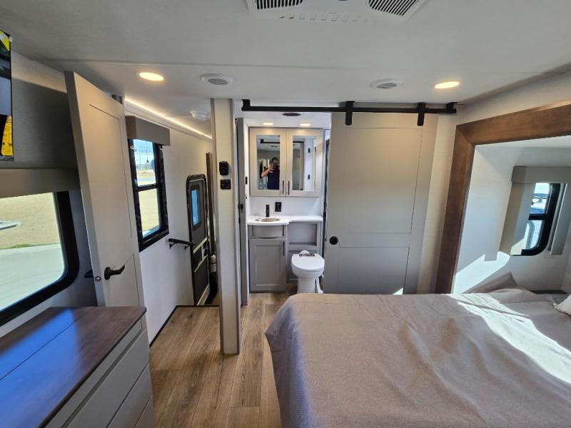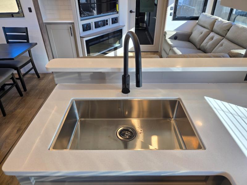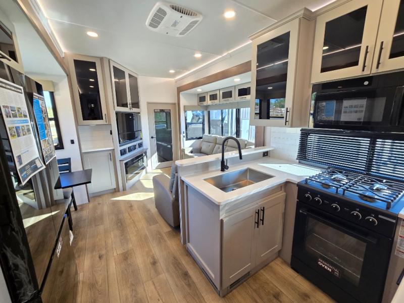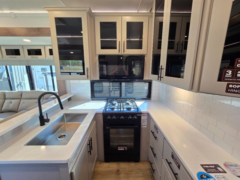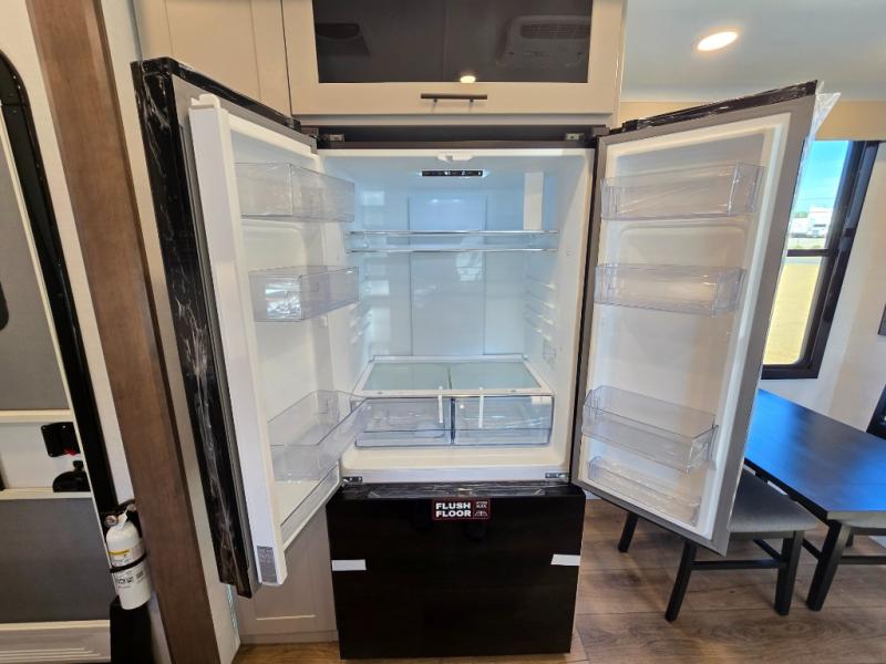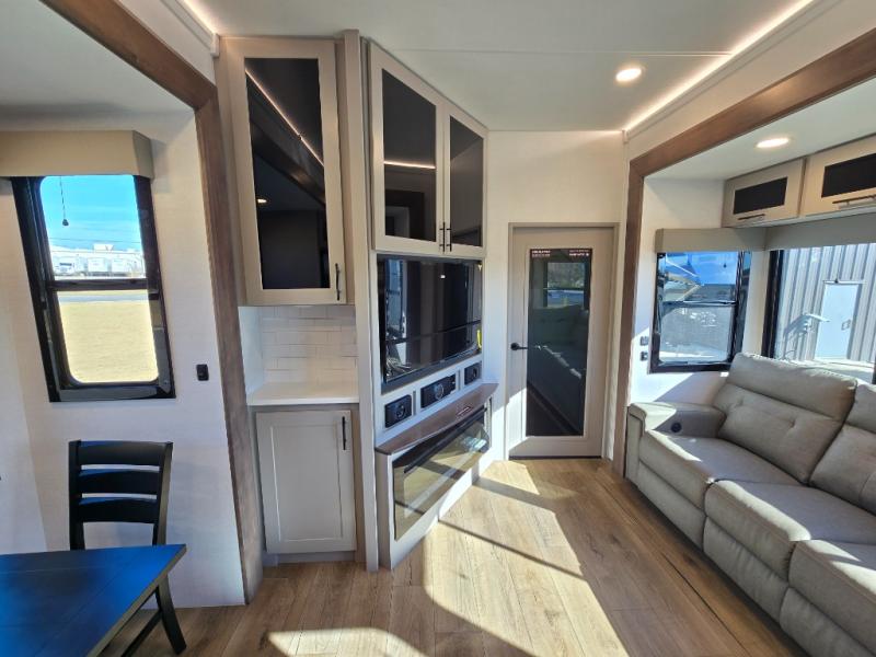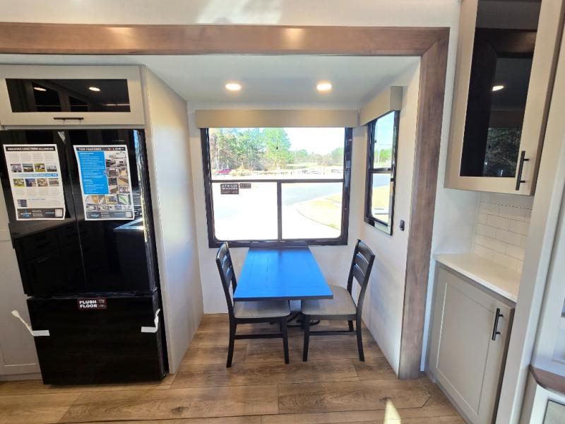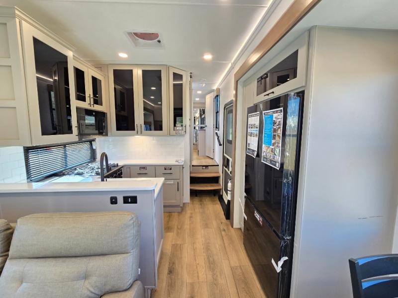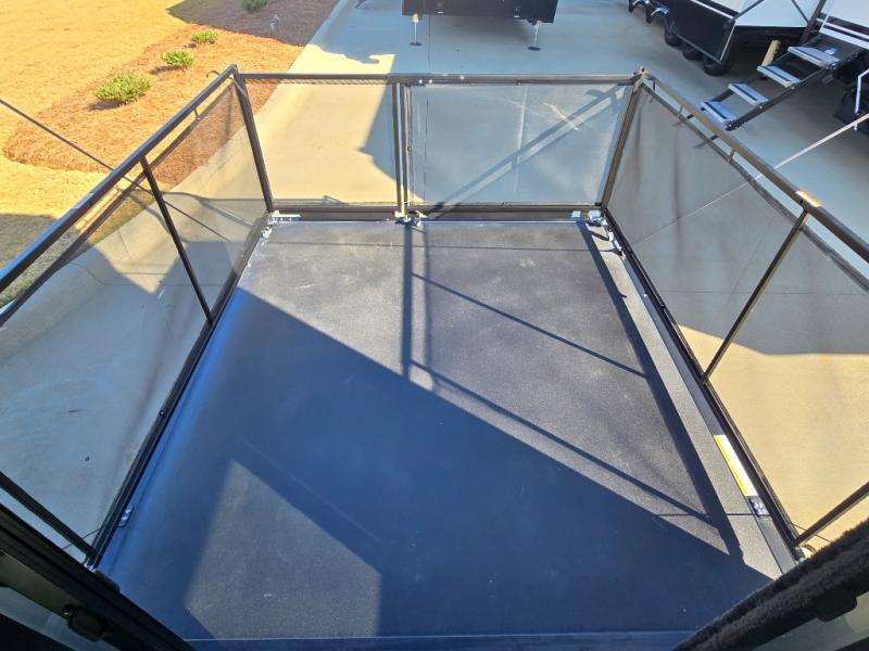 You can bring your toys with you wherever you go with any one of these Alliance RV Valor toy hauler fifth wheels! They are adventure-ready with a quality build from the walk on roof with seamless PVC roof covering to the commercial grade vinyl flooring and MorRyde CRE3000 suspension system. The Performance Running Gear package comes with a 101" wide-body benchmark chassis platform, 7,000 lb. Dexter axles, and a space enhancing drop frame storage compartment to pack in all your riding gear. You can even go off-gridding thanks to the Off the Grid Pack that has two 400 watt solar panels, generator prep, a 40 amp charge controller, and a 100 amp hour lithium iron phosphate battery. Some of the interior comforts you will enjoy are the hardwood cabinet doors and drawers, solid surface kitchen countertops, and commercial grade vinyl flooring with no carpet to make clean up a breeze. The Valor toy haulers are also the Master of 12 Volt with USB charging station throughout, a stainless steel refrigerator, and more 12 volt features to make camping hassle-free!