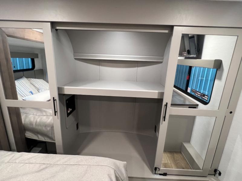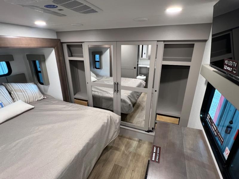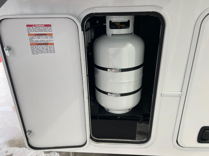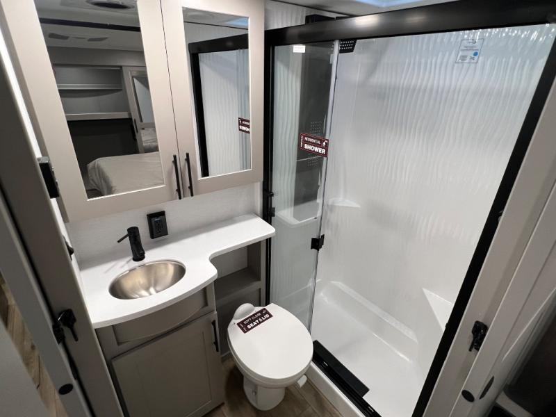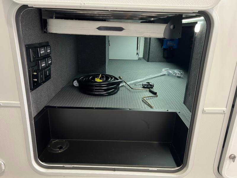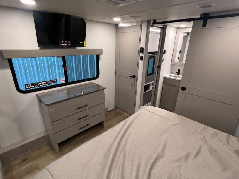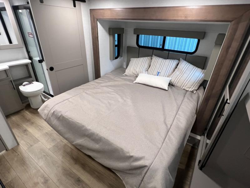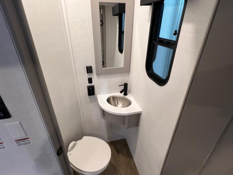 The whole gang will love camping in this toy hauler with a 14' garage for your toys and gear. Once you have arrived at your destination, you can set up the HappiJac roll-over sofas with a queen bed above them, and also a loft which opens to the garage area as well. A half bath is also available off the garage which is an added convenience for those sleeping in this converted area, and for those coming in off the trail so that they do not have to track all through the main unit to use the bathroom. The chef can prepare great meals for their hungry crew with the fully equipped kitchen including a four-burner cooktop, a 12V refrigerator, large sink, and plenty of countertop prep space. The rest of the gang can be relaxing on the large L-shaped sofa slide watching the 50" HDTV and enjoying the fireplace or playing a game of cards at the dining table with four chairs. The front private bedroom features a king bed slide for more interior space, a flip top dresser for all of your belongings, and a front wardrobe with washer and dryer prep, plus it has an entrance into the dual entry bathroom!