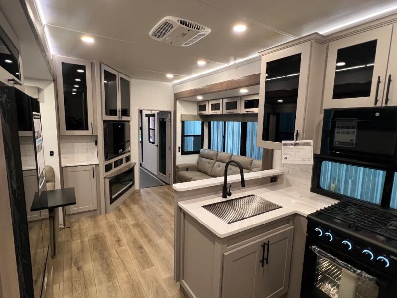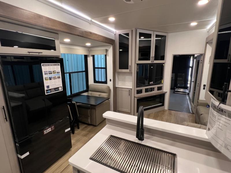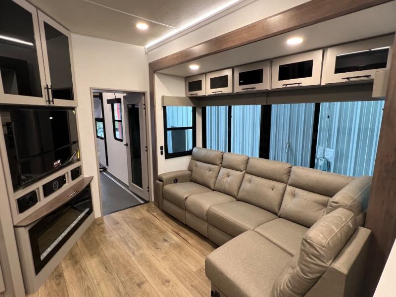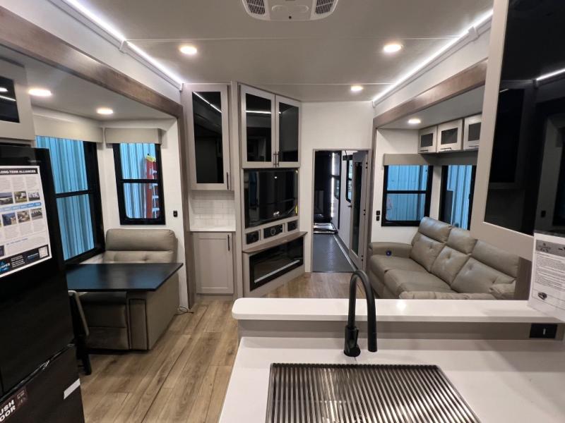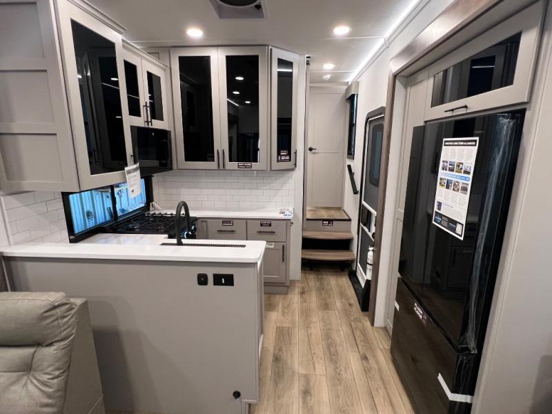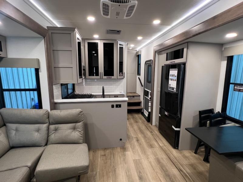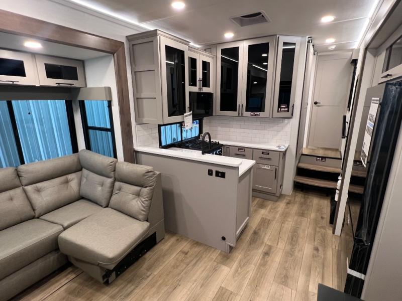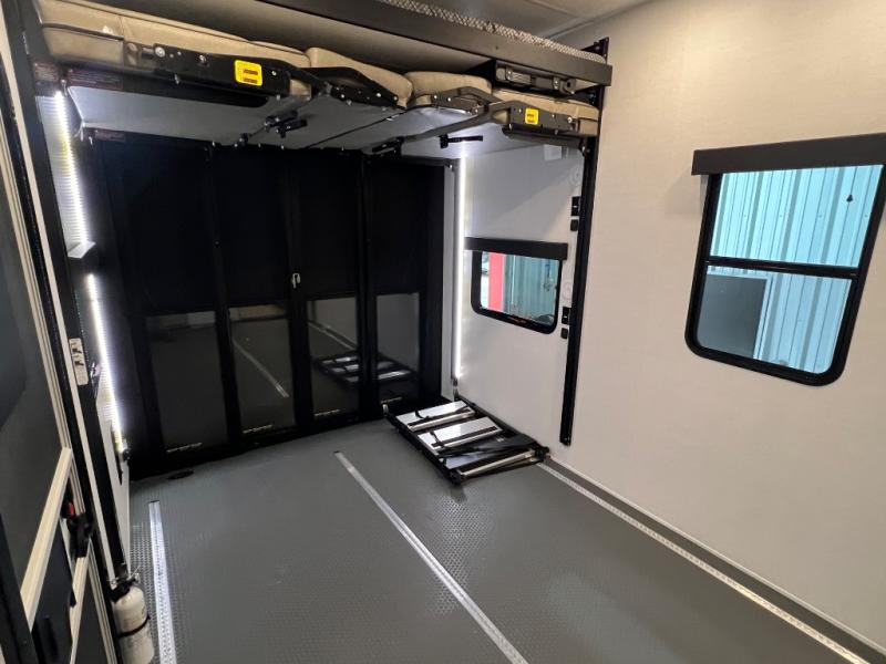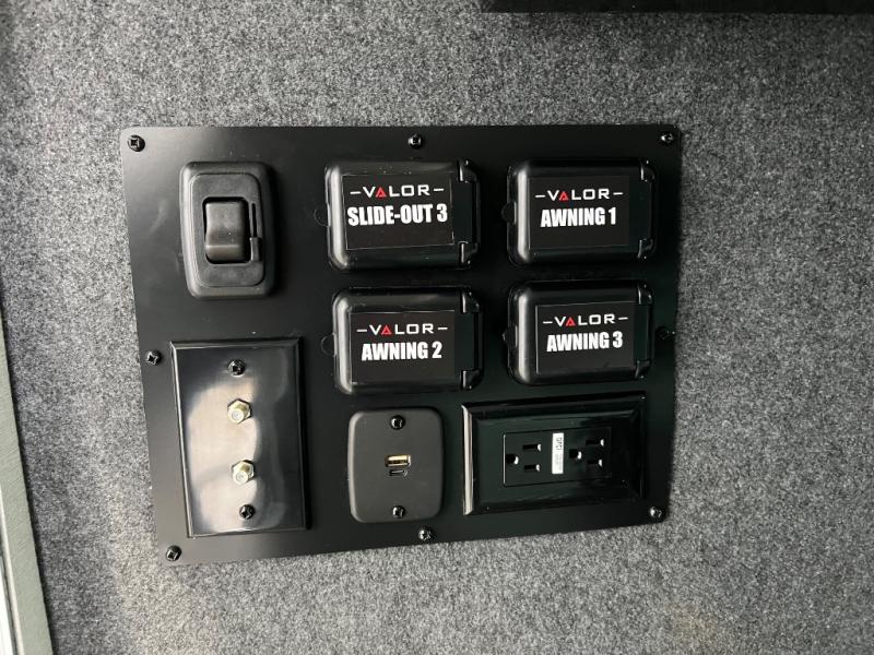 You can bring your toys with you wherever you go with any one of these Alliance RV Valor toy hauler fifth wheels! They are adventure-ready with a quality build from the walk on roof with seamless PVC roof covering to the commercial grade vinyl flooring and MorRyde CRE3000 suspension system. The Performance Running Gear package comes with a 101" wide-body benchmark chassis platform, 7,000 lb. Dexter axles, and a space enhancing drop frame storage compartment to pack in all your riding gear. You can even go off-gridding thanks to the Off the Grid Pack that has two 400-watt solar panels, generator prep, a 60-amp charge controller, and a 100-amp hour lithium iron phosphate battery. Some of the interior comforts you will enjoy are the hardwood cabinet doors and drawers, solid surface kitchen countertops, and commercial grade vinyl flooring with no carpet to make clean up a breeze. The Valor toy haulers are also the Master of 12 Volt with USB charging station throughout, a 12V refrigerator, and more 12-volt features to make camping hassle-free!