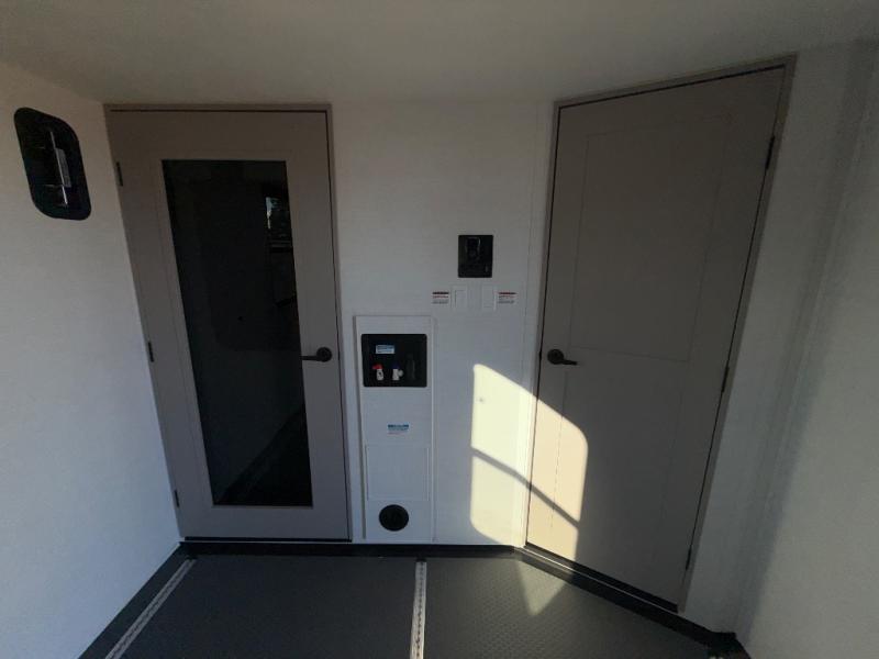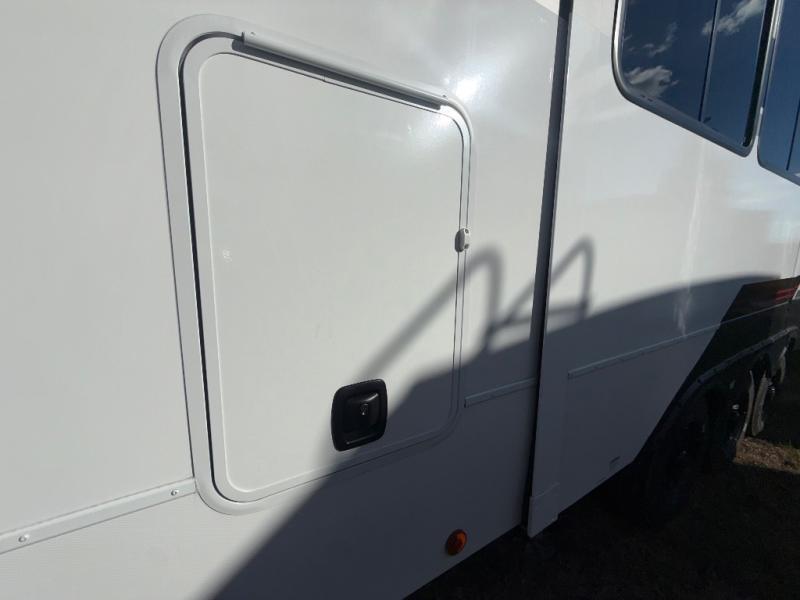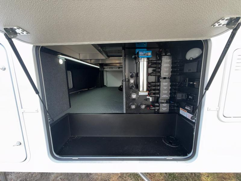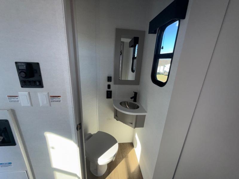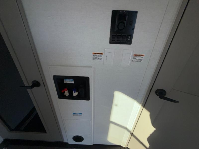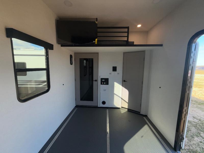 The whole gang will love camping in this toy hauler with a 14' garage for your toys and gear. Once you have arrived at your destination, you can set up the HappiJac roll-over sofas with a queen bed above them, and also a loft which opens to the garage area as well. A half bath is also available off the garage which is an added convenience for those sleeping in this converted area, and for those coming in off the trail so that they do not have to track all through the main unit to use the bathroom. The chef can prepare great meals for their hungry crew with the fully equipped kitchen including a four-burner cooktop, a 12V refrigerator, large sink, and plenty of countertop prep space. The rest of the gang can be relaxing on the large L-shaped sofa slide watching the 50" HDTV and enjoying the fireplace or playing a game of cards at the dining table with four chairs. The front private bedroom features a king bed slide for more interior space, a flip top dresser for all of your belongings, and a front wardrobe with washer and dryer prep, plus it has an entrance into the dual entry bathroom!