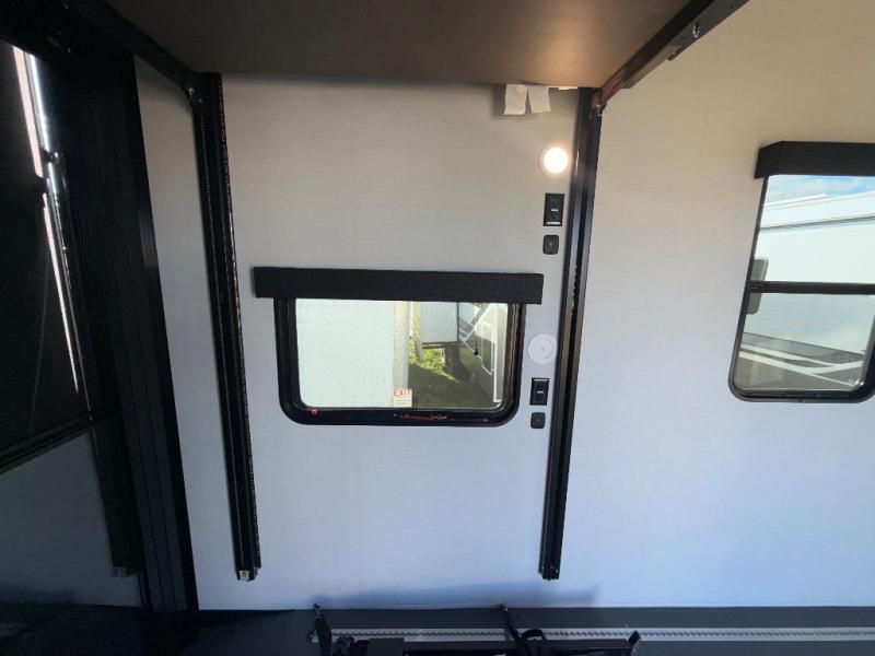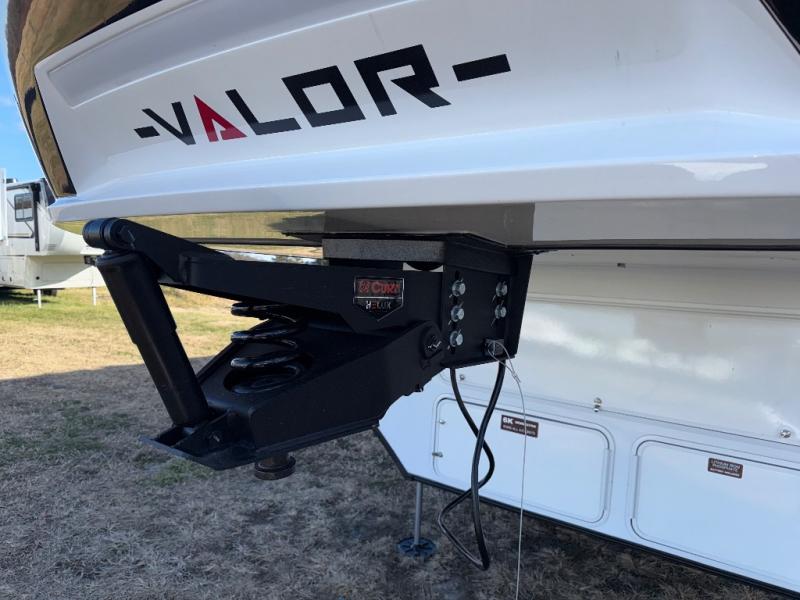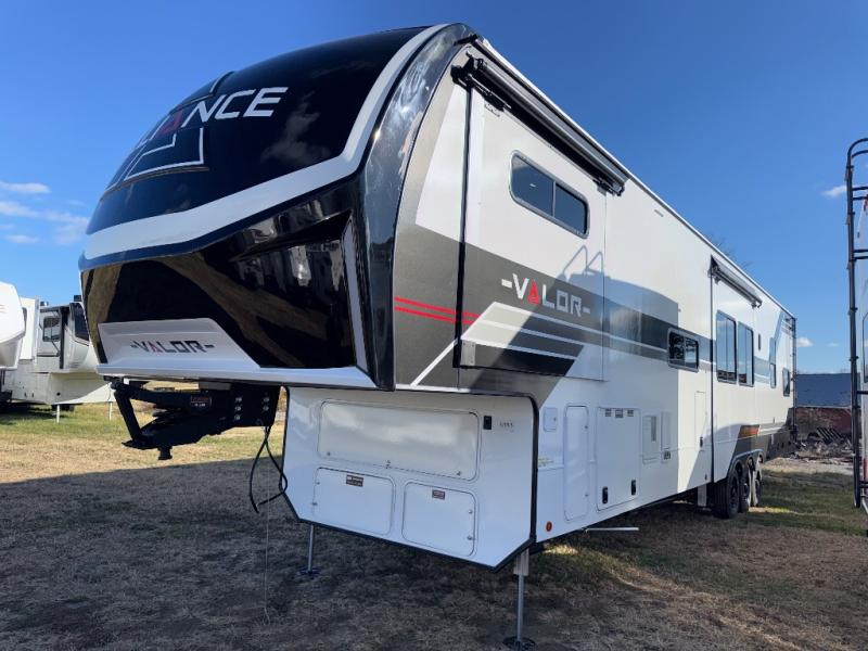 You can bring your toys with you wherever you go with any one of these Alliance RV Valor toy hauler fifth wheels! They are adventure-ready with a quality build from the walk on roof with seamless PVC roof covering to the commercial grade vinyl flooring and MorRyde CRE3000 suspension system. The Performance Running Gear package comes with a 101" wide-body benchmark chassis platform, 7,000 lb. Dexter axles, and a space enhancing drop frame storage compartment to pack in all your riding gear. You can even go off-gridding thanks to the Off the Grid Pack that has two 400-watt solar panels, generator prep, a 60-amp charge controller, and a 100-amp hour lithium iron phosphate battery. Some of the interior comforts you will enjoy are the hardwood cabinet doors and drawers, solid surface kitchen countertops, and commercial grade vinyl flooring with no carpet to make clean up a breeze. The Valor toy haulers are also the Master of 12 Volt with USB charging station throughout, a 12V refrigerator, and more 12-volt features to make camping hassle-free!