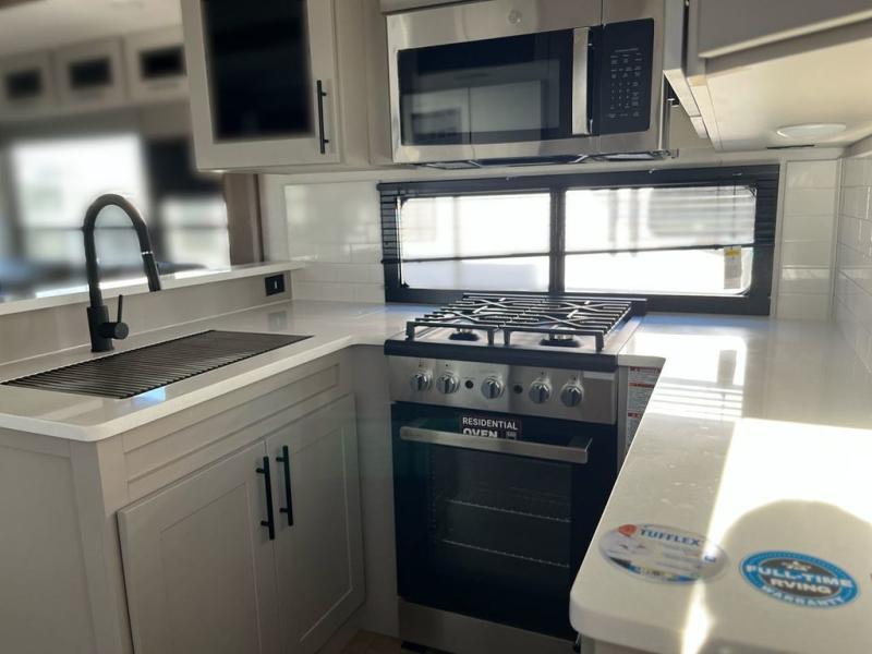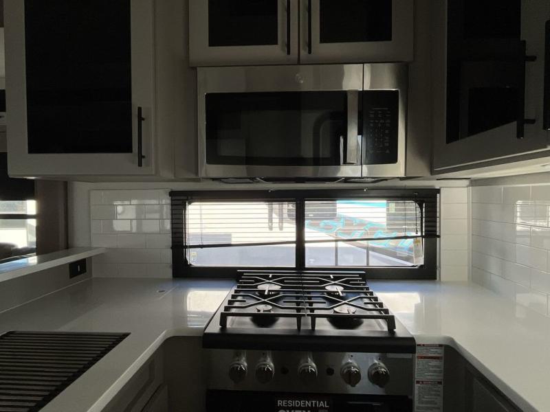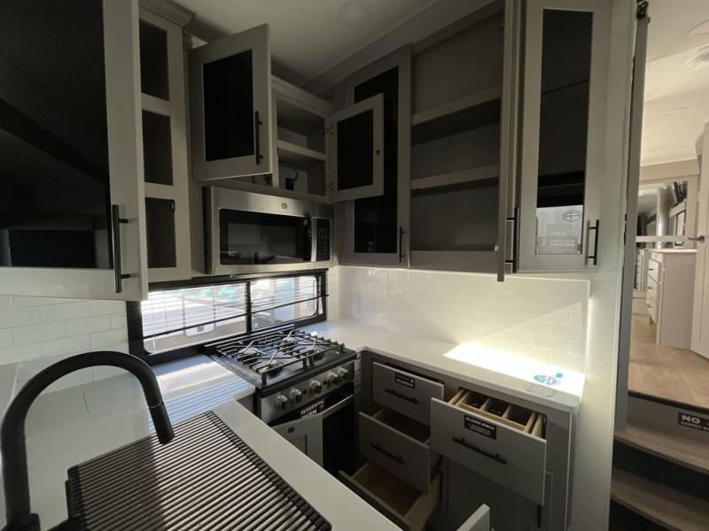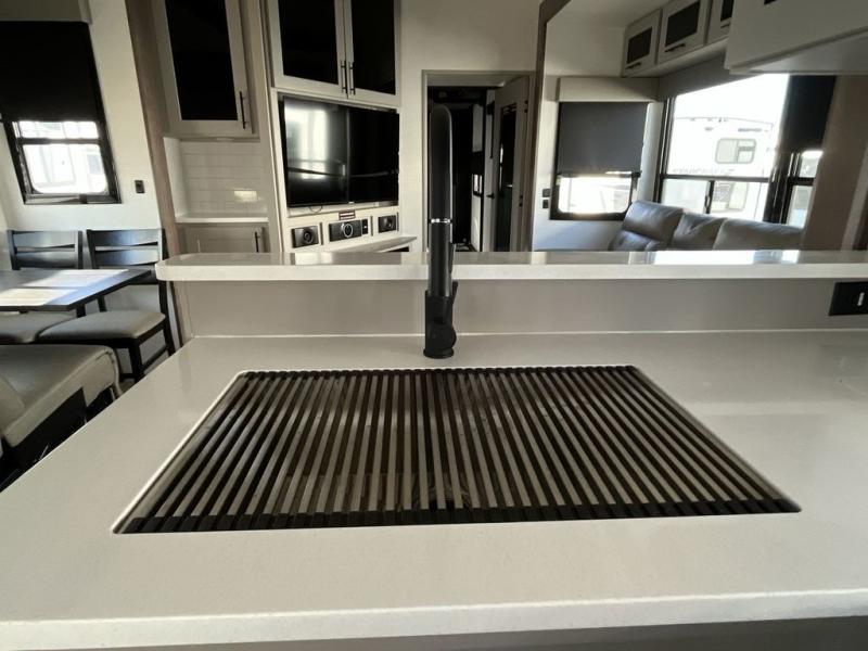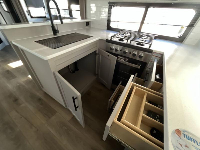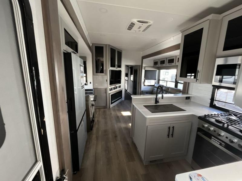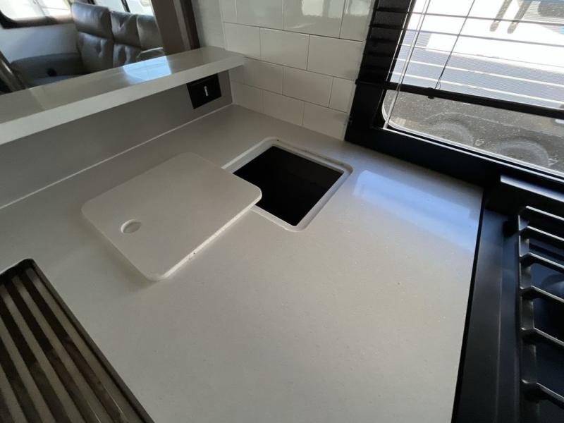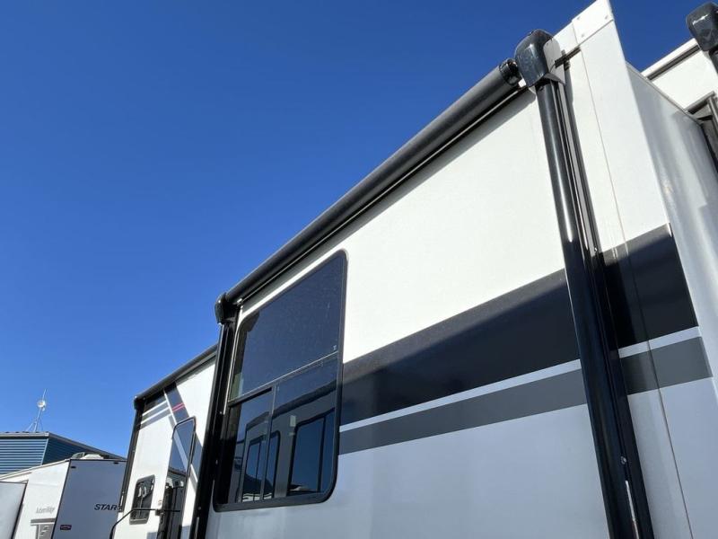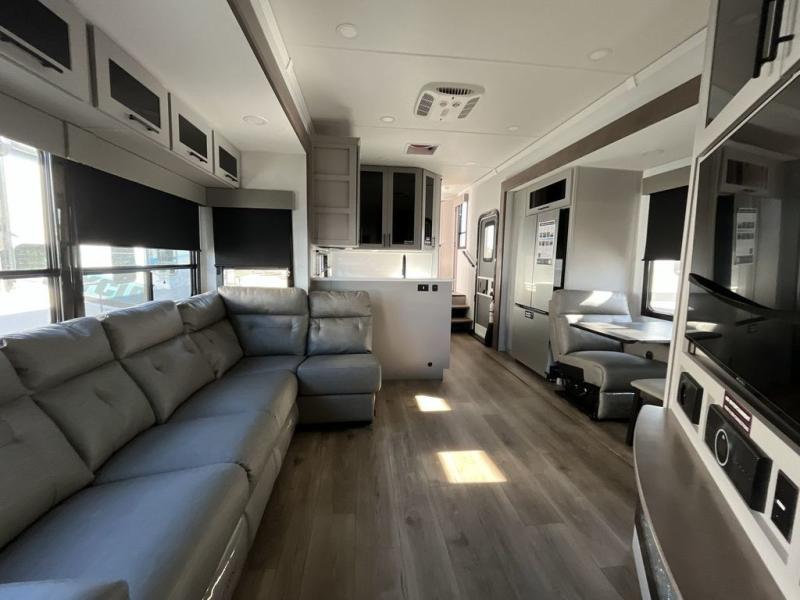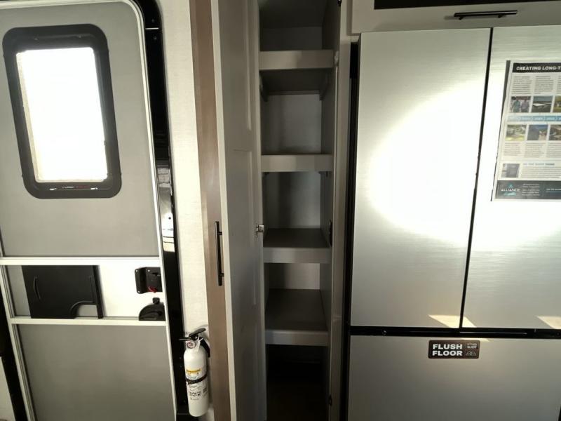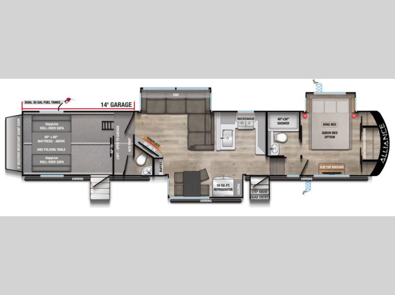 You can bring your toys with you wherever you go with any one of these Alliance RV Valor toy hauler fifth wheels! They are adventure-ready with a quality build from the walk on roof with seamless PVC roof covering to the commercial grade vinyl flooring and MorRyde CRE3000 suspension system. The Performance Running Gear package comes with a 101" wide-body benchmark chassis platform, 7,000 lb. Dexter axles, and a space enhancing drop frame storage compartment to pack in all your riding gear. You can even go off-gridding thanks to the Off the Grid Pack that has two 400-watt solar panels, generator prep, a 60-amp charge controller, and a 100-amp hour lithium iron phosphate battery. Some of the interior comforts you will enjoy are the hardwood cabinet doors and drawers, solid surface kitchen countertops, and commercial grade vinyl flooring with no carpet to make clean up a breeze. The Valor toy haulers are also the Master of 12 Volt with USB charging station throughout, a 12V refrigerator, and more 12-volt features to make camping hassle-free!