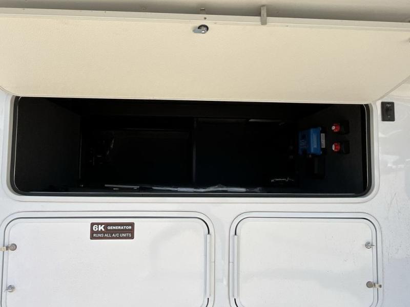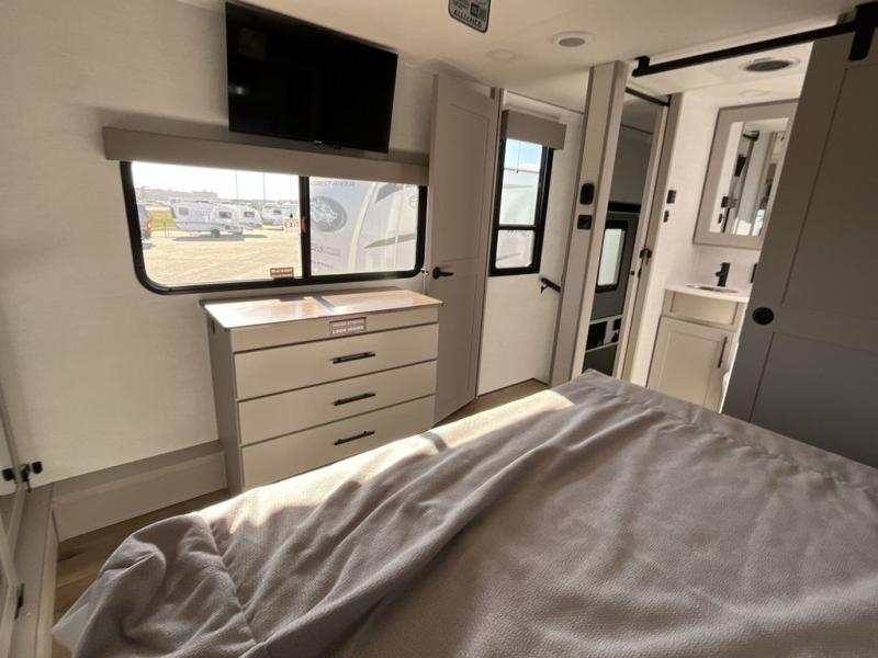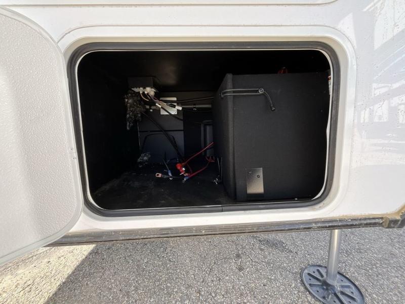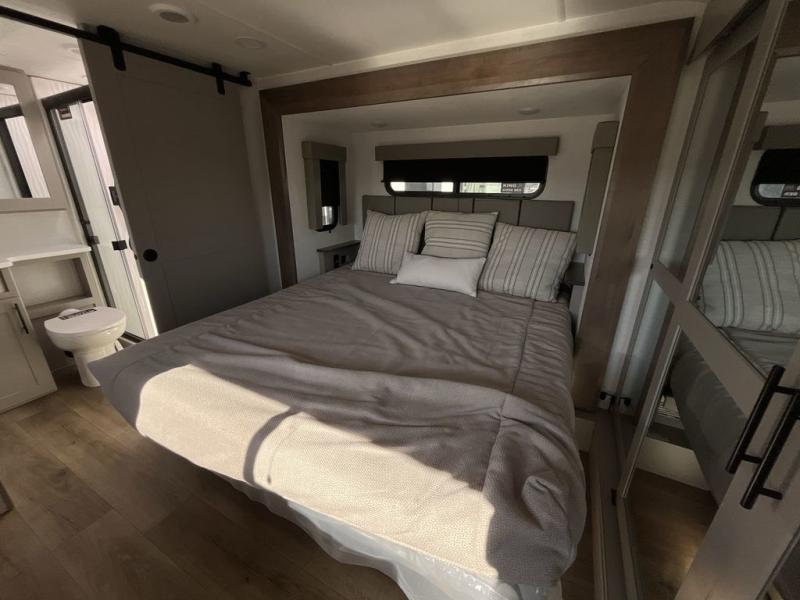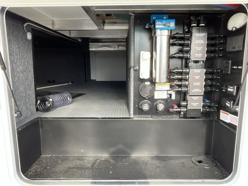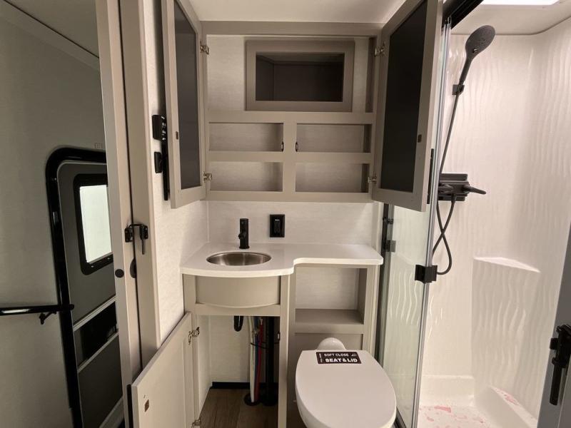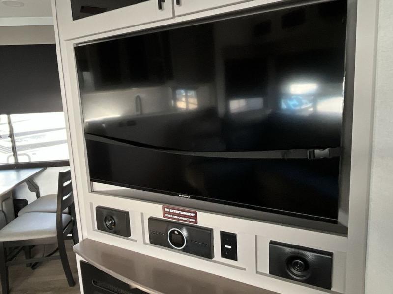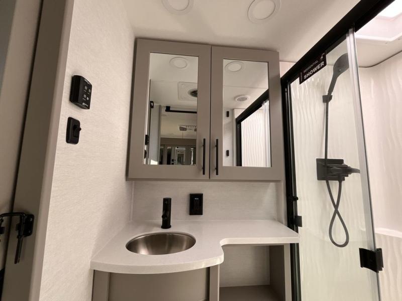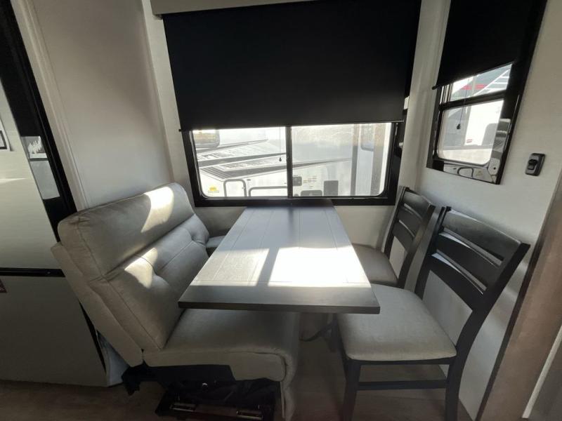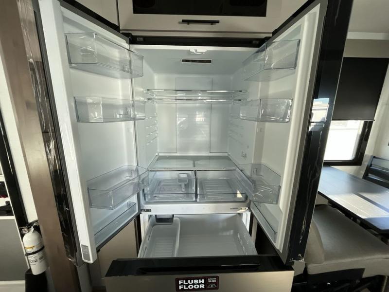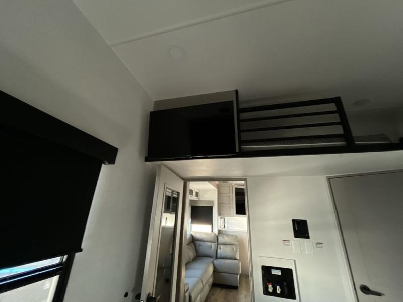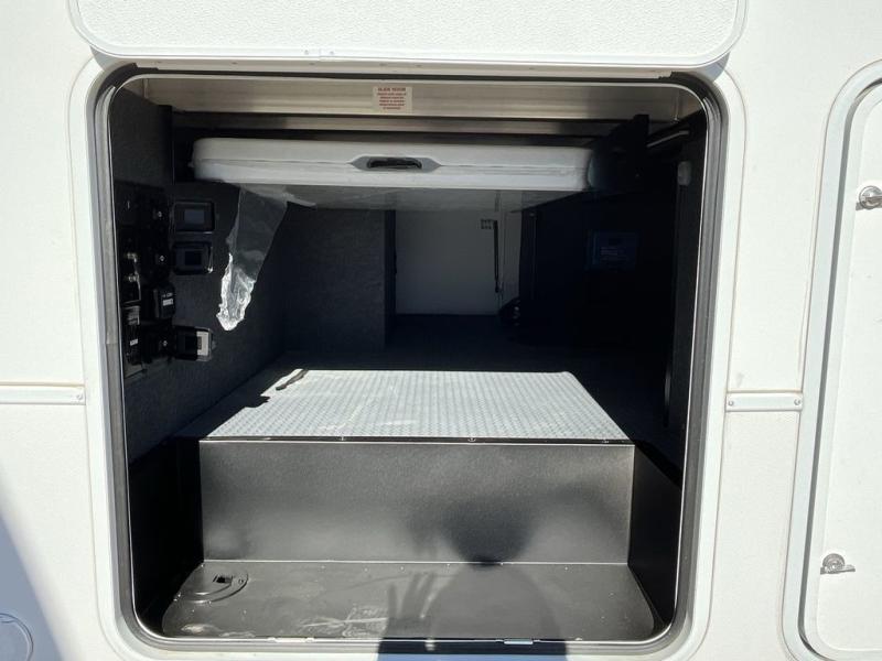 The whole gang will love camping in this toy hauler with a 14' garage for your toys and gear. Once you have arrived at your destination, you can set up the HappiJac roll-over sofas with a queen bed above them, and also a loft which opens to the garage area as well. A half bath is also available off the garage which is an added convenience for those sleeping in this converted area, and for those coming in off the trail so that they do not have to track all through the main unit to use the bathroom. The chef can prepare great meals for their hungry crew with the fully equipped kitchen including a four-burner cooktop, a 12V refrigerator, large sink, and plenty of countertop prep space. The rest of the gang can be relaxing on the large L-shaped sofa slide watching the 50" HDTV and enjoying the fireplace or playing a game of cards at the dining table with four chairs. The front private bedroom features a king bed slide for more interior space, a flip top dresser for all of your belongings, and a front wardrobe with washer and dryer prep, plus it has an entrance into the dual entry bathroom!