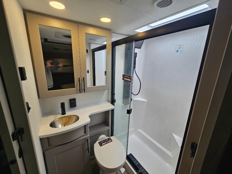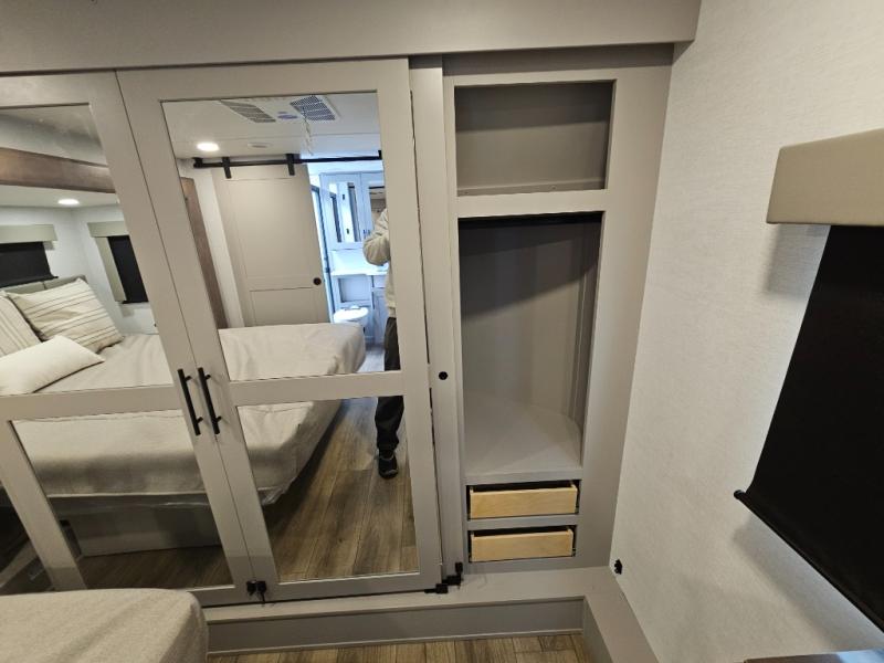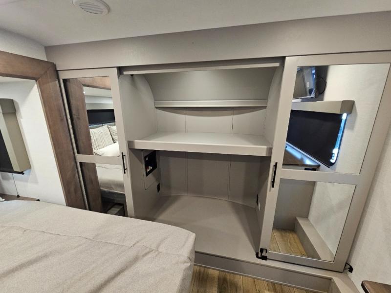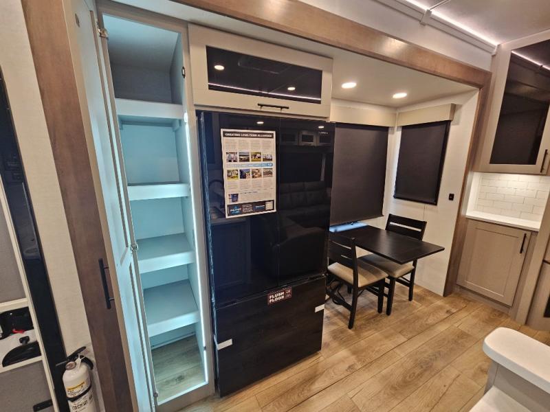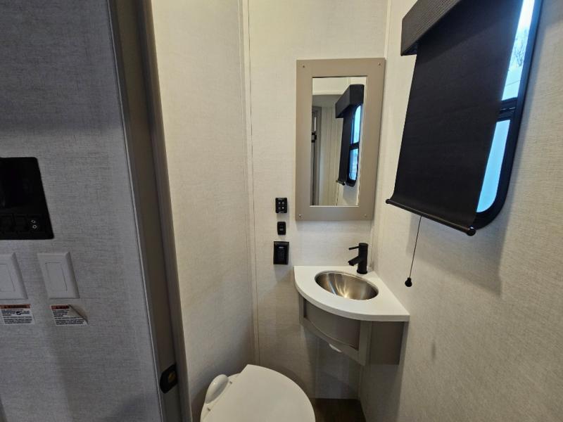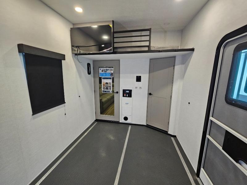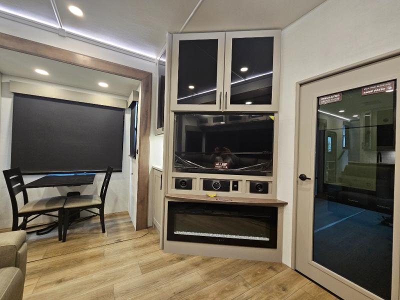 The whole gang will love camping in this toy hauler with a 14' garage for your toys and gear. Once you have arrived at your destination, you can set up the HappiJac roll-over sofas with a queen bed above them, and also a loft which opens to the garage area as well. A half bath is also available off the garage which is an added convenience for those sleeping in this converted area, and for those coming in off the trail so that they do not have to track all through the main unit to use the bathroom. The chef can prepare great meals for their hungry crew with the fully equipped kitchen including a four-burner cooktop, a 12V refrigerator, large sink, and plenty of countertop prep space. The rest of the gang can be relaxing on the large L-shaped sofa slide watching the 50" HDTV and enjoying the fireplace or playing a game of cards at the dining table with four chairs. The front private bedroom features a king bed slide for more interior space, a flip top dresser for all of your belongings, and a front wardrobe with washer and dryer prep, plus it has an entrance into the dual entry bathroom!