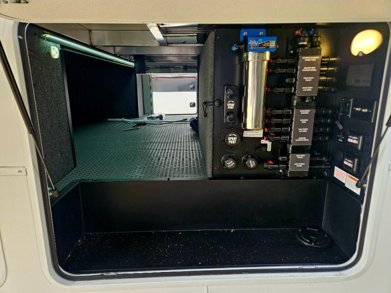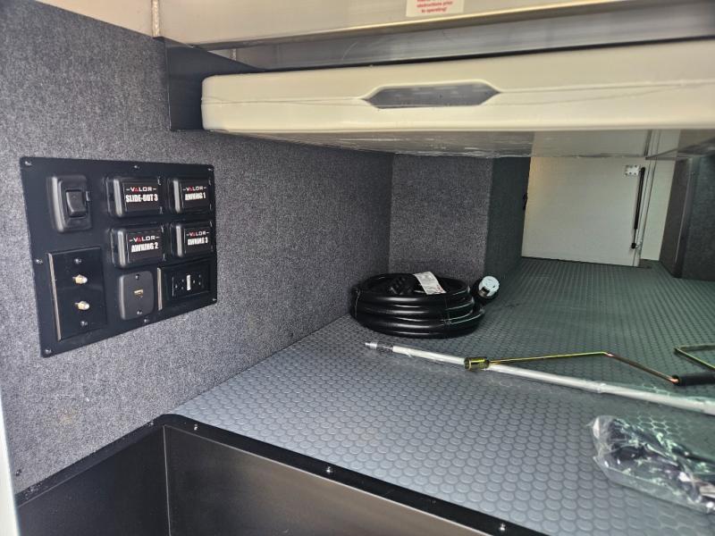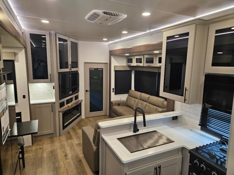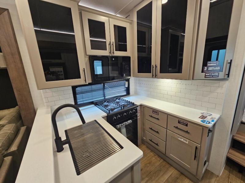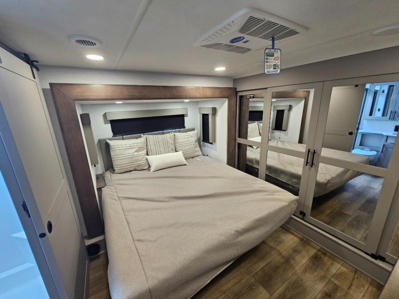 You can bring your toys with you wherever you go with any one of these Alliance RV Valor toy hauler fifth wheels! They are adventure-ready with a quality build from the walk on roof with seamless PVC roof covering to the commercial grade vinyl flooring and MorRyde CRE3000 suspension system. The Performance Running Gear package comes with a 101" wide-body benchmark chassis platform, 7,000 lb. Dexter axles, and a space enhancing drop frame storage compartment to pack in all your riding gear. You can even go off-gridding thanks to the Off the Grid Pack that has two 400-watt solar panels, generator prep, a 60-amp charge controller, and a 100-amp hour lithium iron phosphate battery. Some of the interior comforts you will enjoy are the hardwood cabinet doors and drawers, solid surface kitchen countertops, and commercial grade vinyl flooring with no carpet to make clean up a breeze. The Valor toy haulers are also the Master of 12 Volt with USB charging station throughout, a 12V refrigerator, and more 12-volt features to make camping hassle-free!
