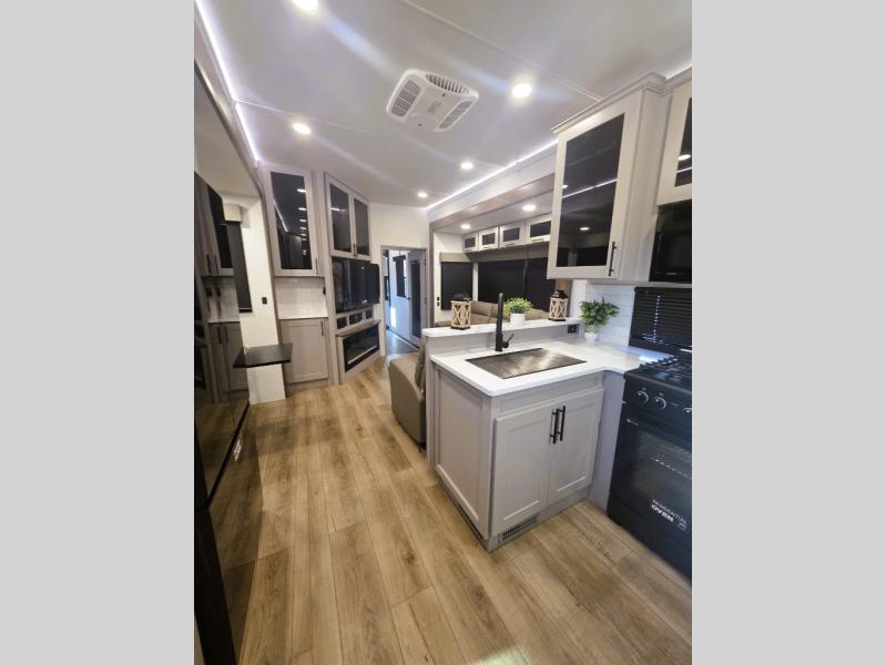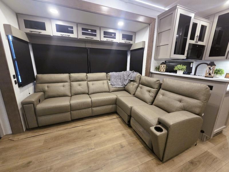 You can bring your toys with you wherever you go with any one of these Alliance RV Valor toy hauler fifth wheels! They are adventure-ready with a quality build from the walk on roof with seamless PVC roof covering to the commercial grade vinyl flooring and MorRyde CRE3000 suspension system. The Performance Running Gear package comes with a 101" wide-body benchmark chassis platform, 7,000 lb. Dexter axles, and a space enhancing drop frame storage compartment to pack in all your riding gear. You can even go off-gridding thanks to the Off the Grid Pack that has two 400-watt solar panels, generator prep, a 60-amp charge controller, and a 100-amp hour lithium iron phosphate battery. Some of the interior comforts you will enjoy are the hardwood cabinet doors and drawers, solid surface kitchen countertops, and commercial grade vinyl flooring with no carpet to make clean up a breeze. The Valor toy haulers are also the Master of 12 Volt with USB charging station throughout, a 12V refrigerator, and more 12-volt features to make camping hassle-free!