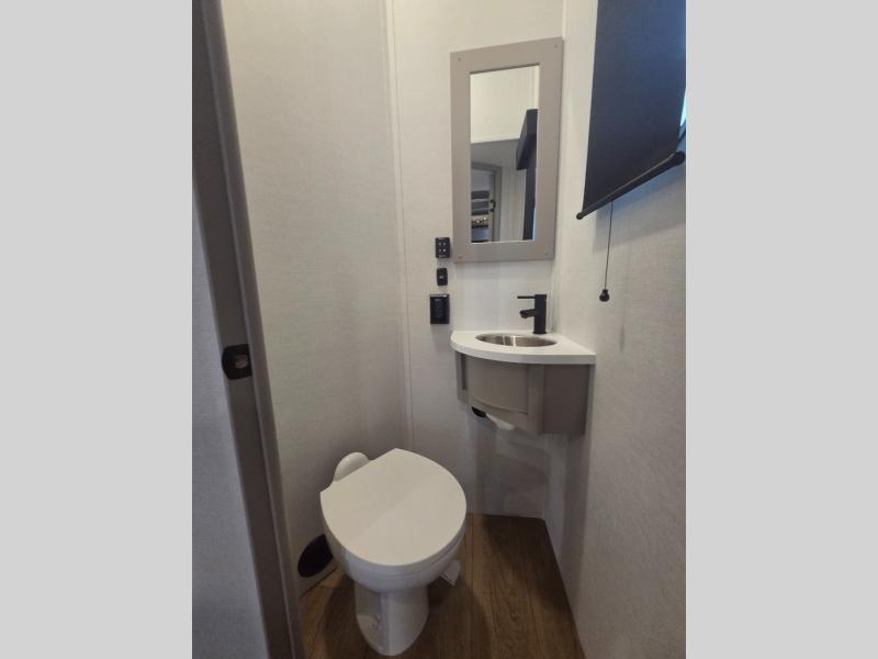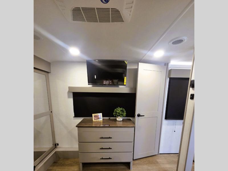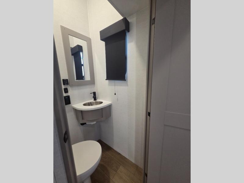 The whole gang will love camping in this toy hauler with a 14' garage for your toys and gear. Once you have arrived at your destination, you can set up the HappiJac roll-over sofas with a queen bed above them, and also a loft which opens to the garage area as well. A half bath is also available off the garage which is an added convenience for those sleeping in this converted area, and for those coming in off the trail so that they do not have to track all through the main unit to use the bathroom. The chef can prepare great meals for their hungry crew with the fully equipped kitchen including a four-burner cooktop, a 12V refrigerator, large sink, and plenty of countertop prep space. The rest of the gang can be relaxing on the large L-shaped sofa slide watching the 50" HDTV and enjoying the fireplace or playing a game of cards at the dining table with four chairs. The front private bedroom features a king bed slide for more interior space, a flip top dresser for all of your belongings, and a front wardrobe with washer and dryer prep, plus it has an entrance into the dual entry bathroom!