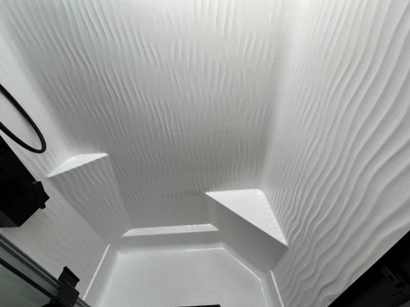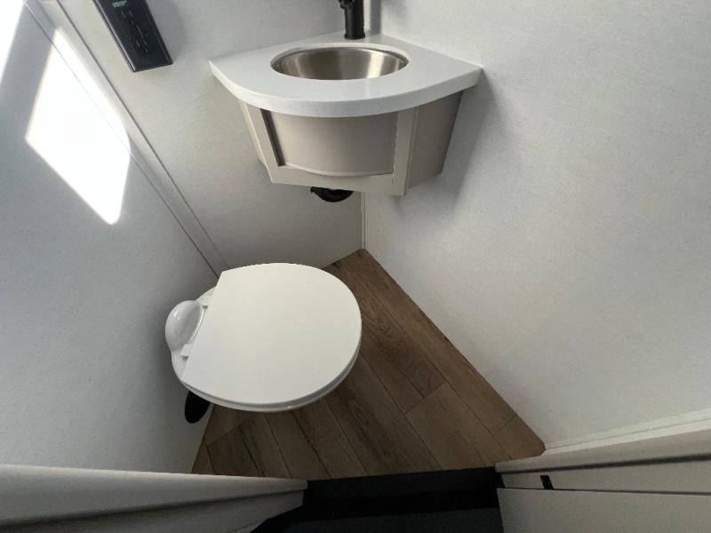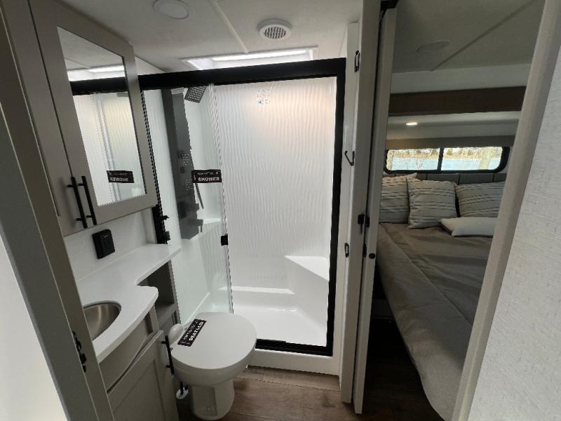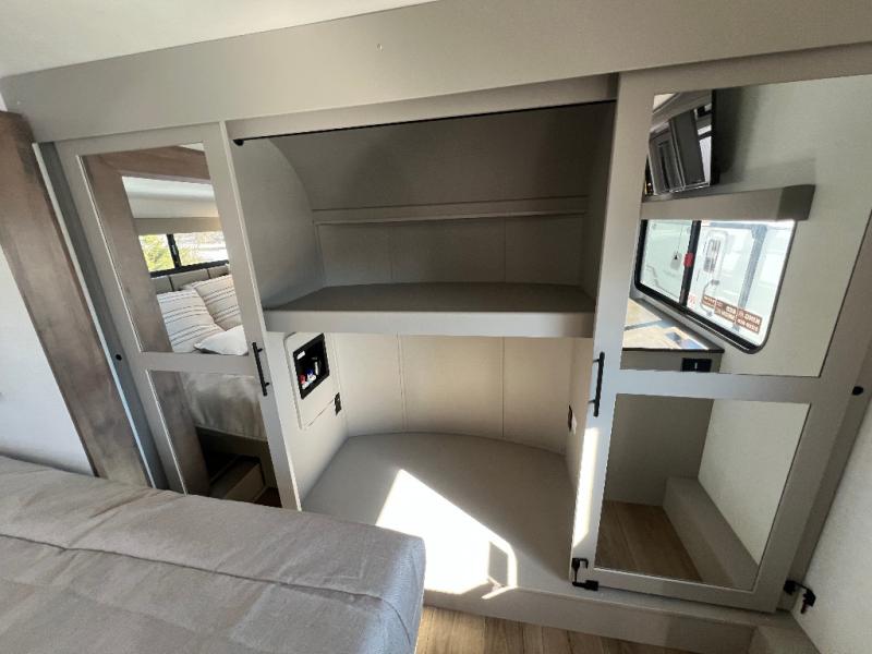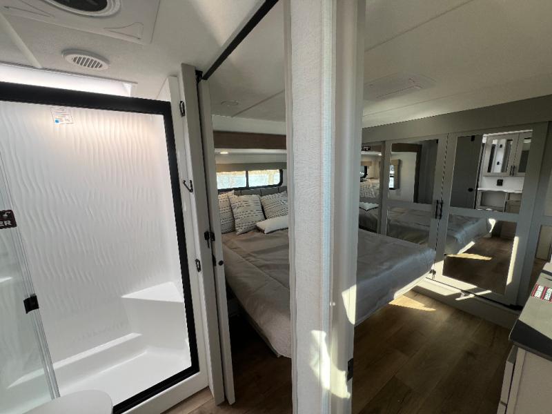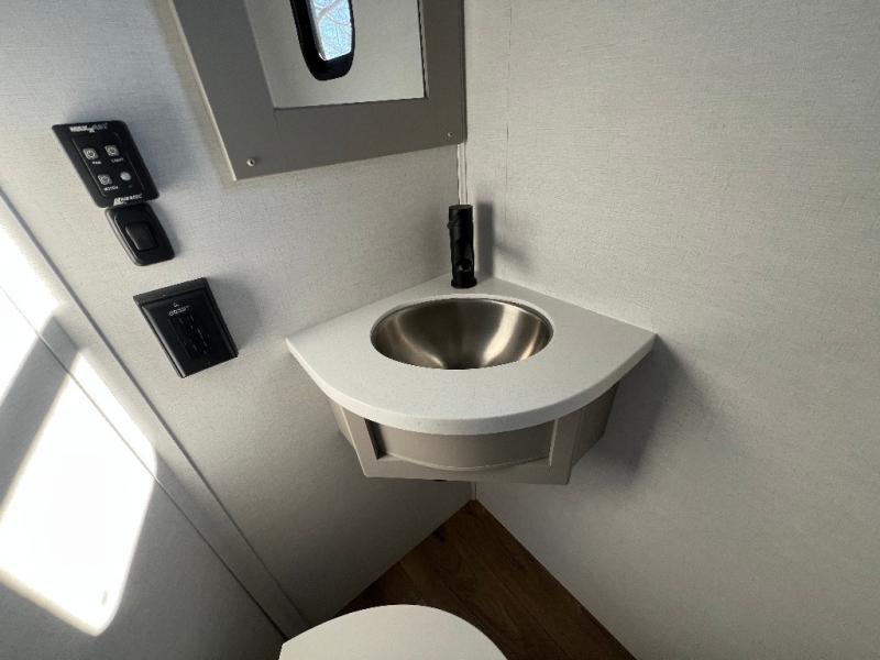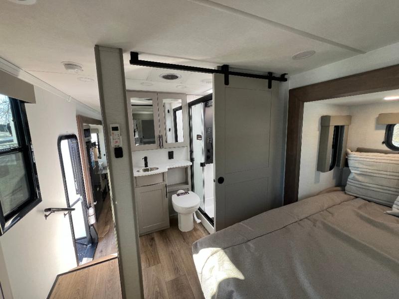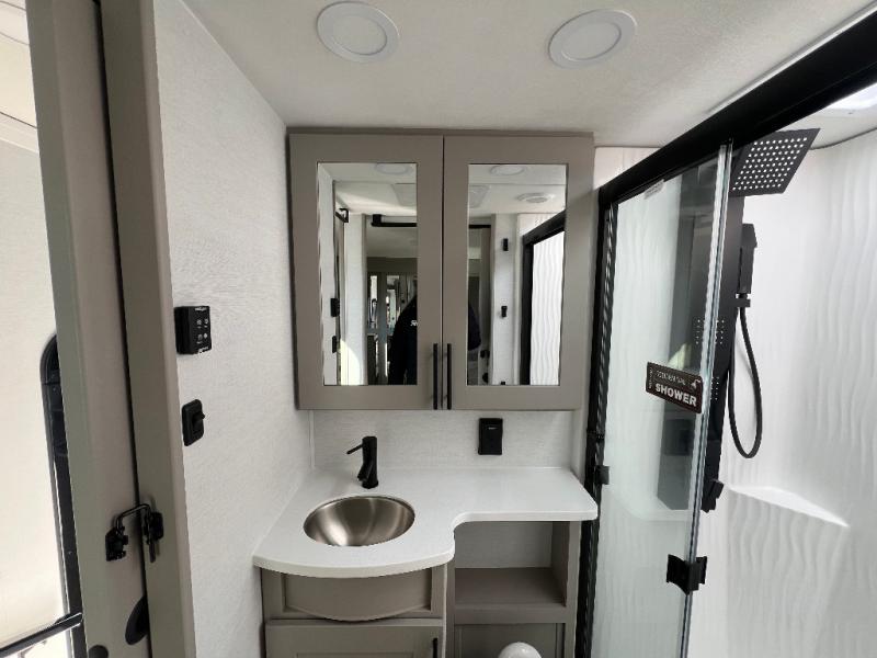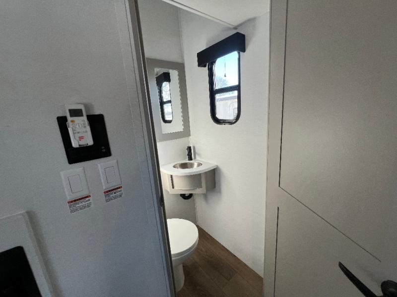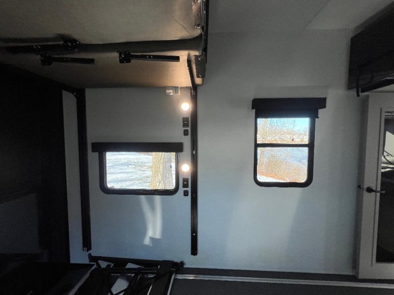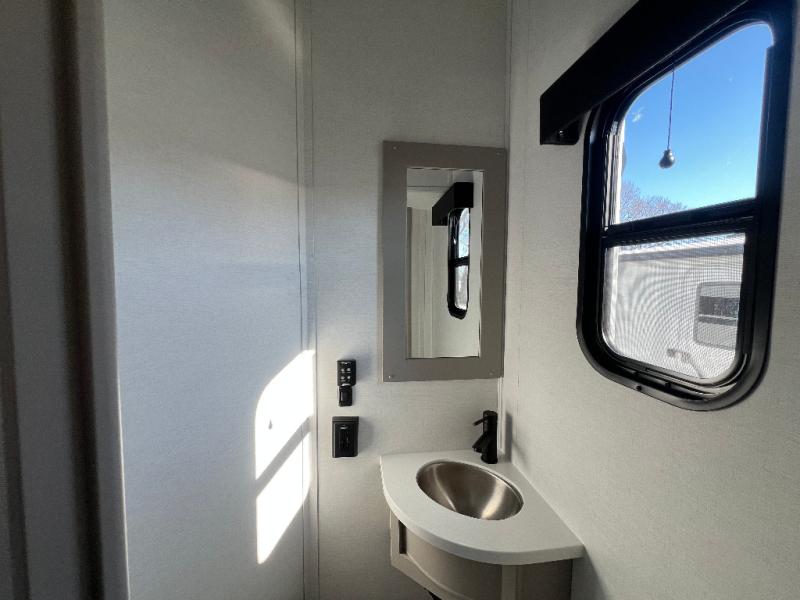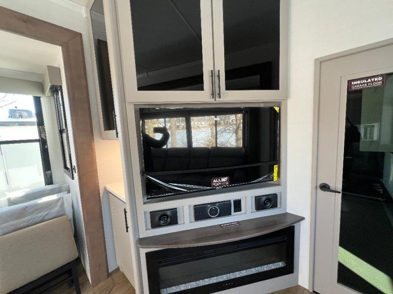 The whole gang will love camping in this toy hauler with a 14' garage for your toys and gear. Once you have arrived at your destination, you can set up the HappiJac roll-over sofas with a queen bed above them, and also a loft which opens to the garage area as well. A half bath is also available off the garage which is an added convenience for those sleeping in this converted area, and for those coming in off the trail so that they do not have to track all through the main unit to use the bathroom. The chef can prepare great meals for their hungry crew with the fully equipped kitchen including a four-burner cooktop, a 12V refrigerator, large sink, and plenty of countertop prep space. The rest of the gang can be relaxing on the large L-shaped sofa slide watching the 50" HDTV and enjoying the fireplace or playing a game of cards at the dining table with four chairs. The front private bedroom features a king bed slide for more interior space, a flip top dresser for all of your belongings, and a front wardrobe with washer and dryer prep, plus it has an entrance into the dual entry bathroom!