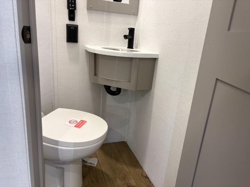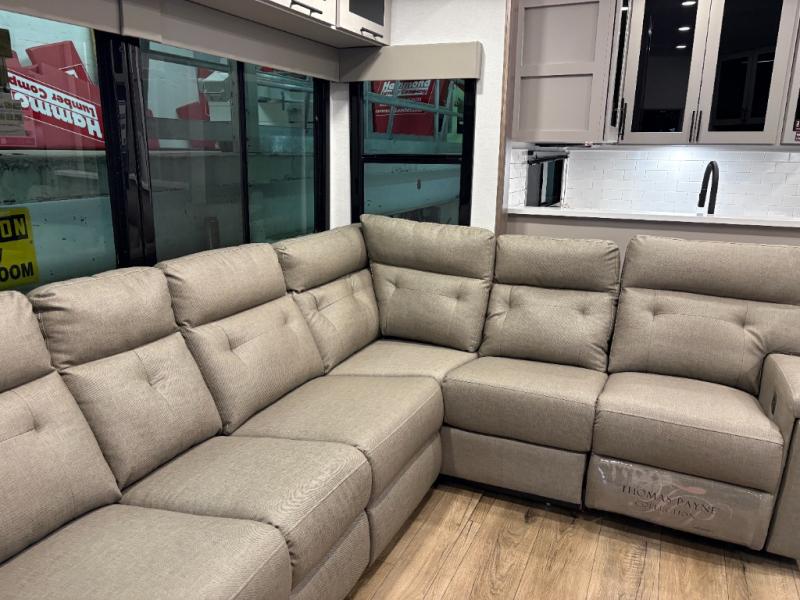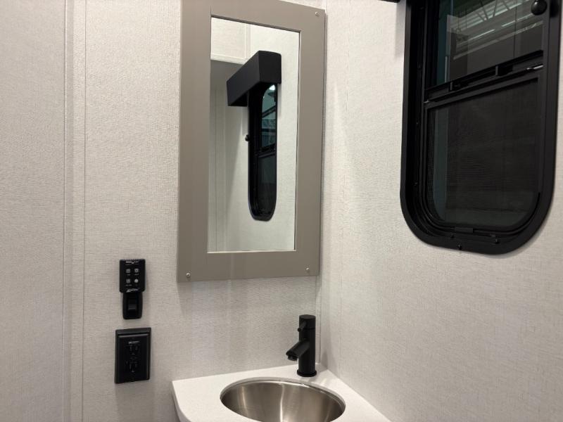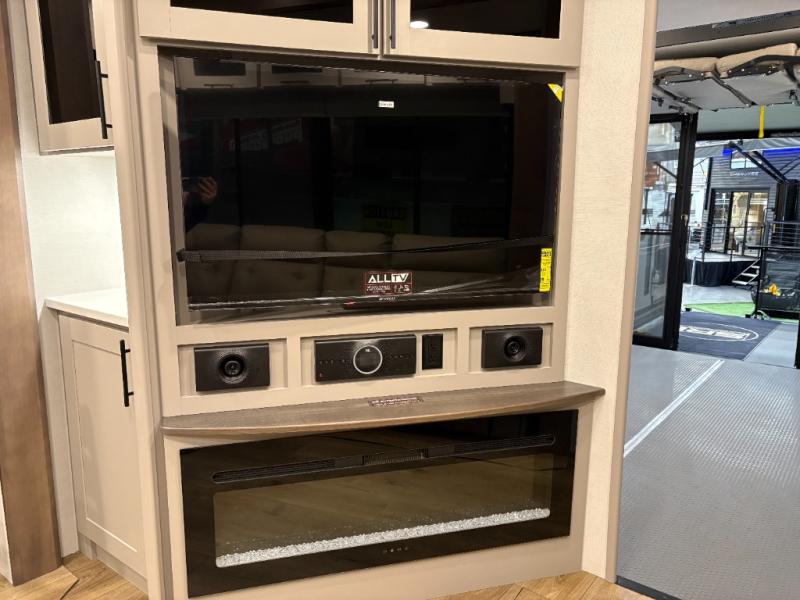 The whole gang will love camping in this toy hauler with a 14' garage for your toys and gear. Once you have arrived at your destination, you can set up the HappiJac roll-over sofas with a queen bed above them, and also a loft which opens to the garage area as well. A half bath is also available off the garage which is an added convenience for those sleeping in this converted area, and for those coming in off the trail so that they do not have to track all through the main unit to use the bathroom. The chef can prepare great meals for their hungry crew with the fully equipped kitchen including a four-burner cooktop, a 12V refrigerator, large sink, and plenty of countertop prep space. The rest of the gang can be relaxing on the large L-shaped sofa slide watching the 50" HDTV and enjoying the fireplace or playing a game of cards at the dining table with four chairs. The front private bedroom features a king bed slide for more interior space, a flip top dresser for all of your belongings, and a front wardrobe with washer and dryer prep, plus it has an entrance into the dual entry bathroom!