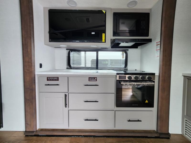 Pack your bags and head for the trails in this double slide out toy hauler! The 14' garage includes tie-downs to keep your gear secure plus a weather resistant ramp door for easy unloading. You will also have at home conveniences like a front master bedroom with a queen bed slide to lay your head on at night, along with a dresser and a wardrobe with a mirror so you can easily get ready each day. And you'll have access to the dual entry bathroom which has a 27" x 36" shower to freshen up in each morning. Prepare your best home cooked meals with the three-burner cooktop and store any leftovers in the 10-cu. ft. refrigerator. The 60" sofas and drop-down HappiJac queen bed offer a comfortable place to socialize together at night, as well as a provide sleeping space at night too!