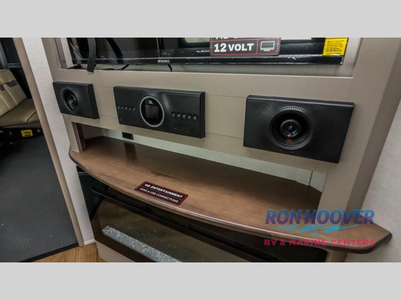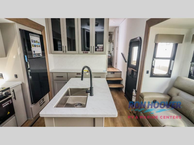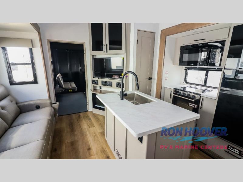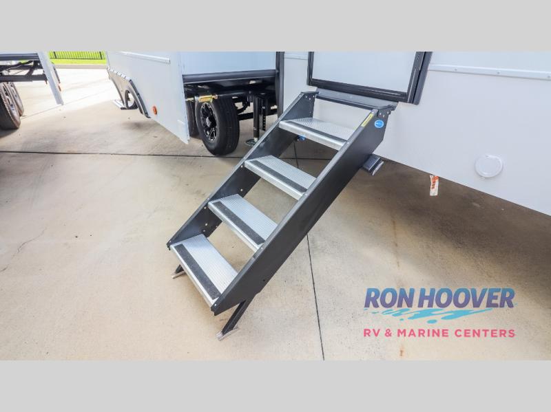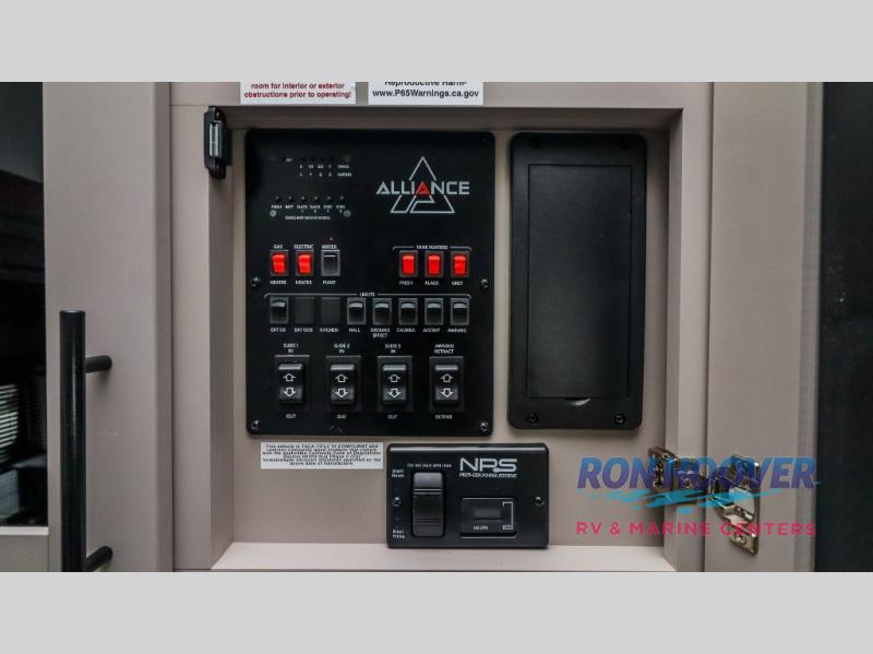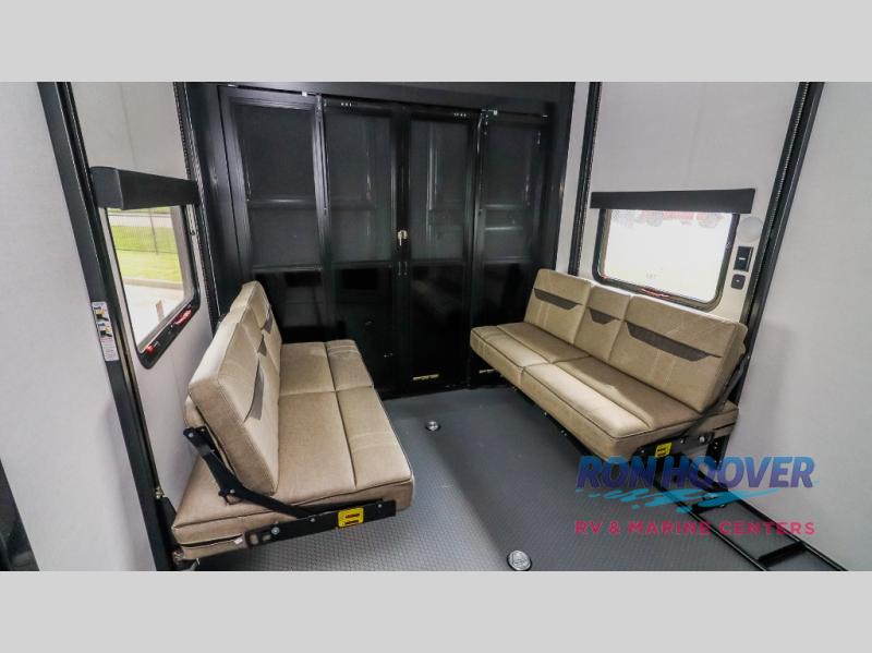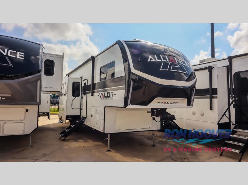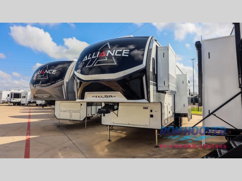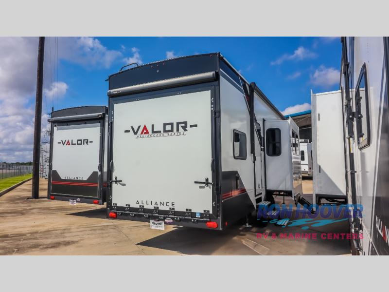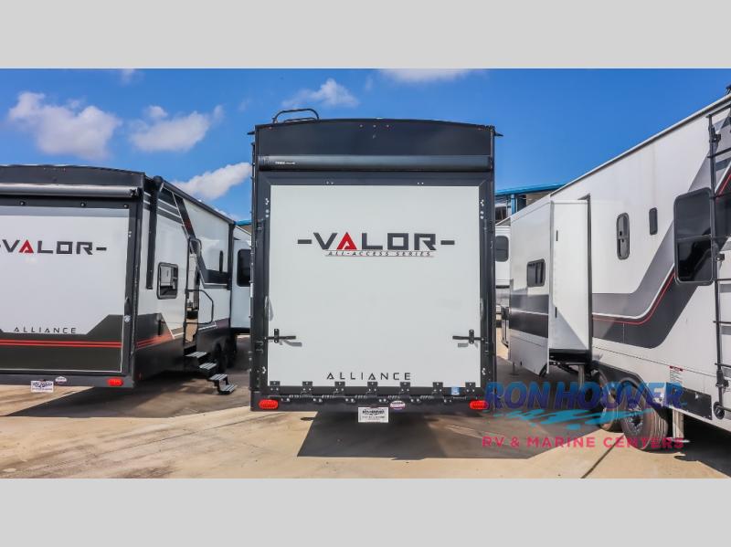 With any Valor All-Access toy hauler by Alliance RV you will be getting a travel trailer or fifth wheel with exceptional features at a great value! There is a painted fiberglass front cap, Mylar reinforced exterior seals, Azdel-backed fiberglass sidewalls, and a walk-on roof with a seamless PVC roof covering for added strength and durability. The 101" wide-body Benchmark chassis means you can bring along your larger toys, and the multipoint tie-down system will keep your toys safe and secure on the way to the campground. All of your power needs will be met with the Masters of 12 Volt Package that includes a 12V JBL sound system and USB charging stations throughout, plus the Off The Grid Pack comes with a 400 watt solar panel, 40 amp charge controller, and generator prep to keep you going all week long. Some of the interior comforts you'll enjoy are commercial grade vinyl flooring with no carpet so you can easily clean up, black cabinetry hardware, residential LED recessed ceiling lights, and so much more!