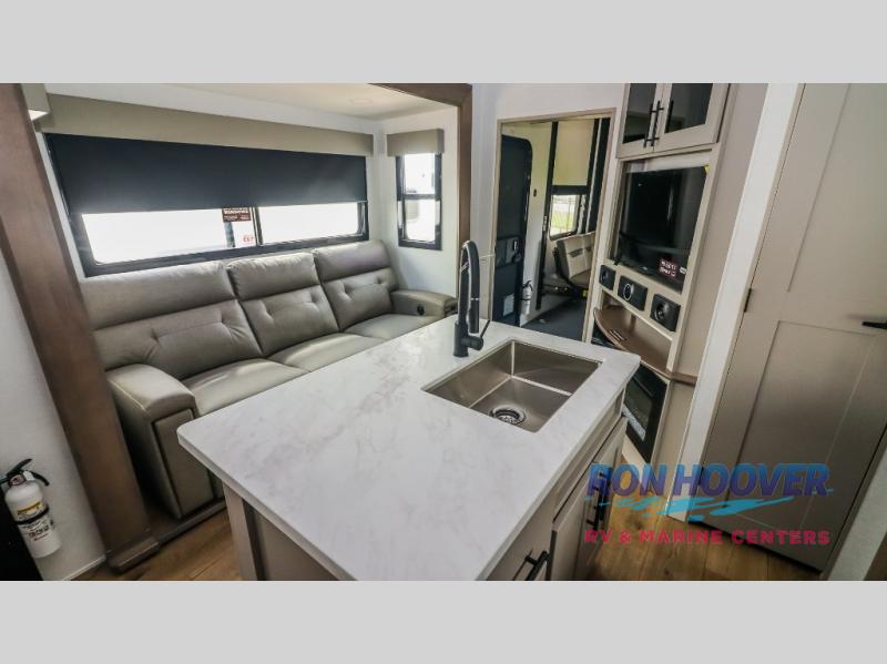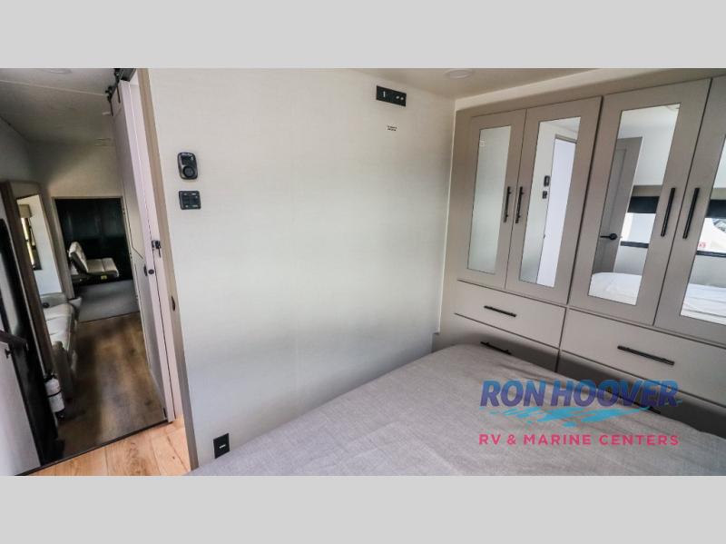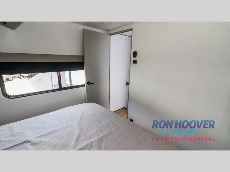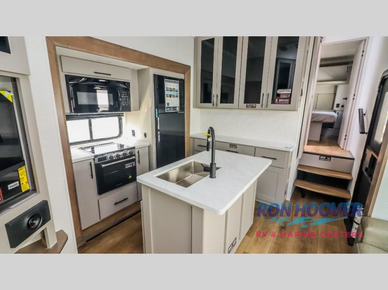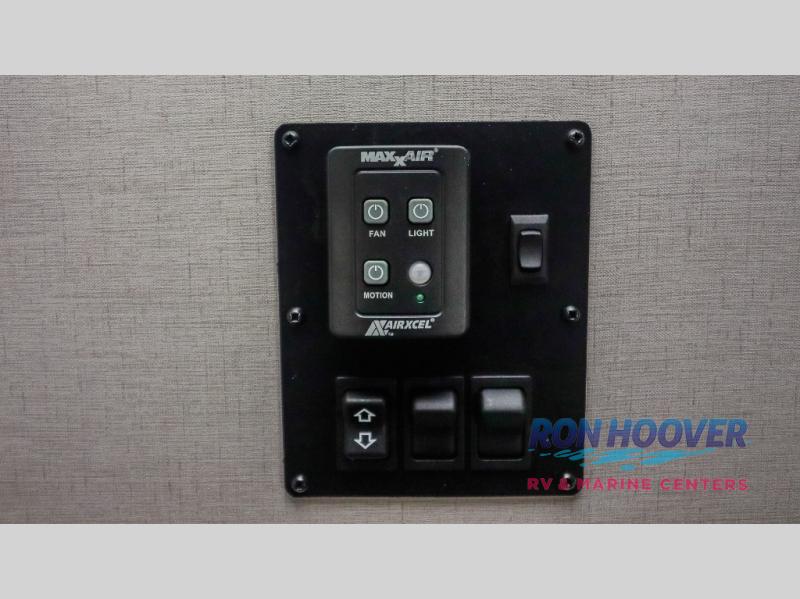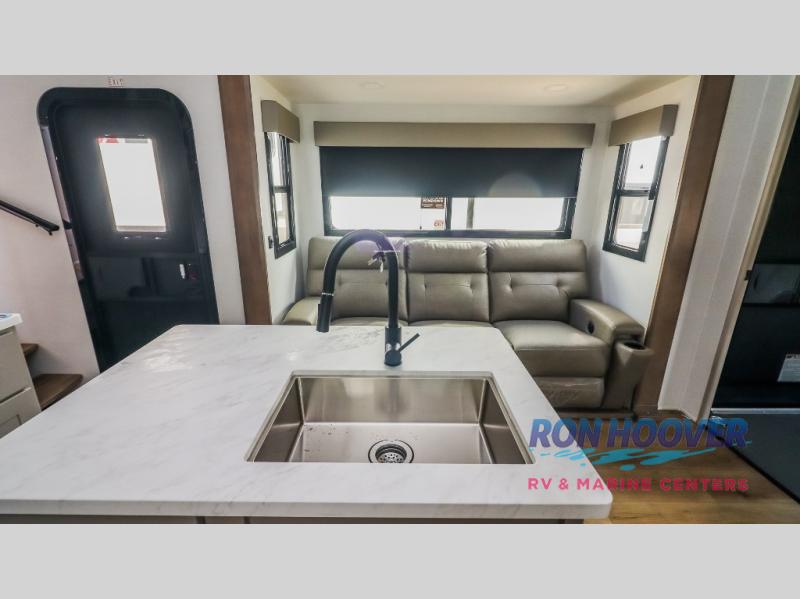 Load up the dirt bikes, pack your bags, and head to the campground in this spacious toy hauler. Once your toys are unloaded using the weather resistant ramp door, relax on the HappiJac roll-over sofas with a folding table in between, and this area can become your guests' bedroom at night since there is a drop-down queen bed, a half bath, plus an additional 30" x 72" bunk/loft bed. You will have the front bedroom all to yourselves that includes a king bed with an optional queen bed plus a wardrobe slide out to keep your space tidy. Everyone can meet in the main living area/kitchen for movie night with the HDTV and sofa slide out, while the chef of makes dinner on the three burner cooktop. There is also a hutch and pantry for storage and a kitchen island for more counter space!