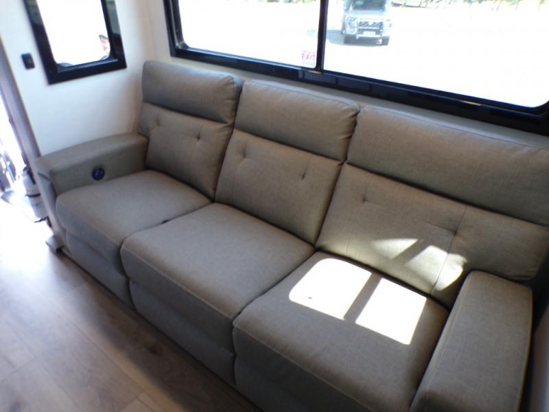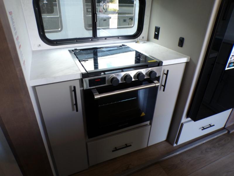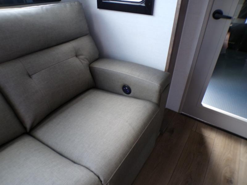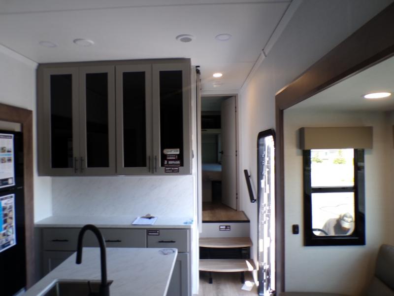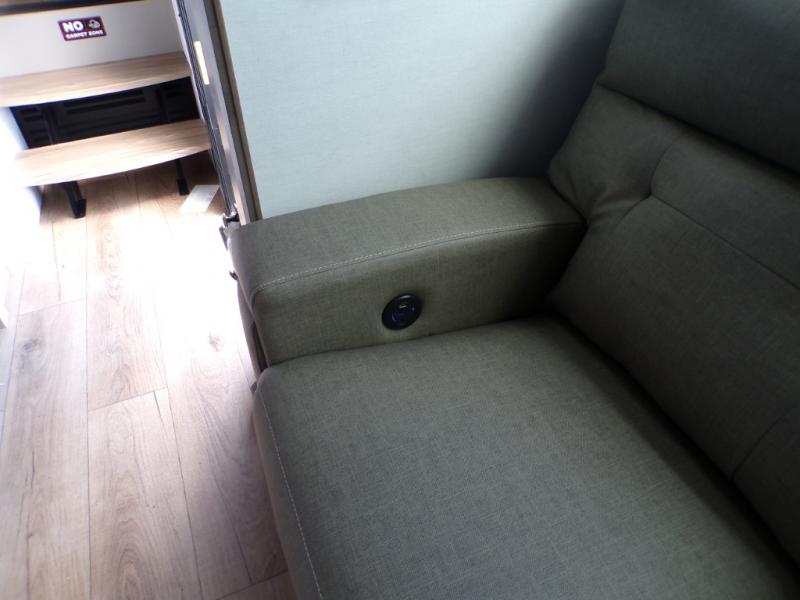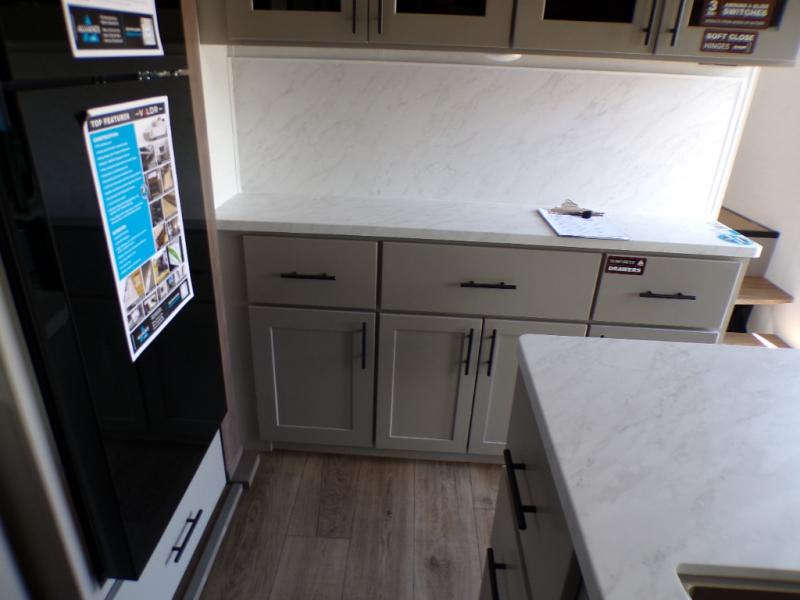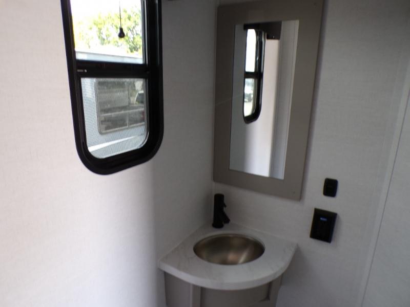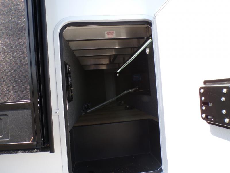 Load up the dirt bikes, pack your bags, and head to the campground in this spacious toy hauler. Once your toys are unloaded using the weather resistant ramp door, relax on the HappiJac roll-over sofas with a folding table in between, and this area can become your guests' bedroom at night since there is a drop-down queen bed, a half bath, plus an additional 30" x 72" bunk/loft bed. You will have the front bedroom all to yourselves that includes a king bed with an optional queen bed plus a wardrobe slide out to keep your space tidy. Everyone can meet in the main living area/kitchen for movie night with the HDTV and sofa slide out, while the chef of makes dinner on the three burner cooktop. There is also a hutch and pantry for storage and a kitchen island for more counter space!