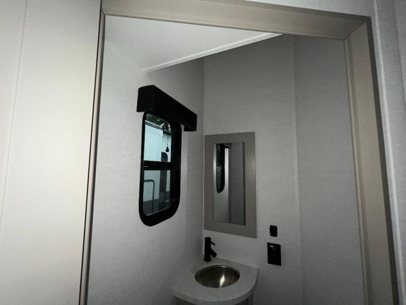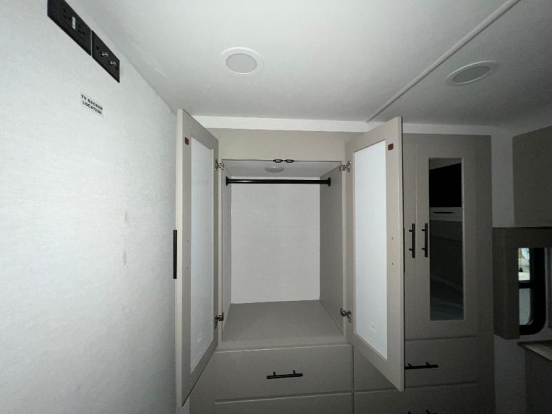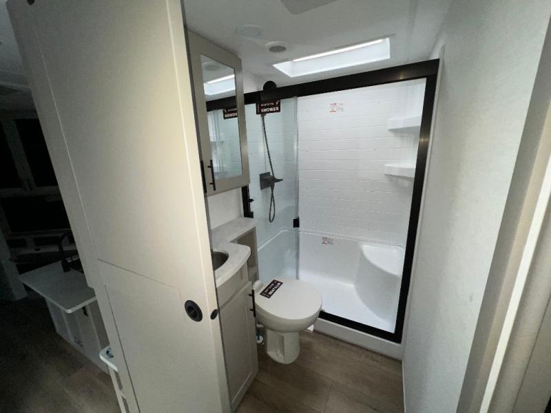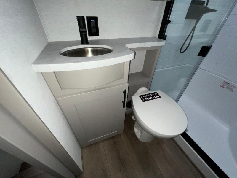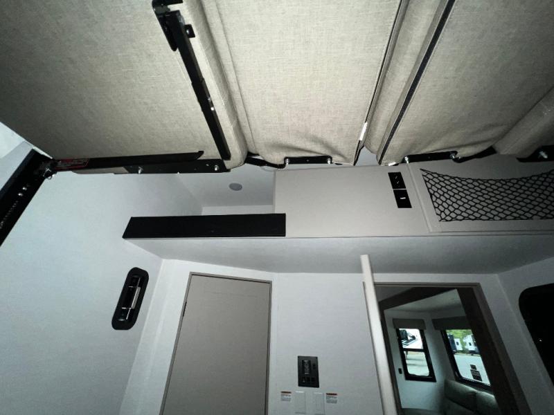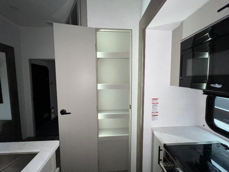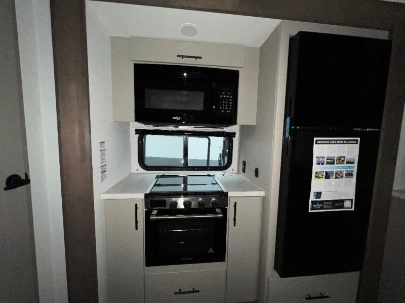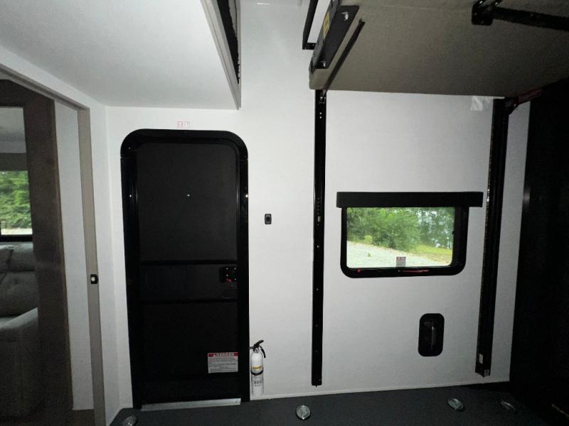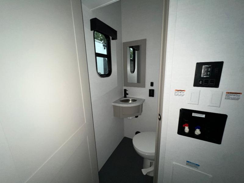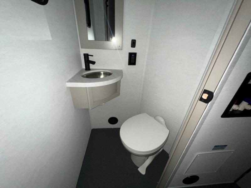 Load up the dirt bikes, pack your bags, and head to the campground in this spacious toy hauler. Once your toys are unloaded using the weather resistant ramp door, relax on the HappiJac roll-over sofas with a folding table in between, and this area can become your guests' bedroom at night since there is a drop-down queen bed, a half bath, plus an additional 30" x 72" bunk/loft bed. You will have the front bedroom all to yourselves that includes a king bed with an optional queen bed plus a wardrobe slide out to keep your space tidy. Everyone can meet in the main living area/kitchen for movie night with the HDTV and sofa slide out, while the chef of makes dinner on the three burner cooktop. There is also a hutch and pantry for storage and a kitchen island for more counter space!