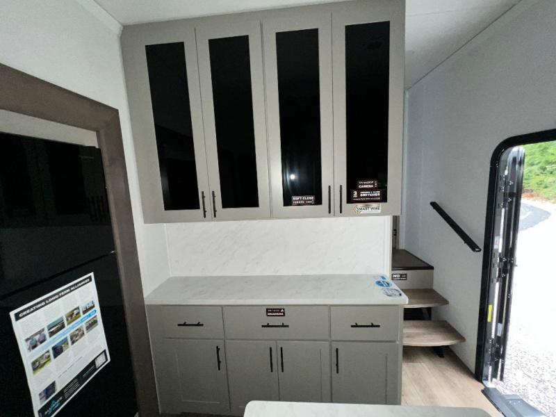 With any Valor All-Access toy hauler by Alliance RV you will be getting a travel trailer or fifth wheel with exceptional features at a great value! There is a painted fiberglass front cap, Mylar reinforced exterior seals, Azdel-backed fiberglass sidewalls, and a walk-on roof with a seamless PVC roof covering for added strength and durability. The 101" wide-body Benchmark chassis means you can bring along your larger toys, and the multipoint tie-down system will keep your toys safe and secure on the way to the campground. All of your power needs will be met with the Masters of 12 Volt Package that includes a 12V JBL sound system and USB charging stations throughout, plus the Off The Grid Pack comes with a 400 watt solar panel, 40 amp charge controller, and generator prep to keep you going all week long. Some of the interior comforts you'll enjoy are commercial grade vinyl flooring with no carpet so you can easily clean up, black cabinetry hardware, residential LED recessed ceiling lights, and so much more!